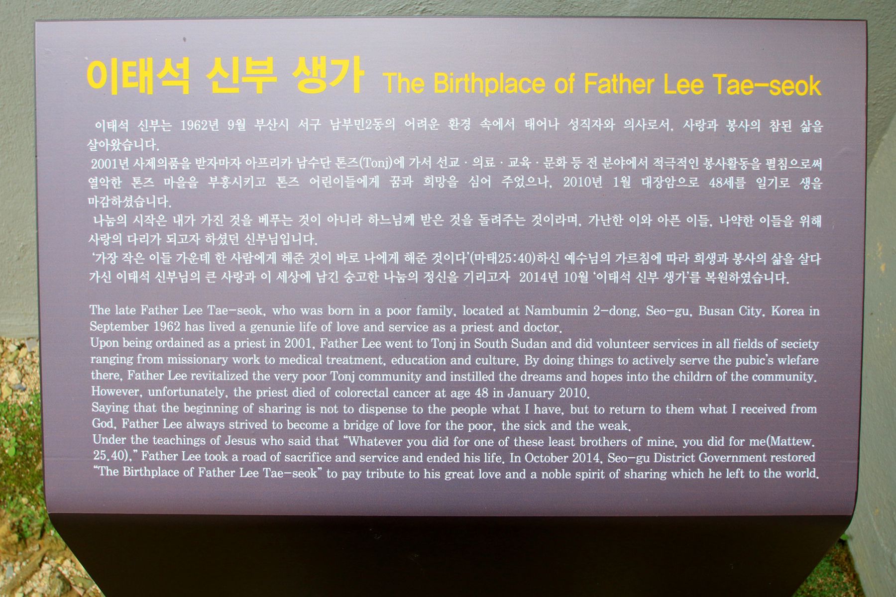 2010년 고 이태석 신부의 이야기를 다룬 다큐멘터리 '울지마 톤즈'가 만들어지면서 대중에 알려지게 되었습니다.