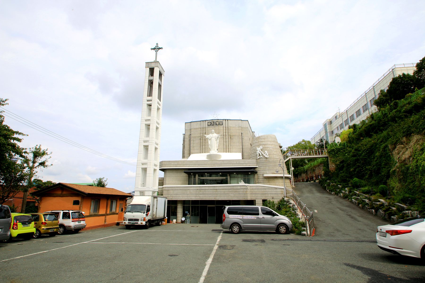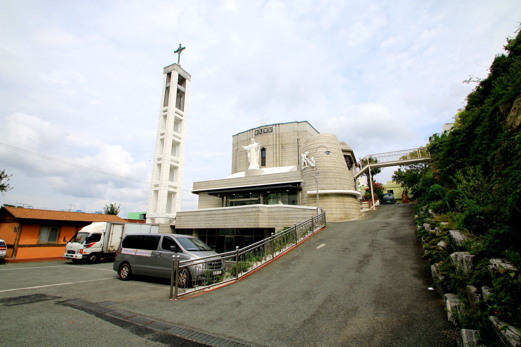 송도성당은 마당에 십자가의 길과 열 세 사도 조각상, 성모 마리아상이 모셔져 있고,