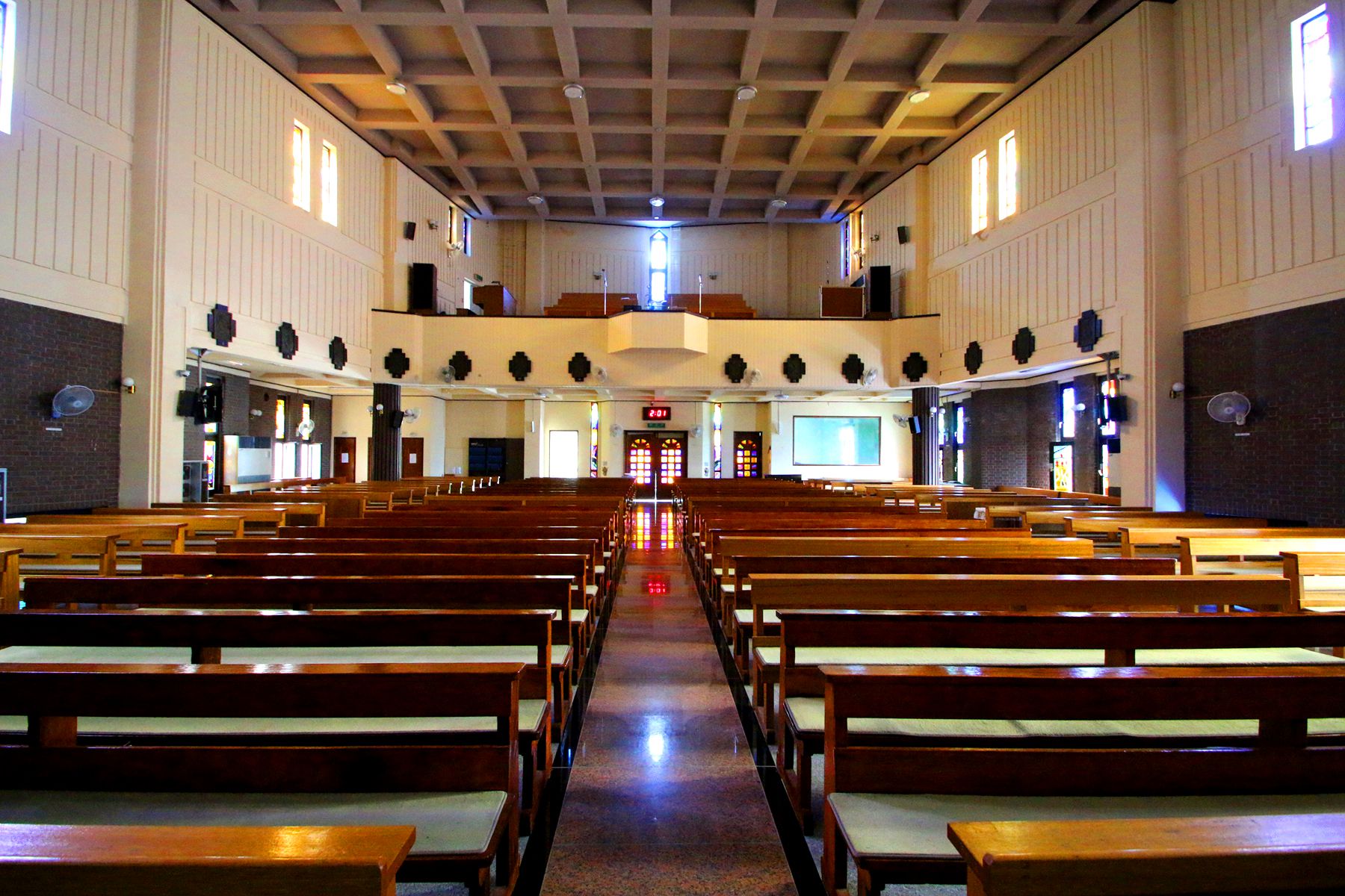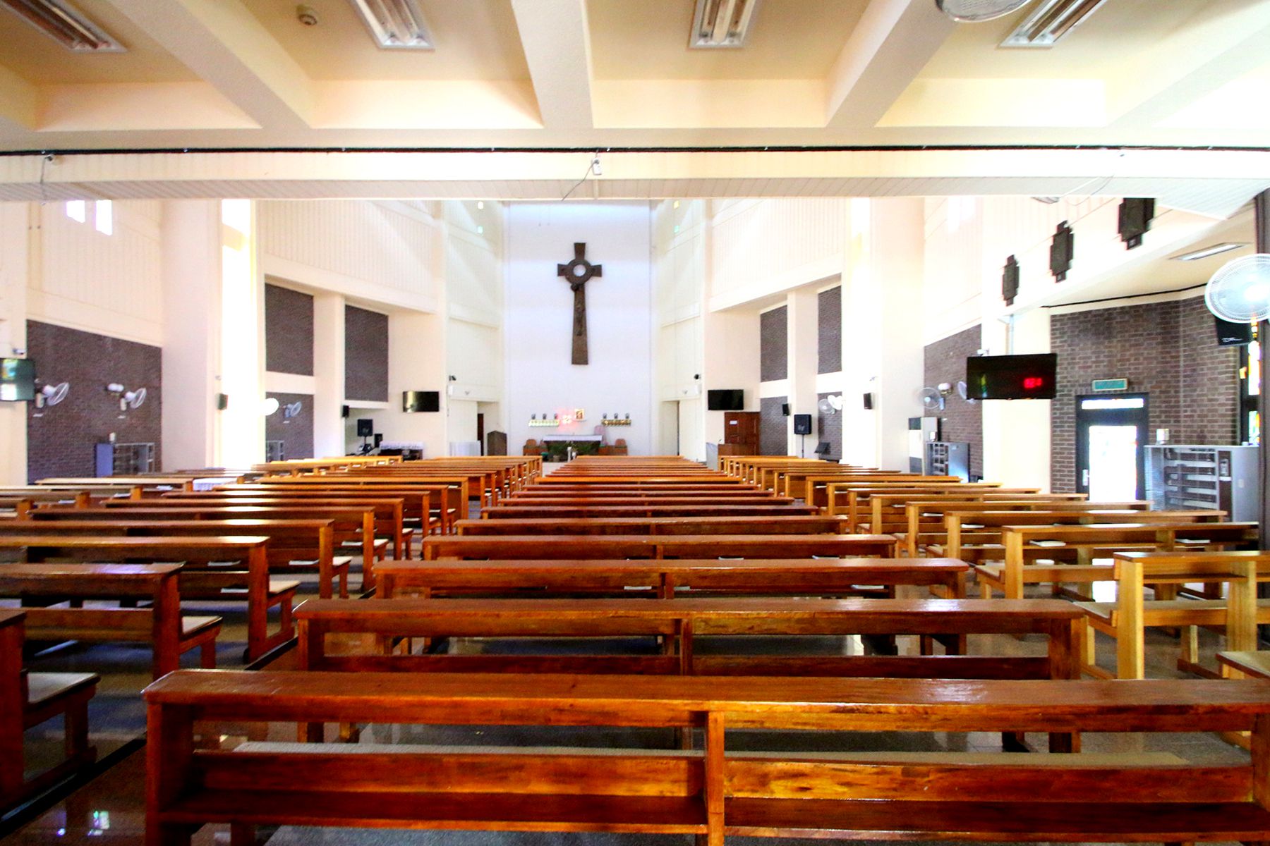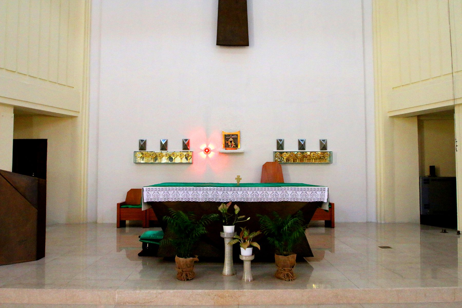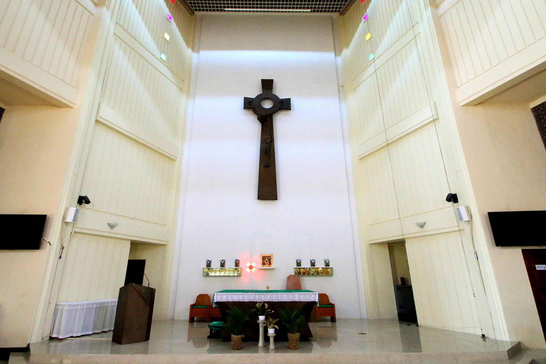 독특한 디자인의 십자가와 신부님이 미사를 봉헌하는 제대가 인상적입니다.