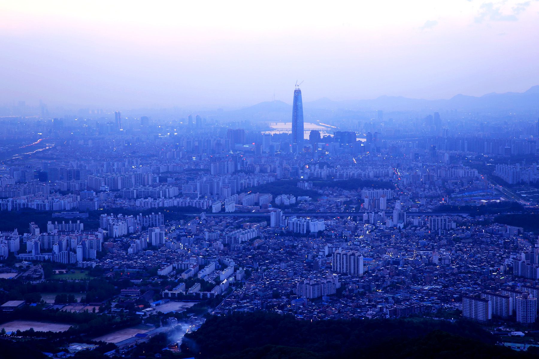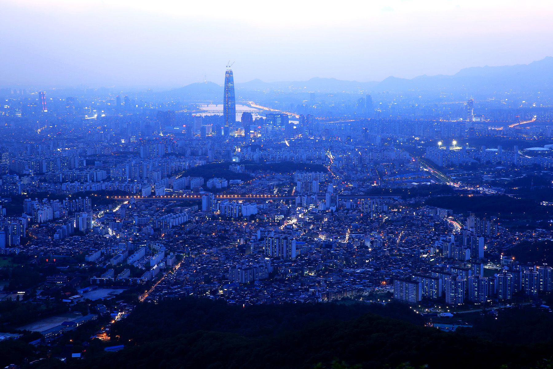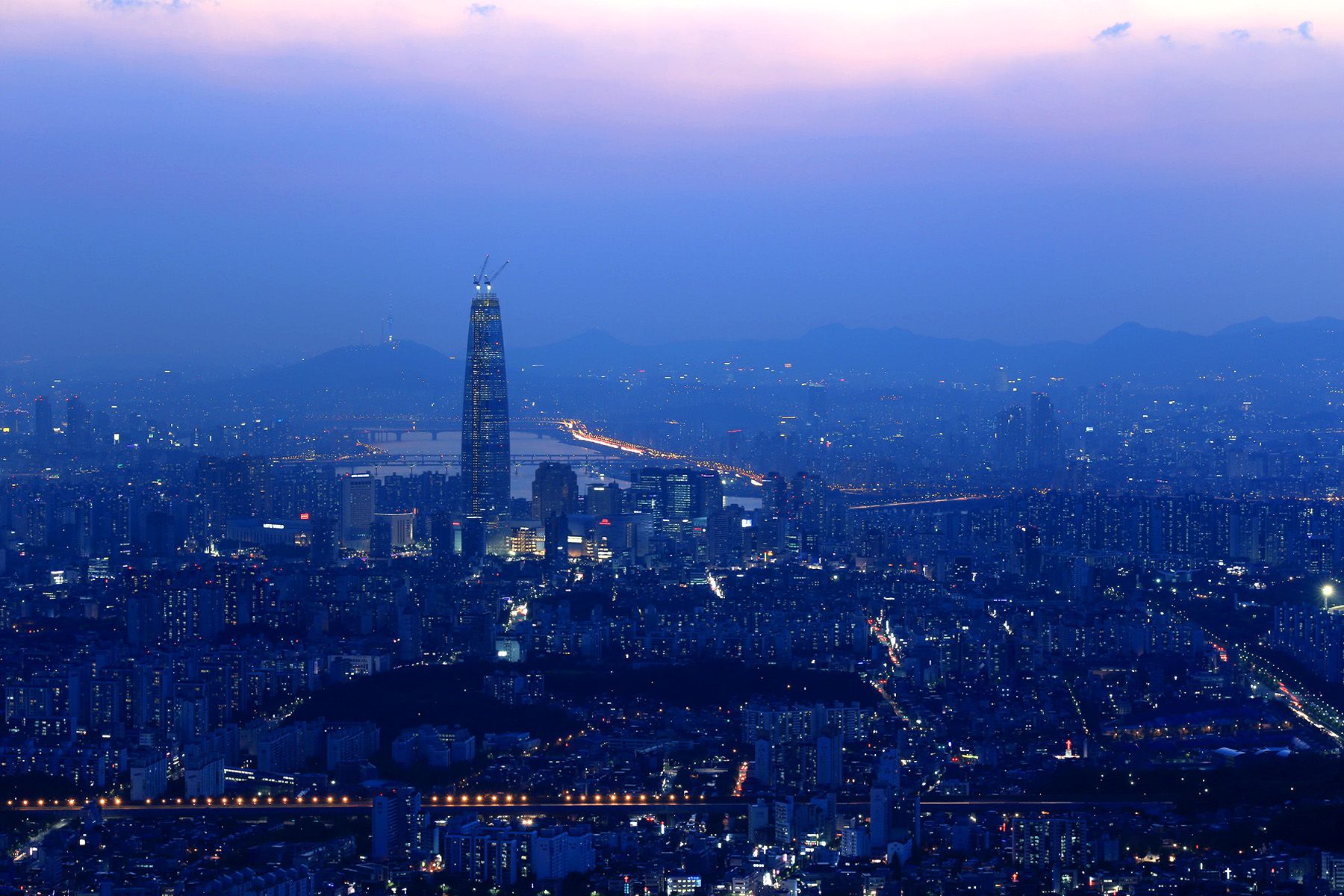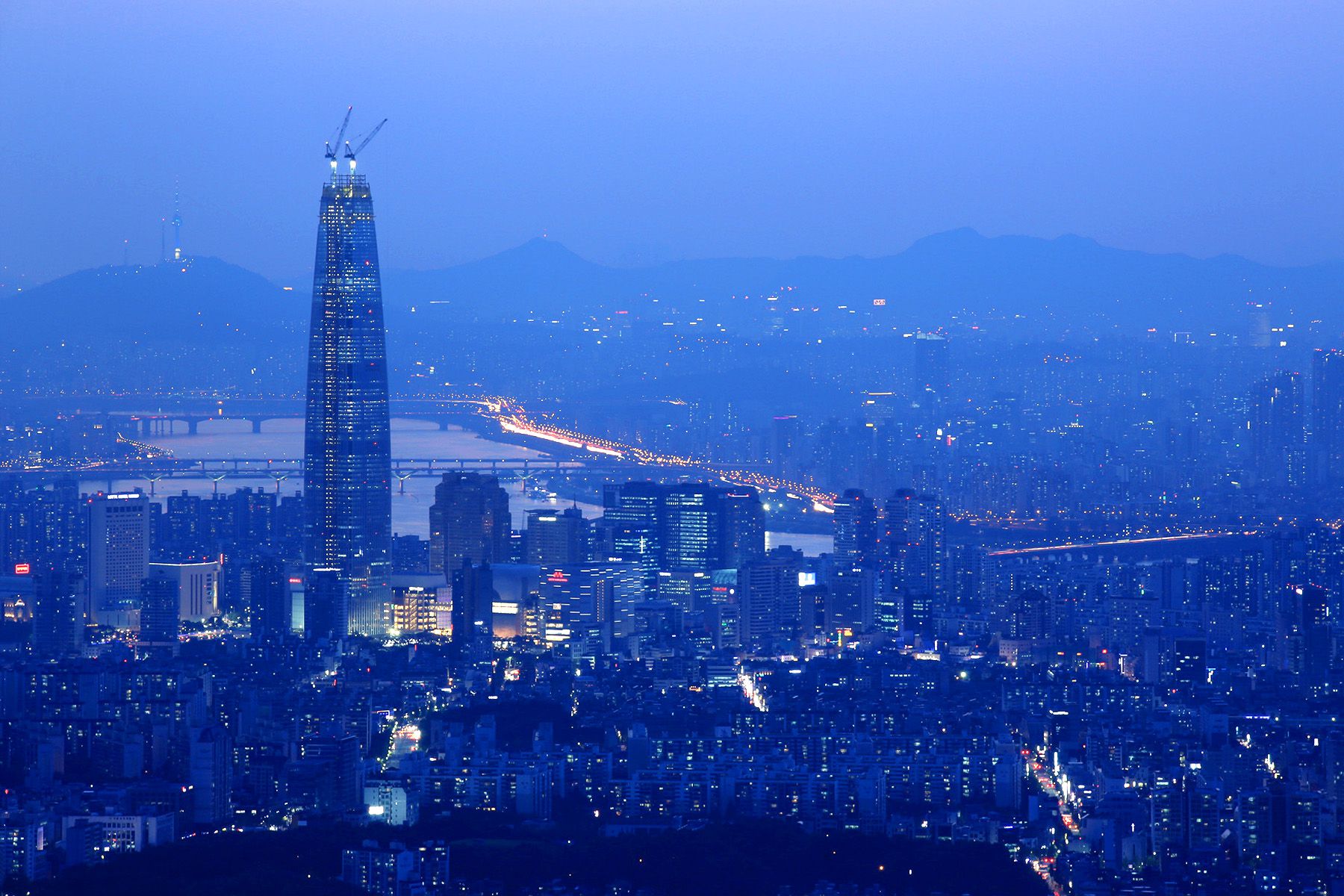 아직 완공되지 않은 제2 롯데월드의 모습이 두드러지고,