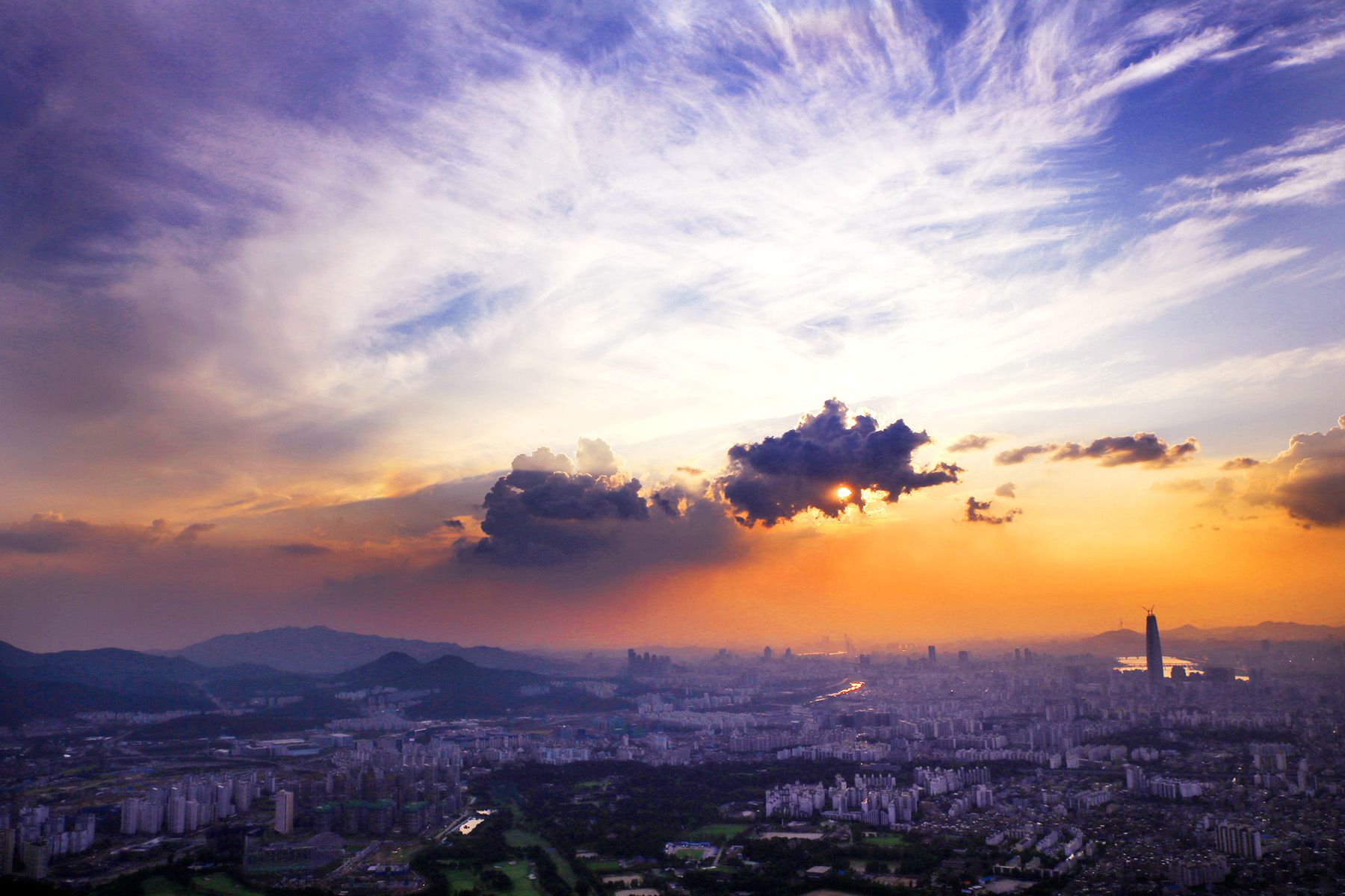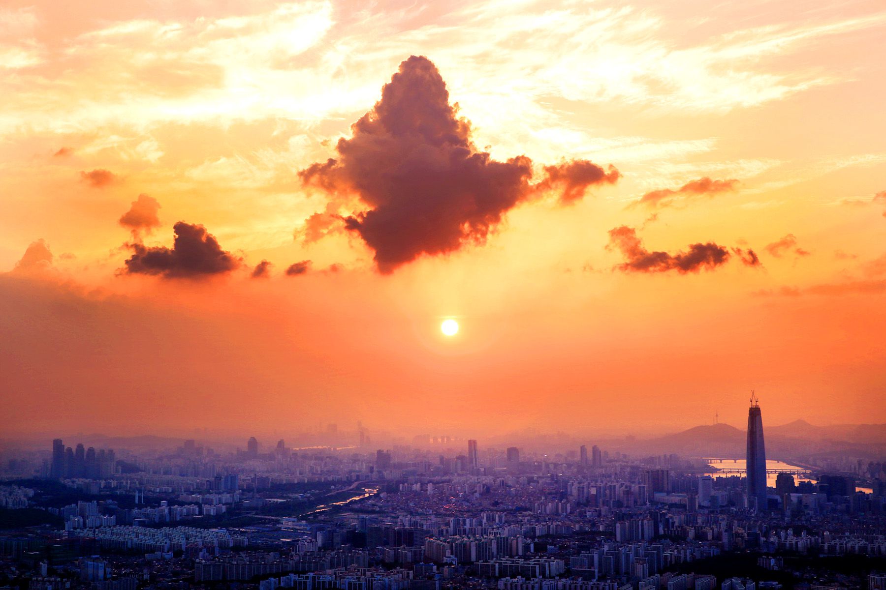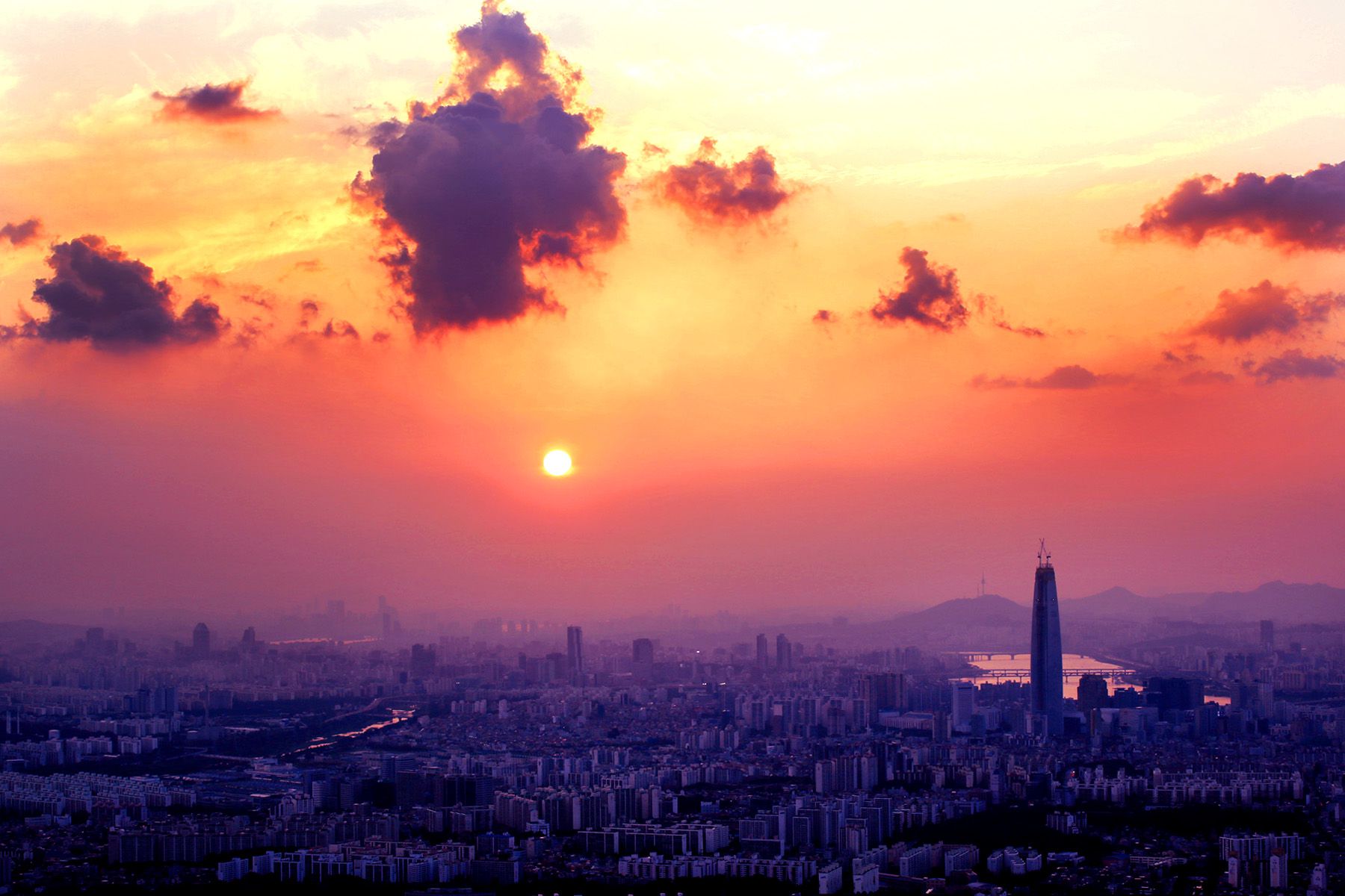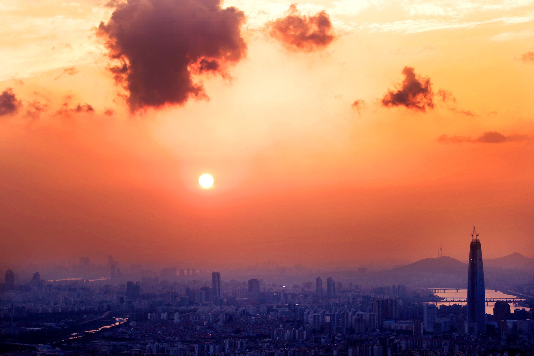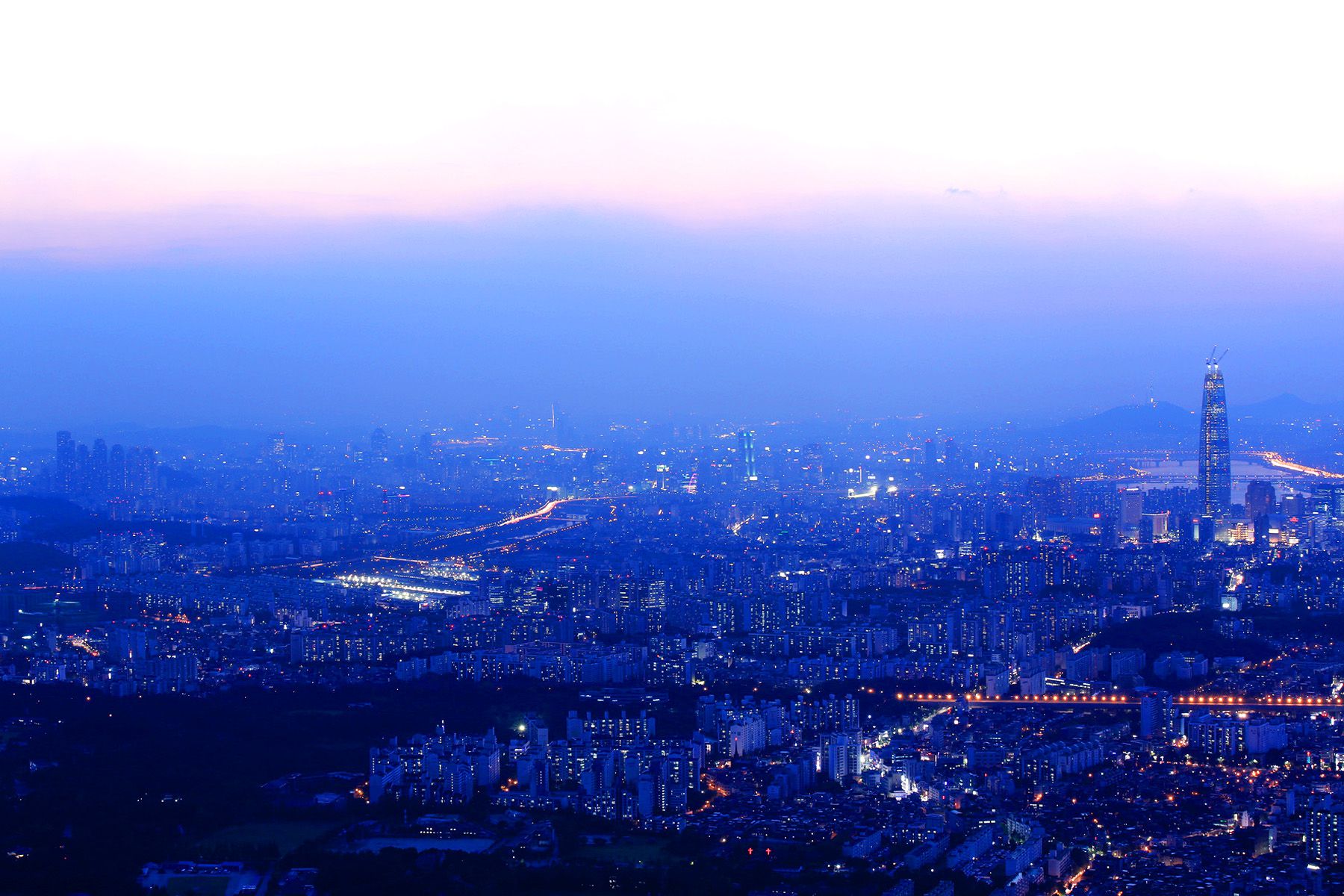 아직 완공되지 않은 제2 롯데월드의 모습이 두드러지고,