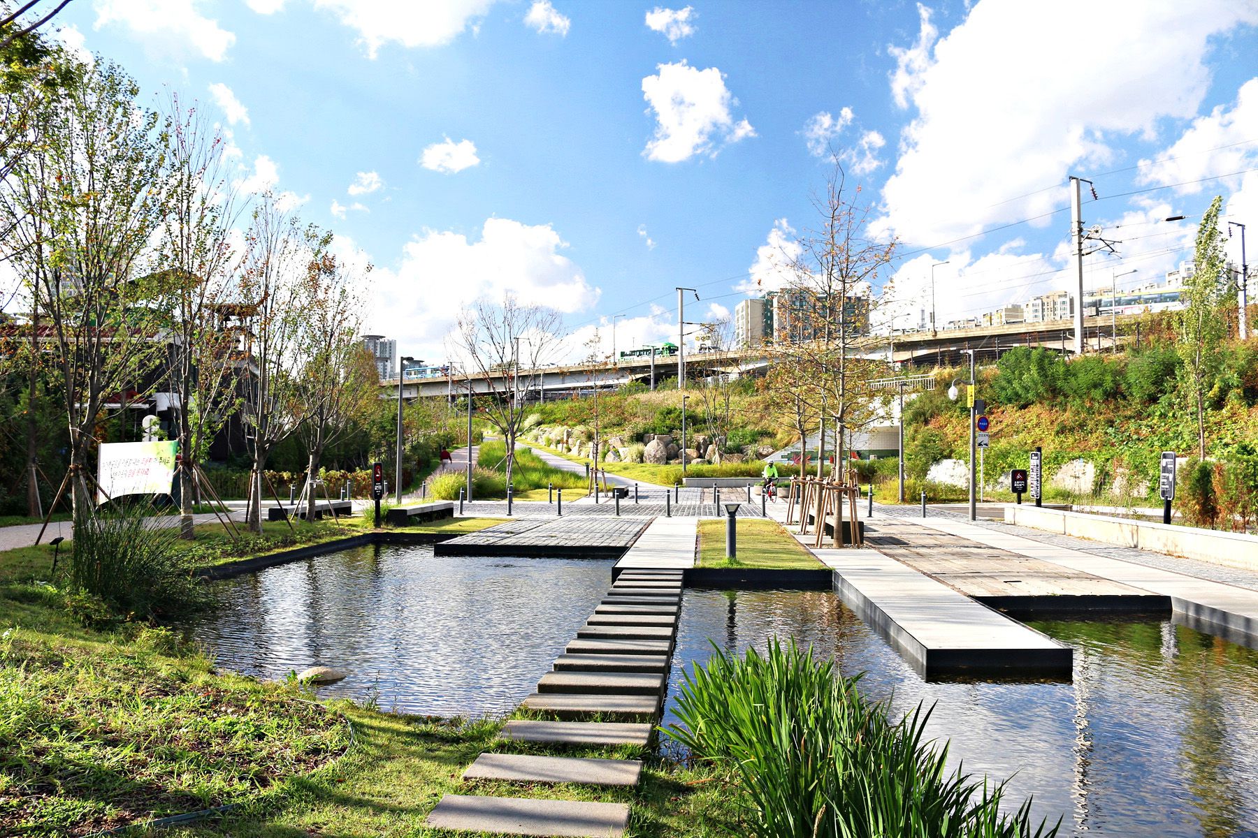 폐철도 노선을 따라서 도심속에 길게 뻗은 숲길이기에 더욱 의미가 있으며 중간중간 실개천이 흐르고 연못도