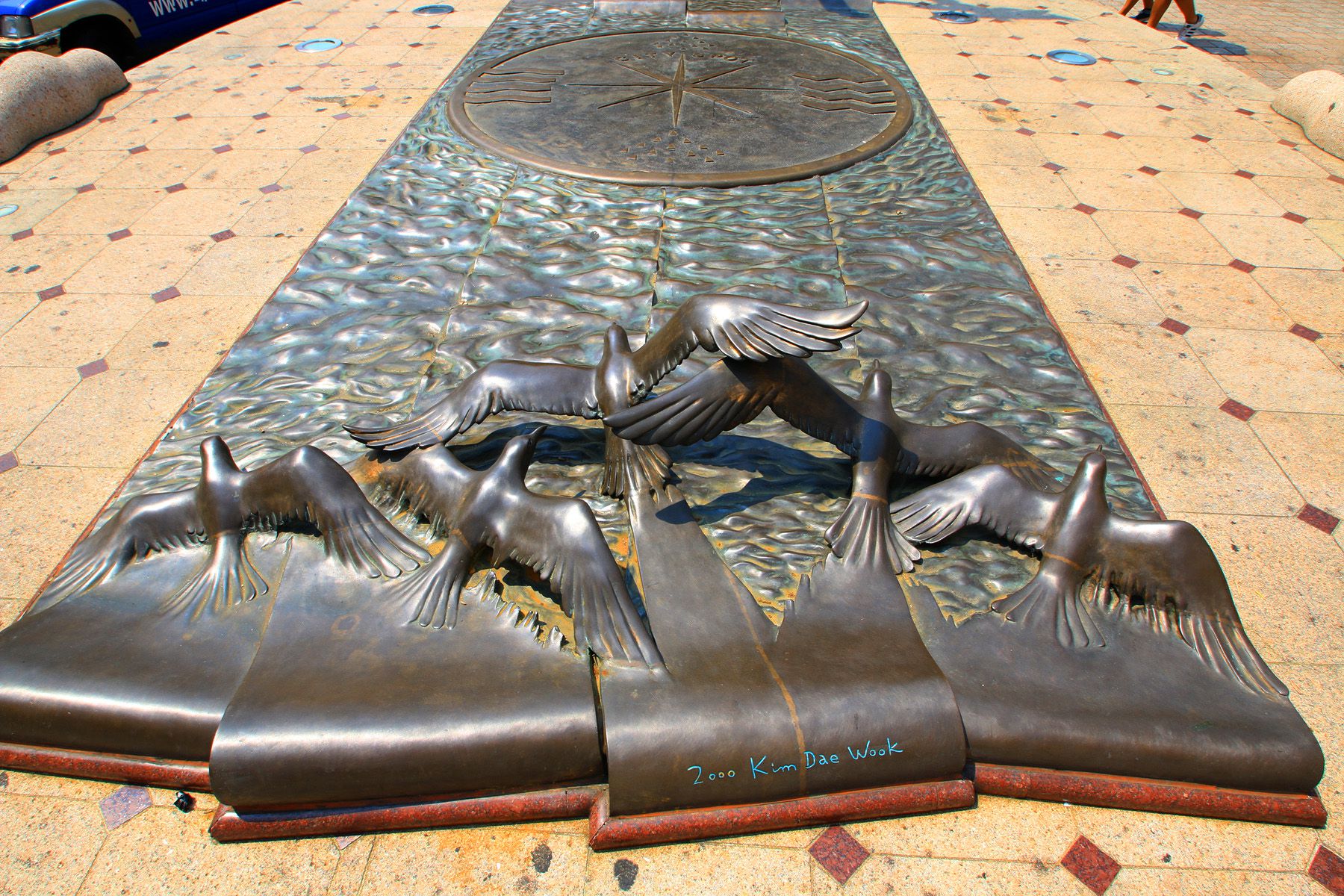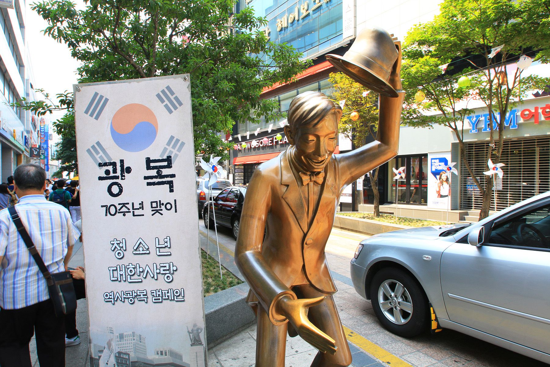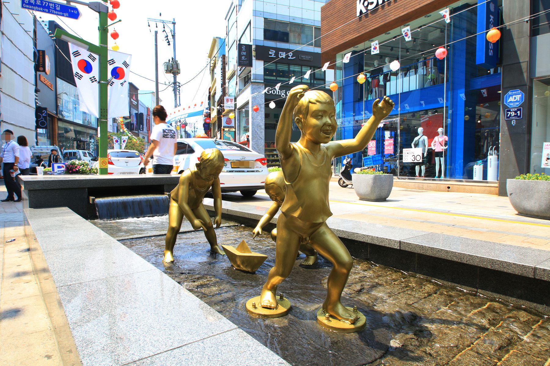 광복로에 조성되어 있는 잔잔한 수로를 따라 다양한 조형물이 설치되어 있습니다.