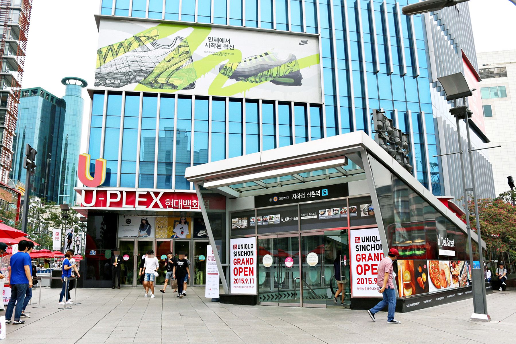 연세로 한가운데에 위치한 현대백화점 U-PLEX는 2009년 생긴 이래로