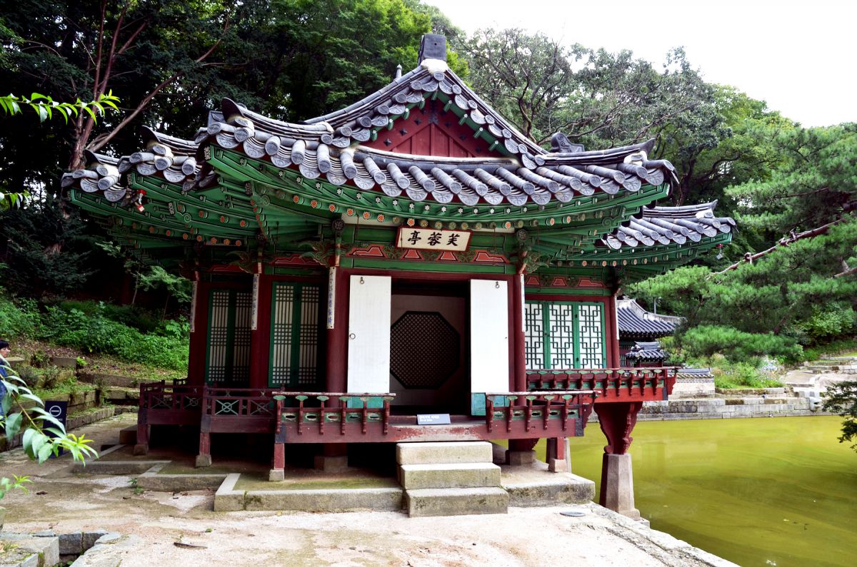 이곳은 후원에 있는 열십자 모양의 독특한 평면 형태, 공간구성, 건물의 장식 등이 뛰어난 비례와 대비를 이루고 있는 부용정입니다.