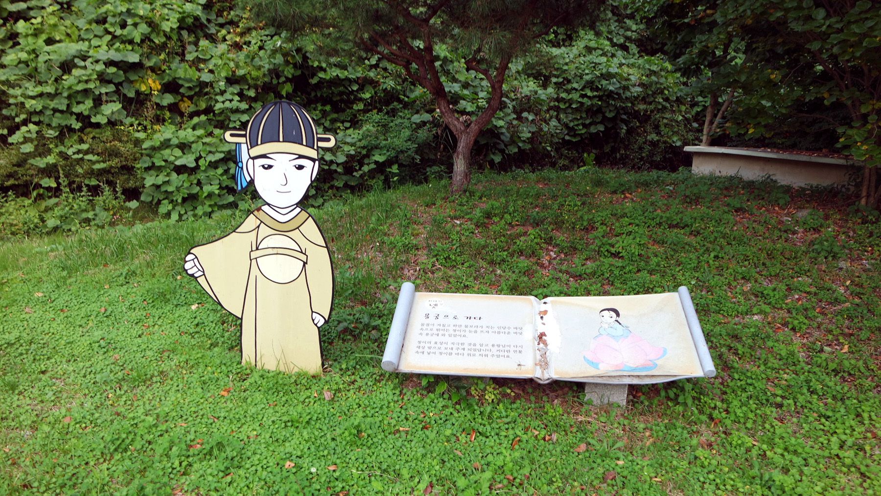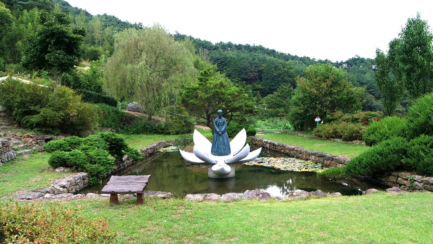 인공 연못 위에선 연꽃을 타고 육지로 올라온 심청의 모습을 형상화한 동상을 만나 볼 수 있습니다.