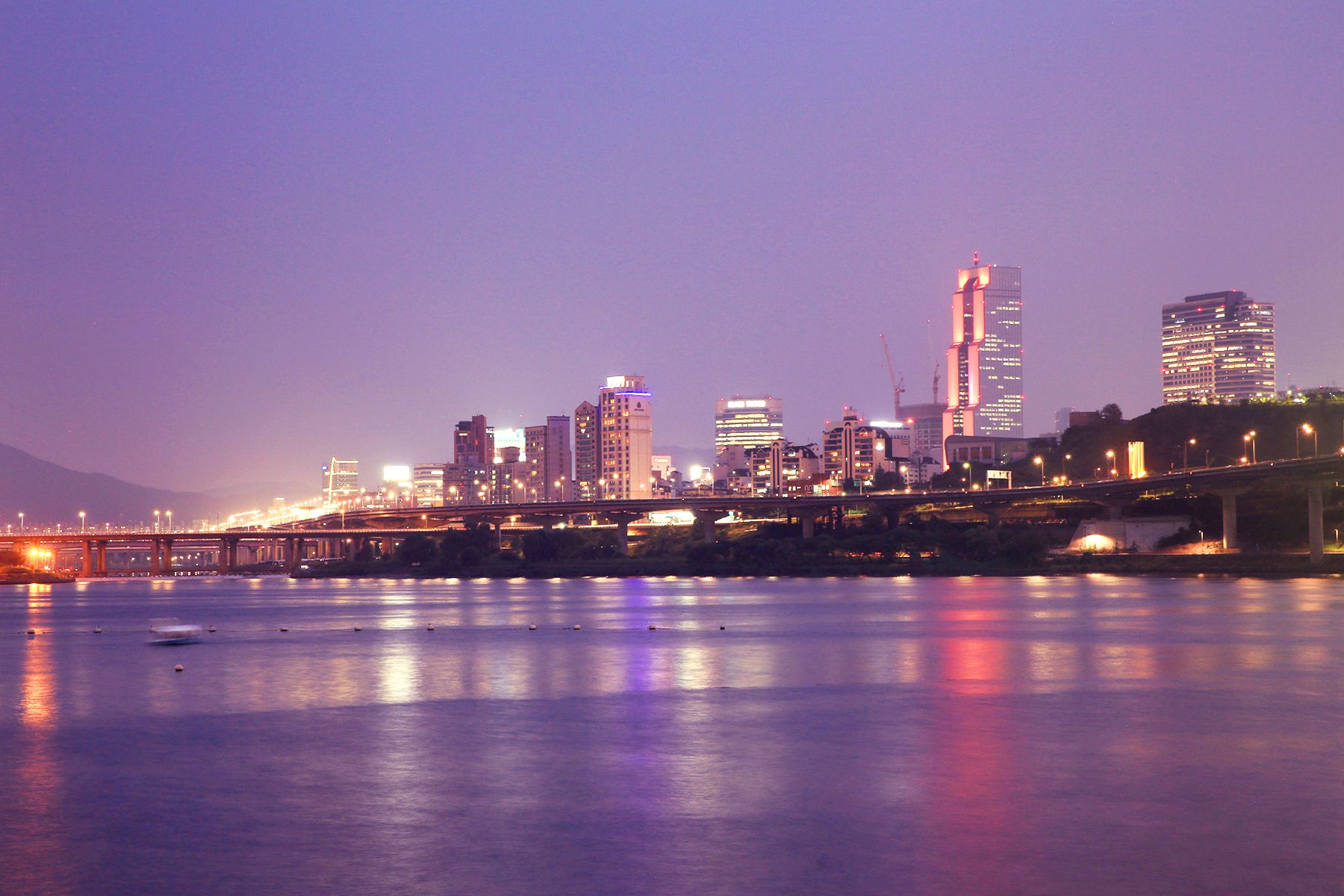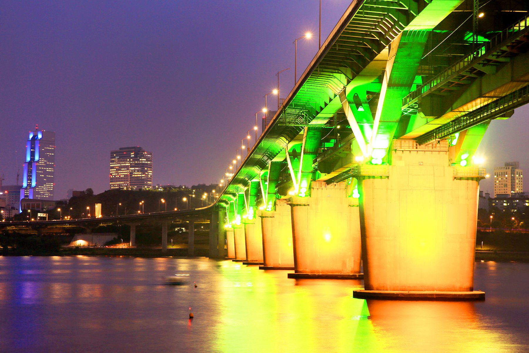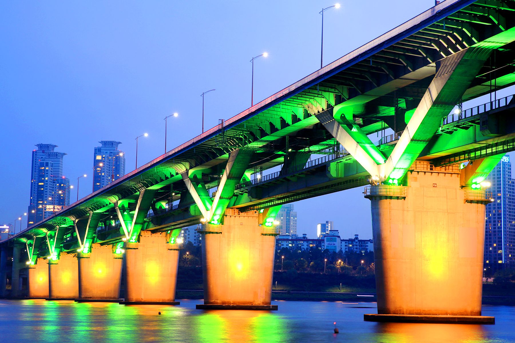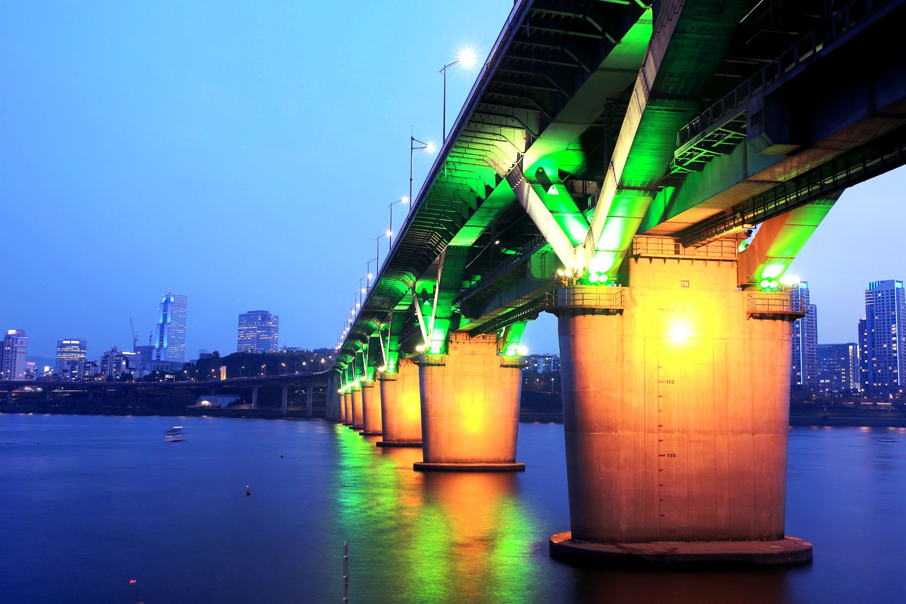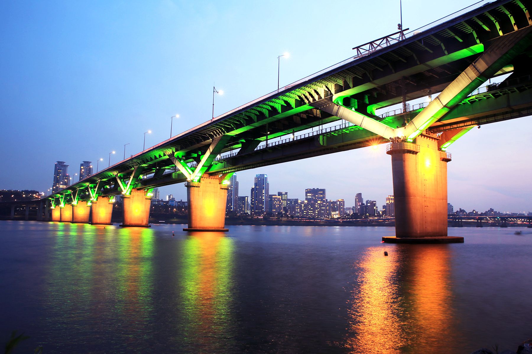 화려한 청담대교 조명과 그 조명이 잔잔한 한강물에 비춰져 황홀한 밤의 아름다움을 자랑하고 있습니다.