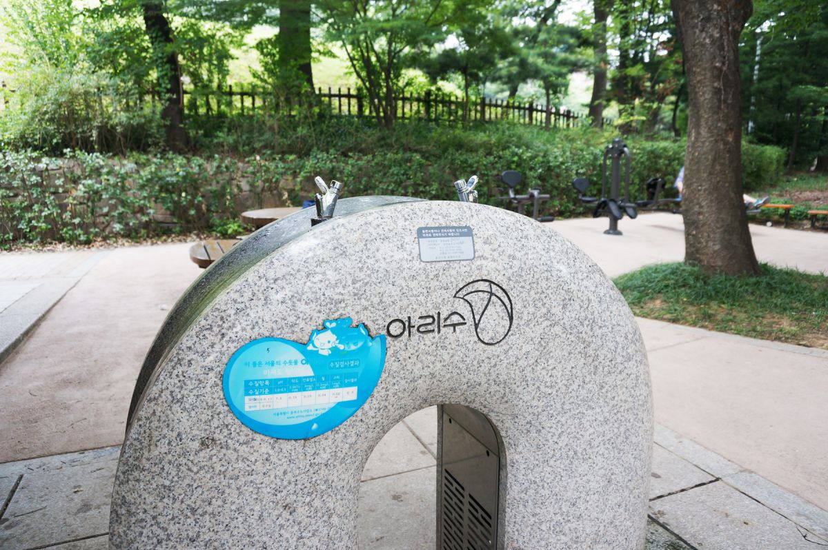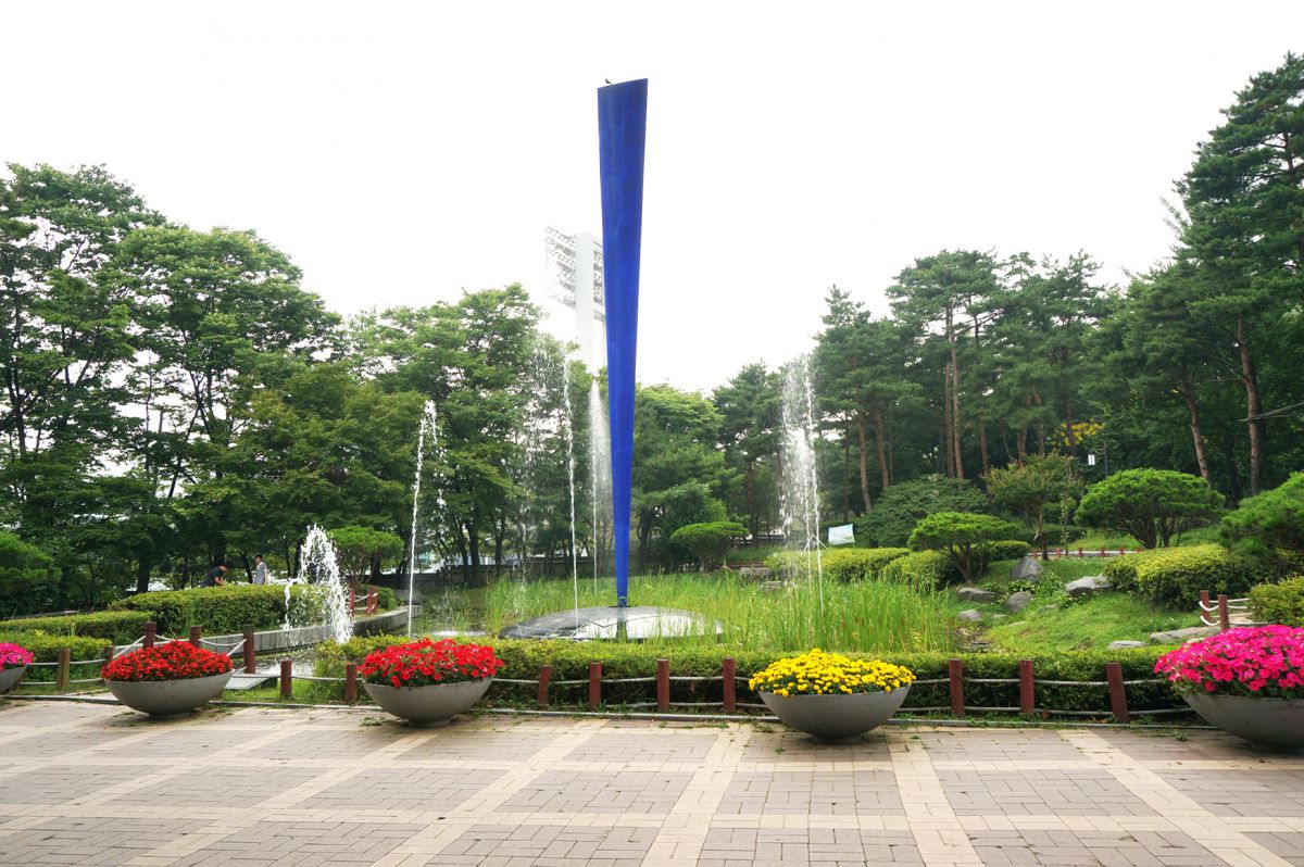 효창공원 중앙에 자리한 파란 조형탑과 시원한 분수는 공원을 찾는 분들께
