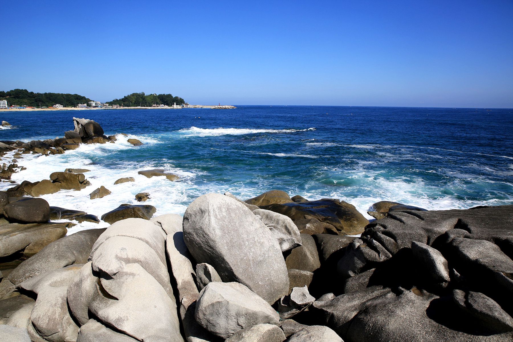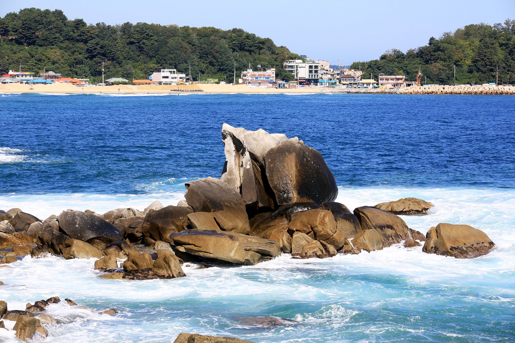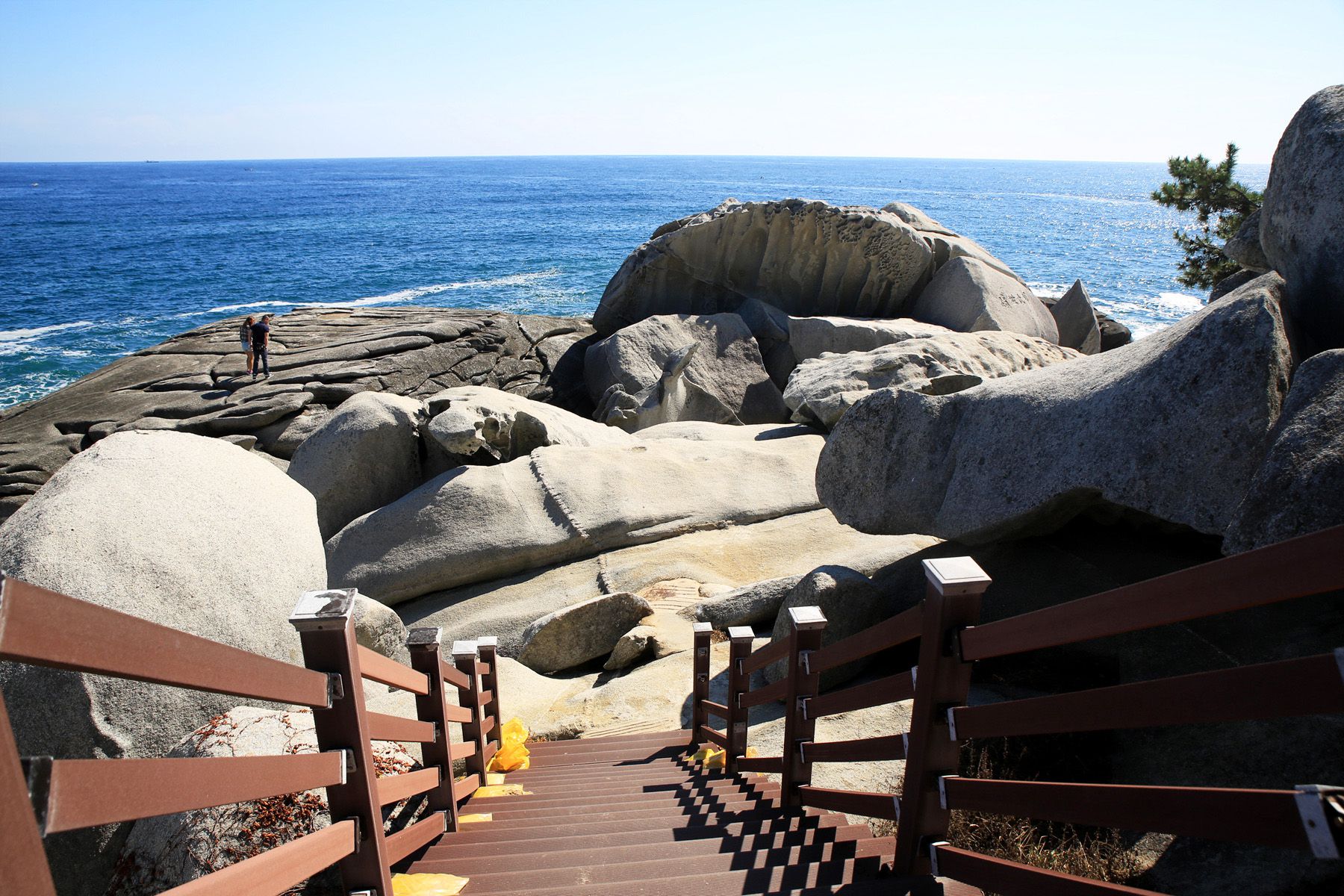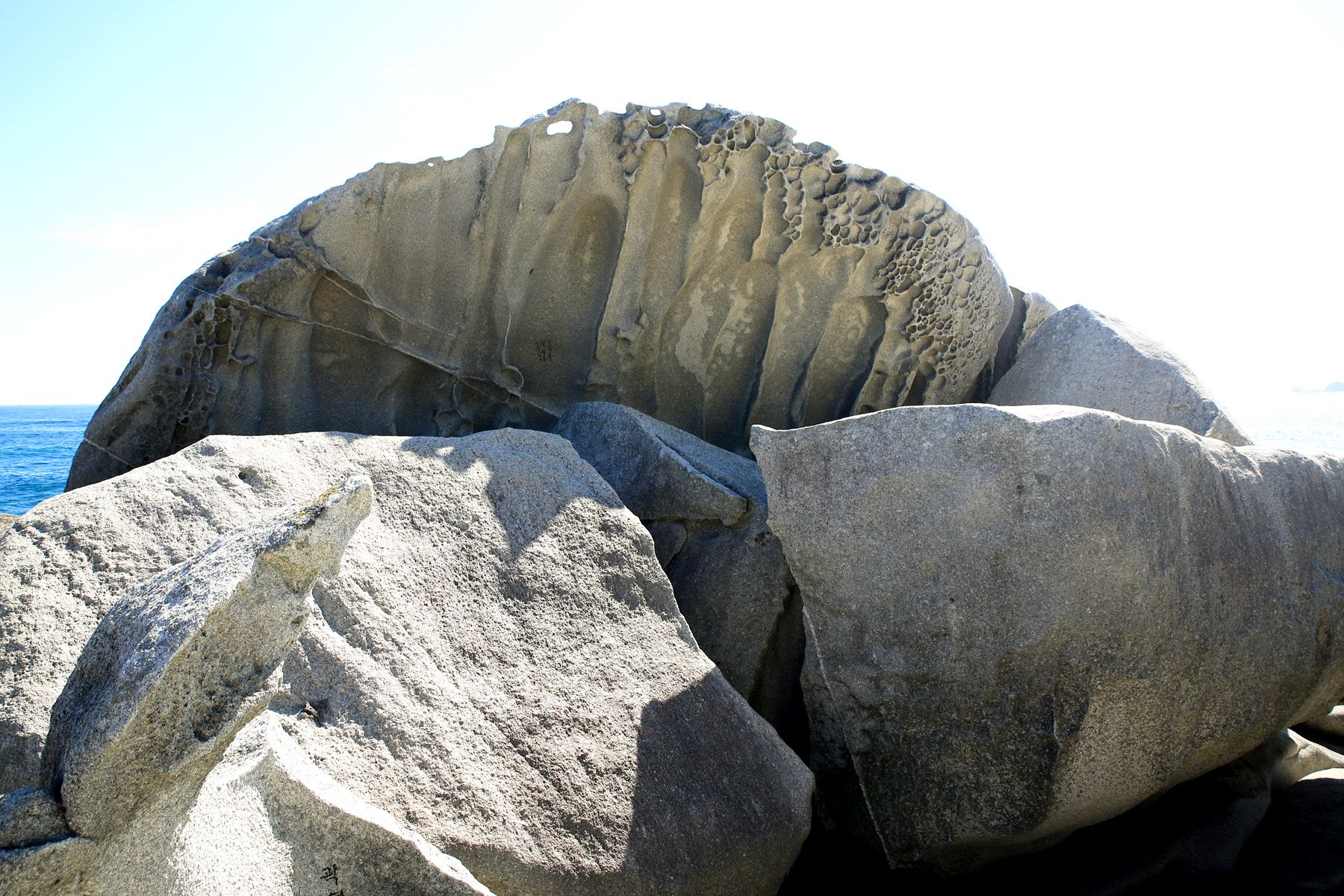 파도의 풍화과정을 거친 둥글둥글 표면의 거대한 바위는 자연이 만들어준
