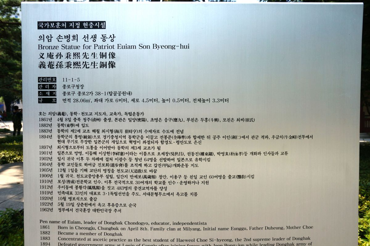 민족대표 33인 중에서 제일 먼저 이름을 올리신 손병희 선생의 동상입니다.