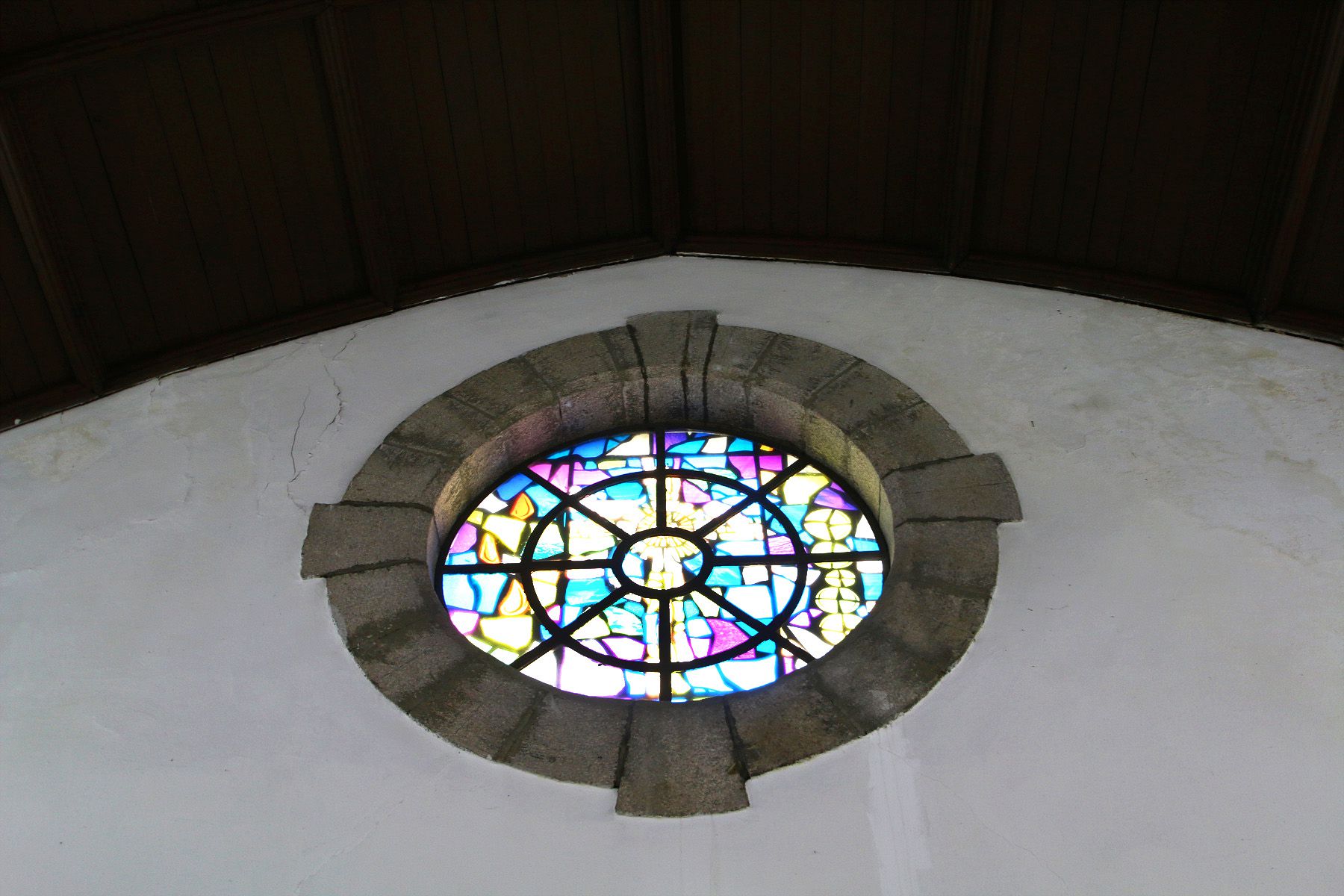 오래되어 빛바랜 스테인드글라스에서 세월의 흔적을 만날 수 있습니다.
