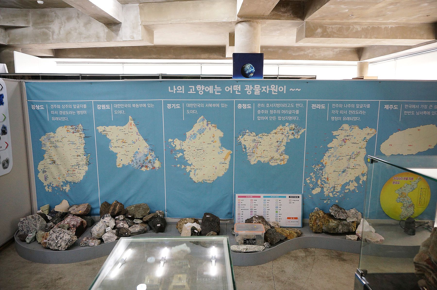 52개 주요 광물 생산국가에서 수집된 200여 종의 광물이 전시되어 있습니다.