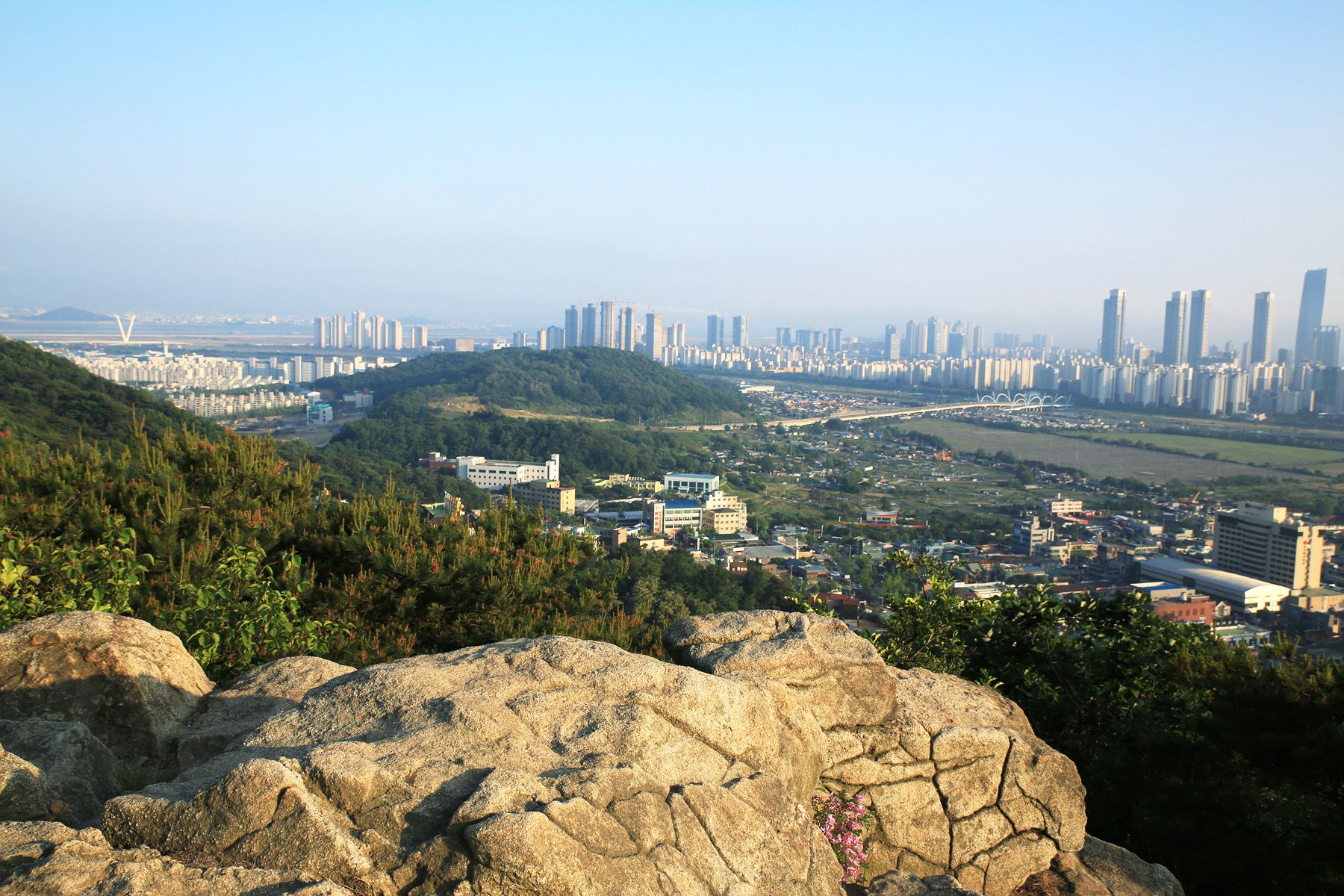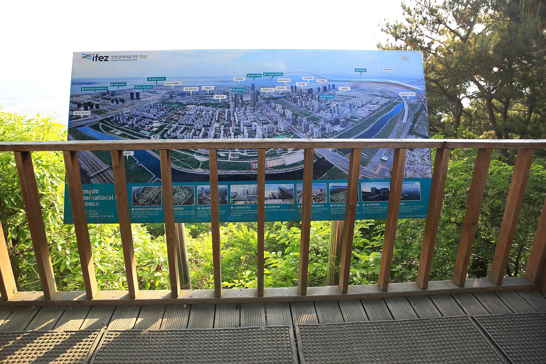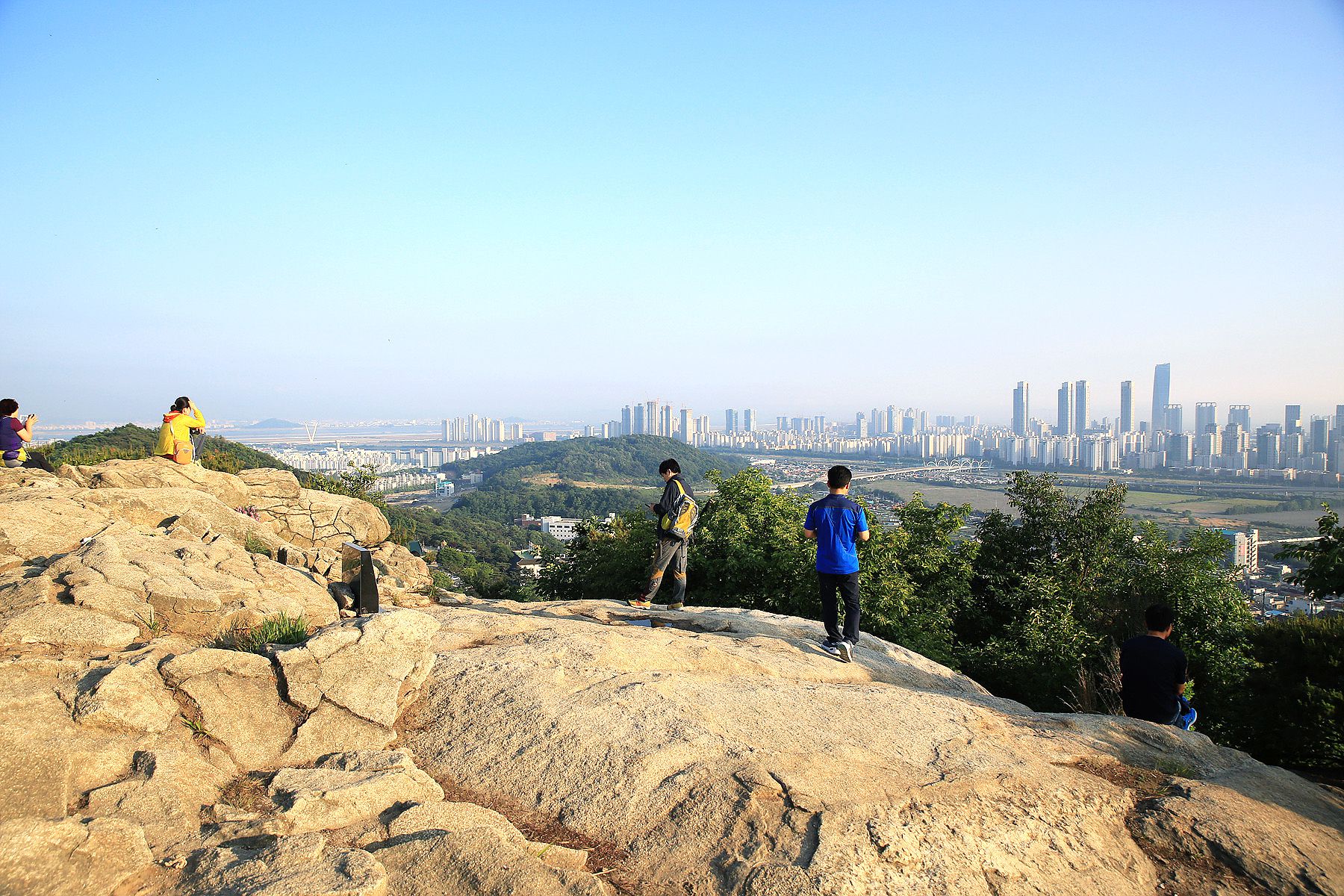 정상에서는 송도 신도시와 인천대교를 한눈에 조망할 수 있습니다.