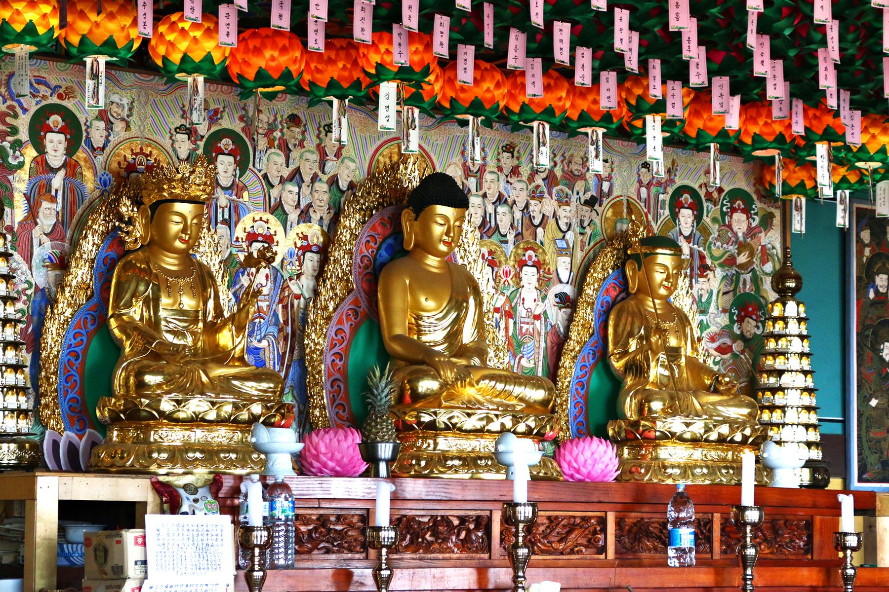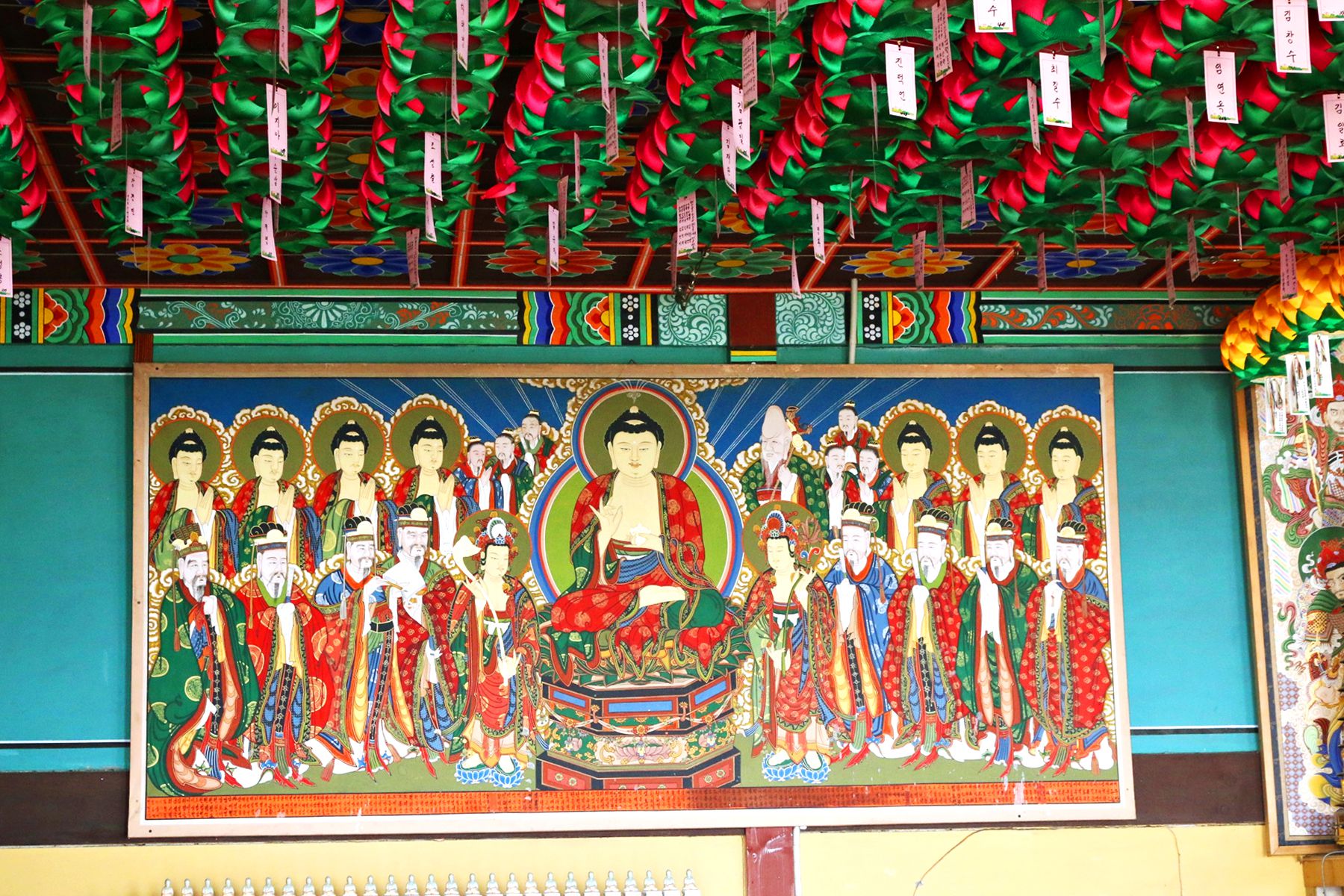 대웅전 안에는 석가모니불과 관세음보살 지장보살이 모셔져 있고