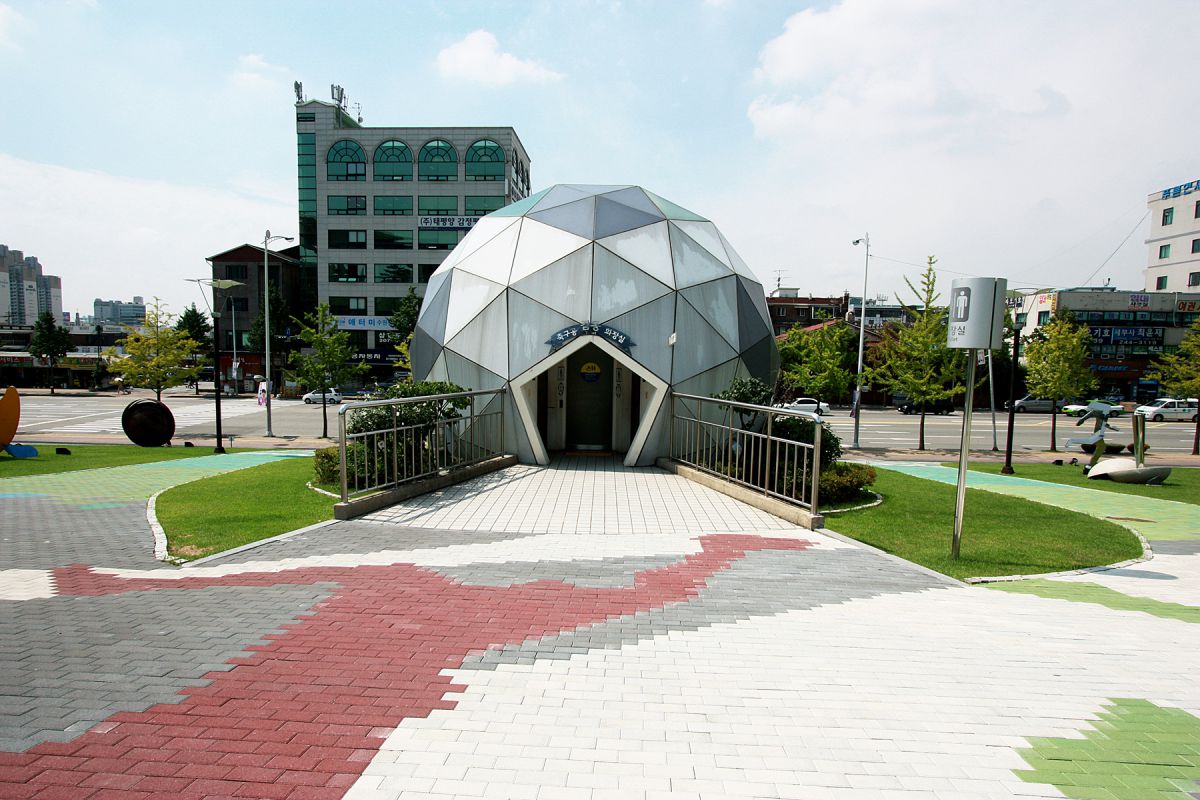 예술작품 속에 섞여있는 축구공 모양의 건축물은 바로 화장실입니다.