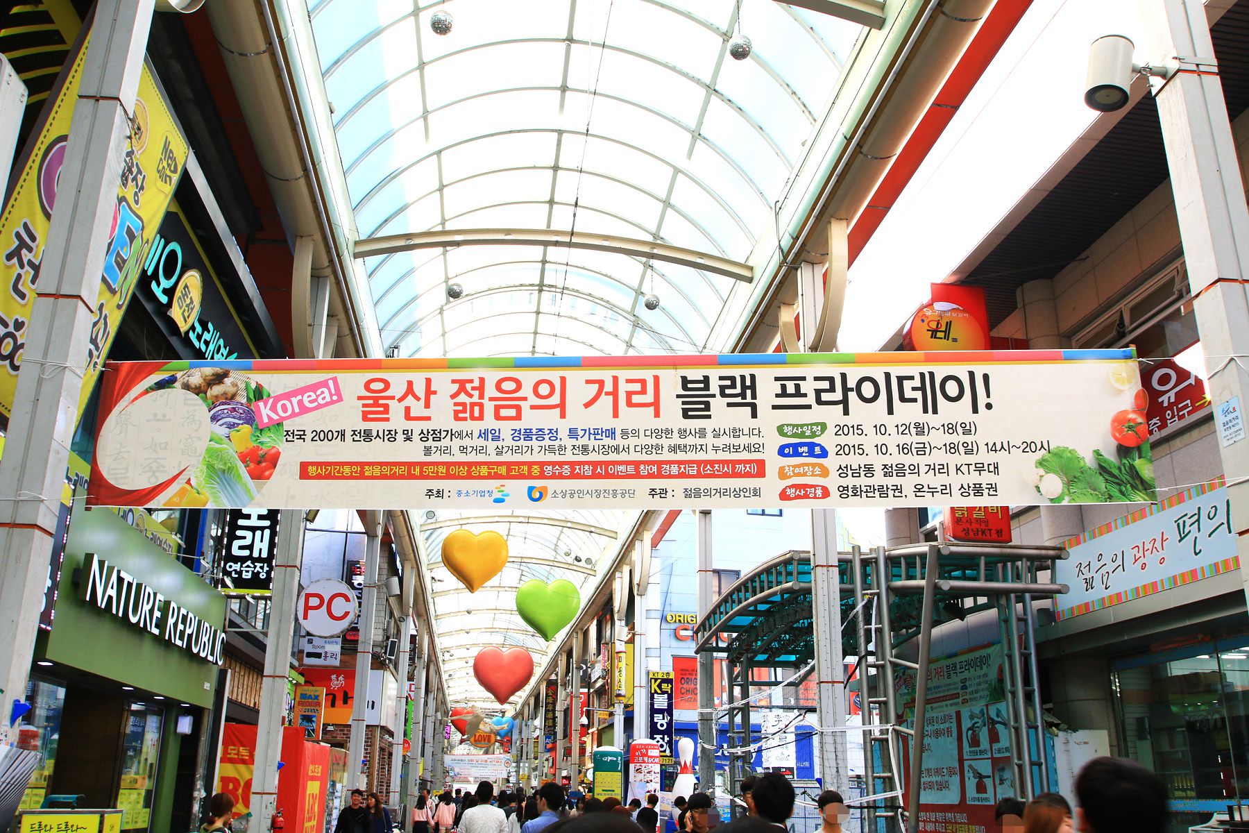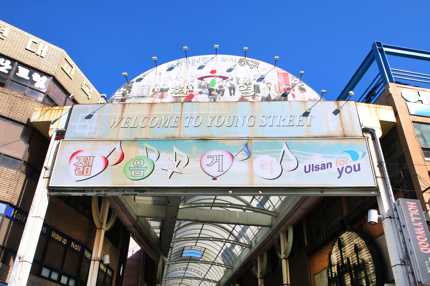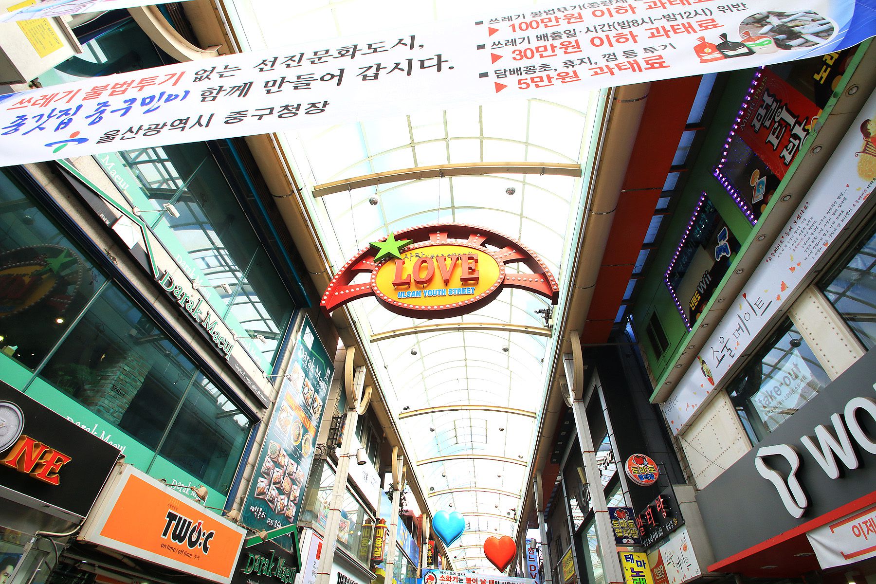 울산의 명물로 자리 잡고 있는 젊음의 거리에는 전국에서 유일하게 740여 미터에 이르는 아케이드를 만날 수 있는 곳입니다.