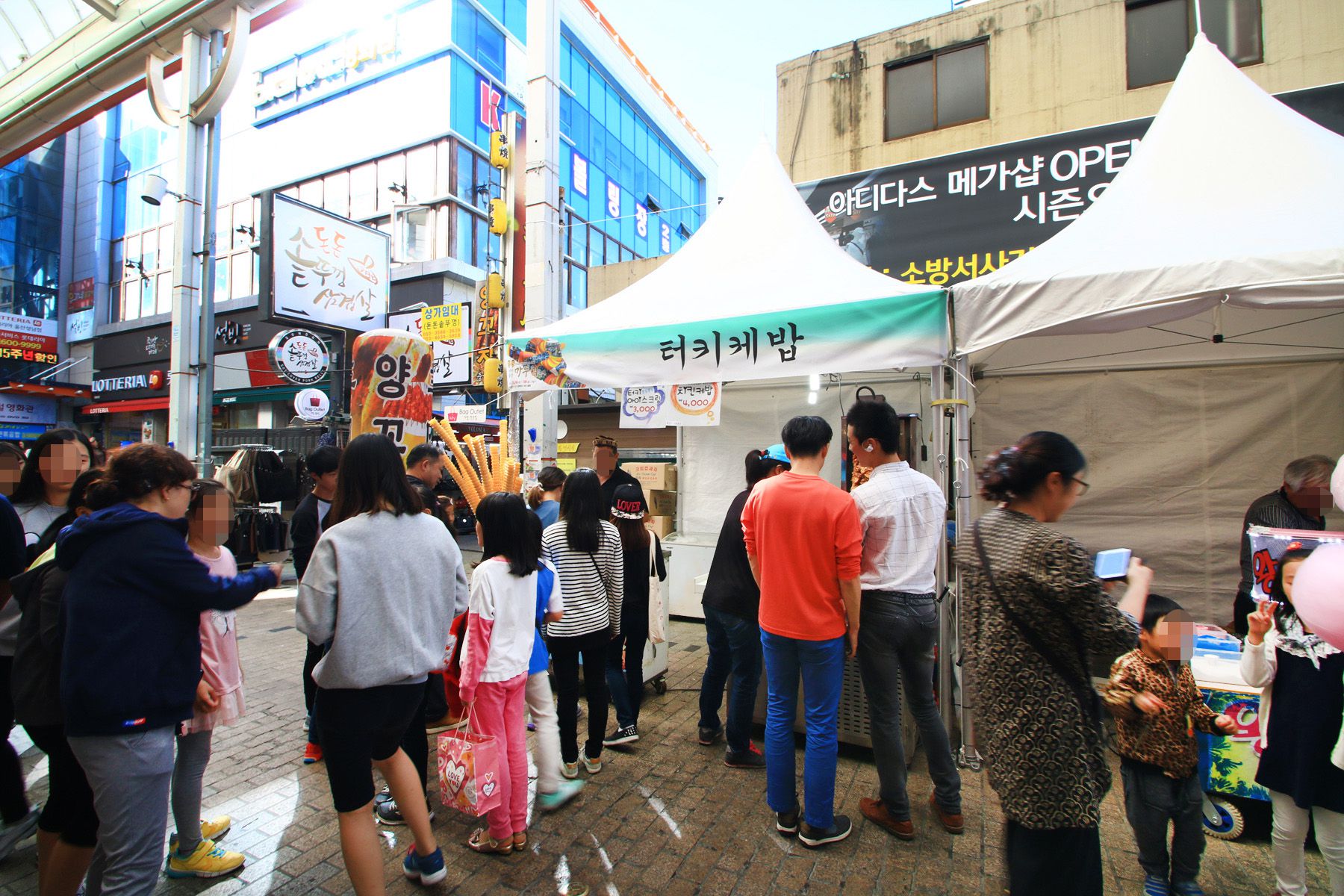 젊음의 거리 먹자골목에 들어서면 길거리 음식이 즐비해 있어