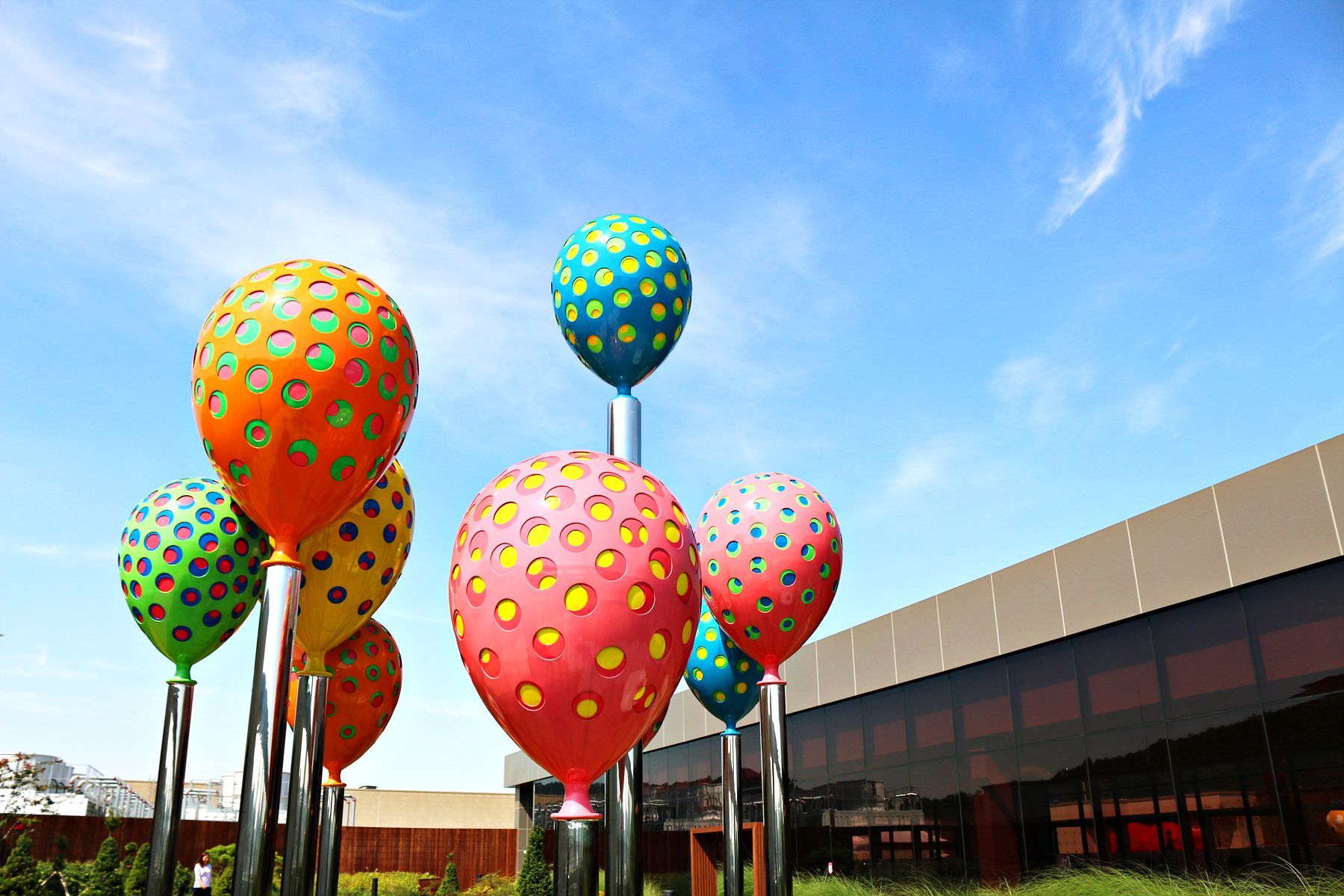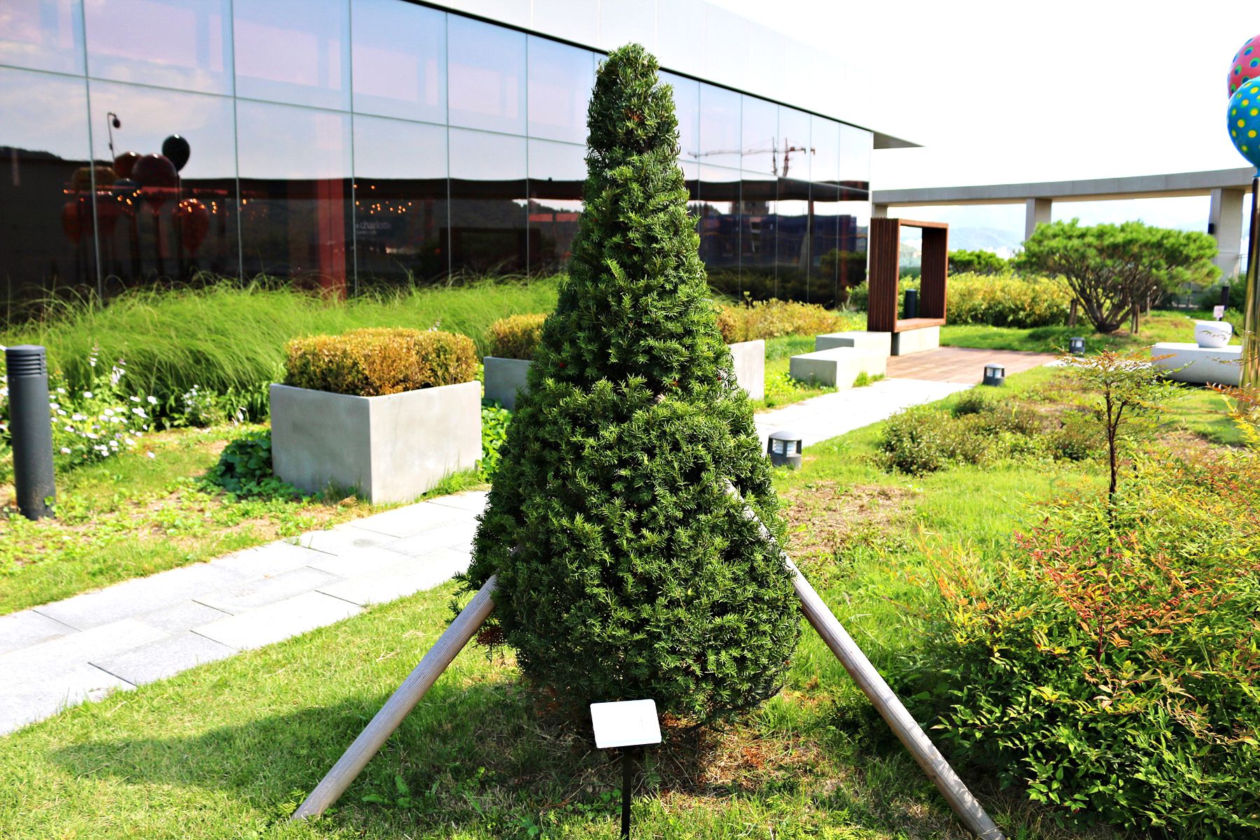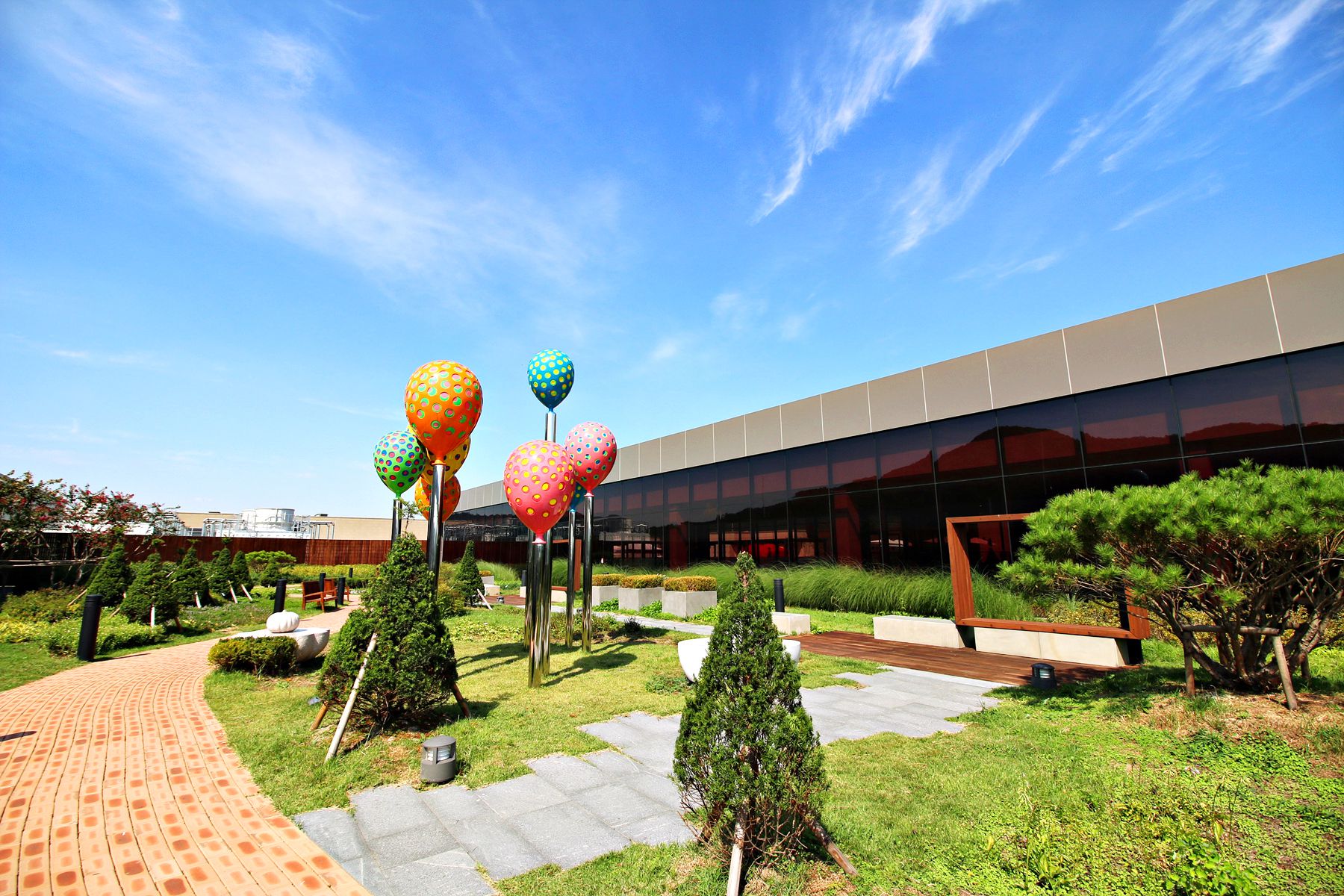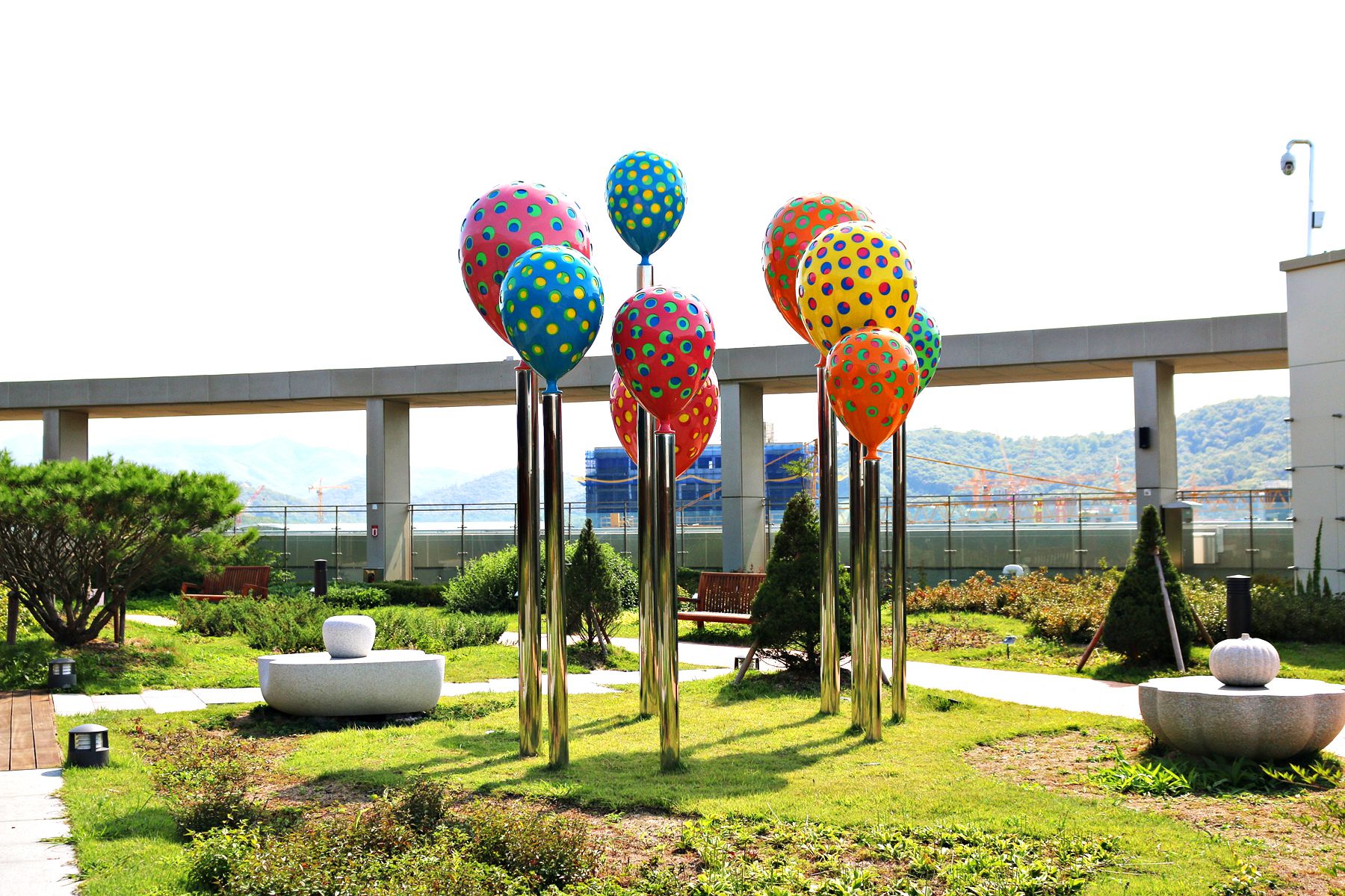 푸른 하늘과 바닥의 잔디, 알록달록한 풍선 모양을 하고 있는 조형물이 옥상정원의 분위기 메이커입니다^^