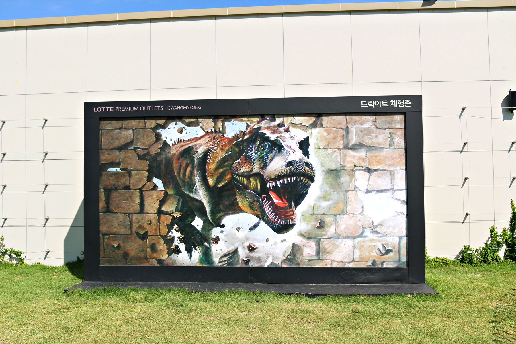 공룡이 벽을 뚫고 나올 것 같이 생생한 그림! 바로 트릭아트입니다.
