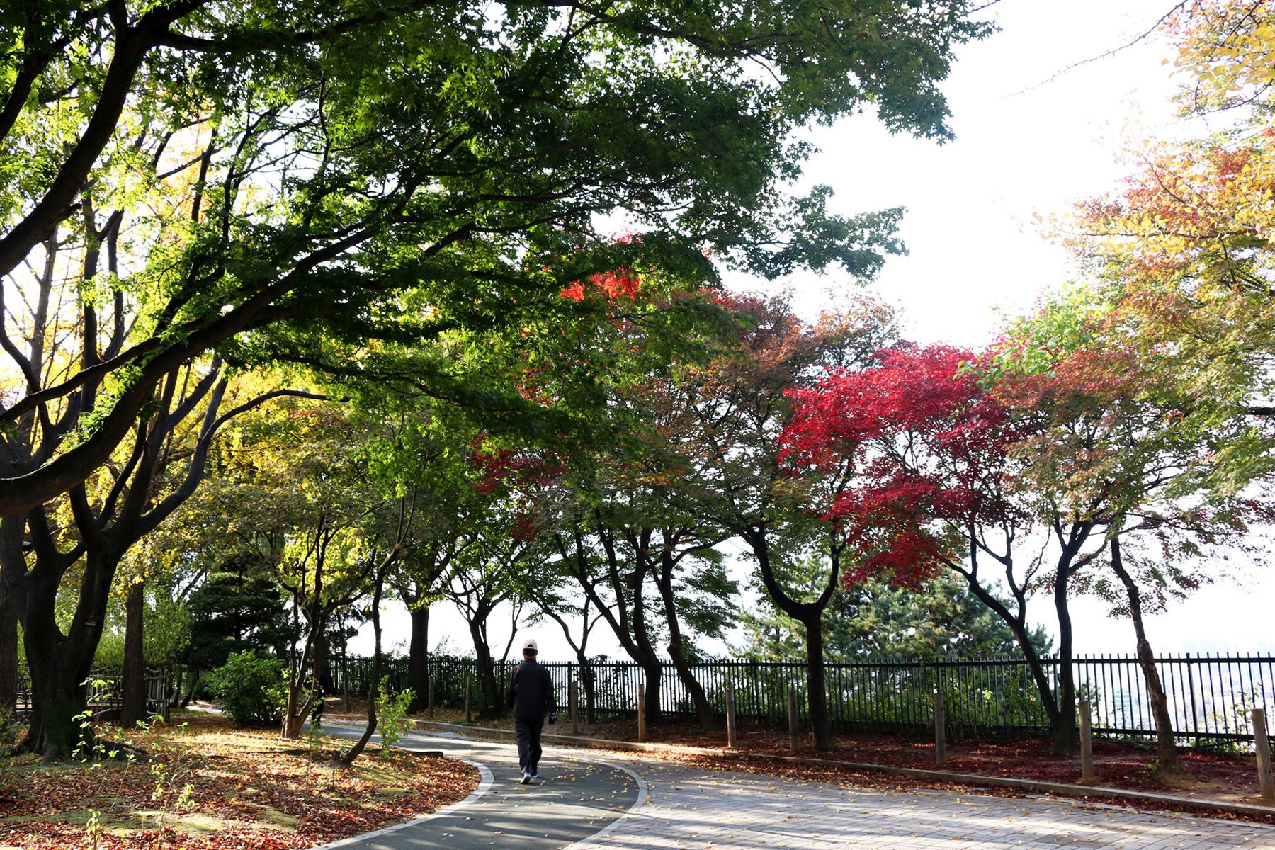 어른들은 벤치에 앉아 쉬면서 단풍을 즐기기 좋습니다.