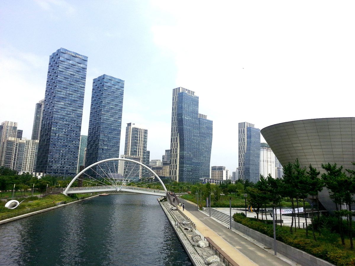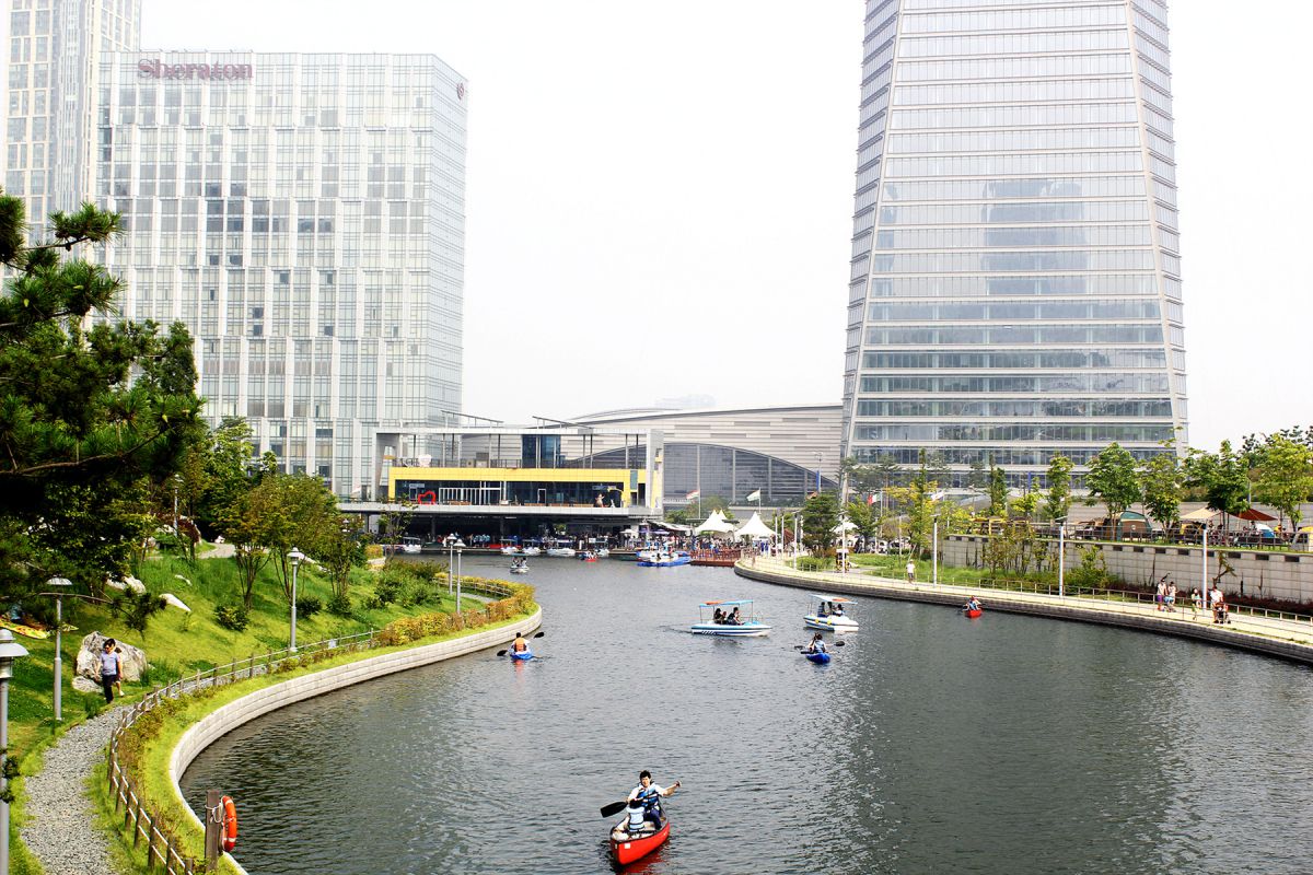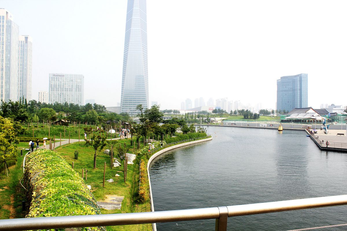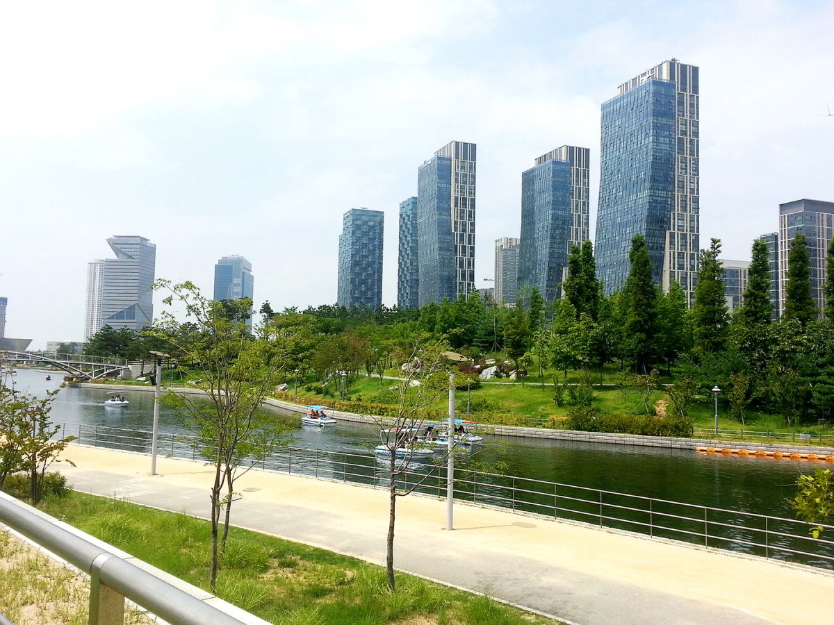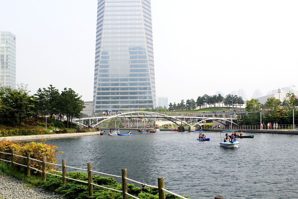 송도국제도시의 높고 멋진 건물들 사이에 자리잡은 송도 센트럴공원