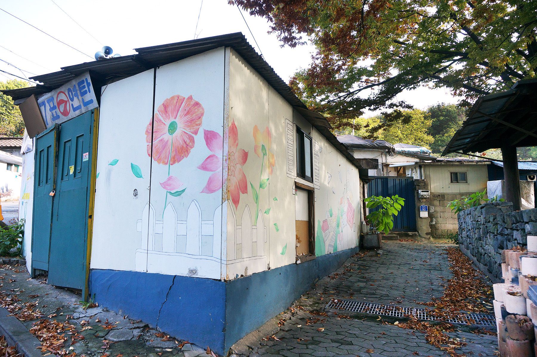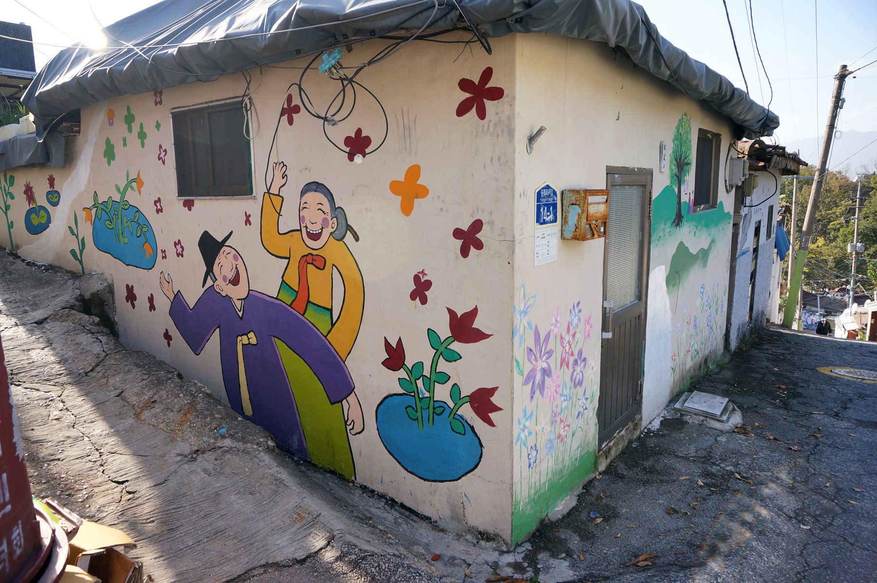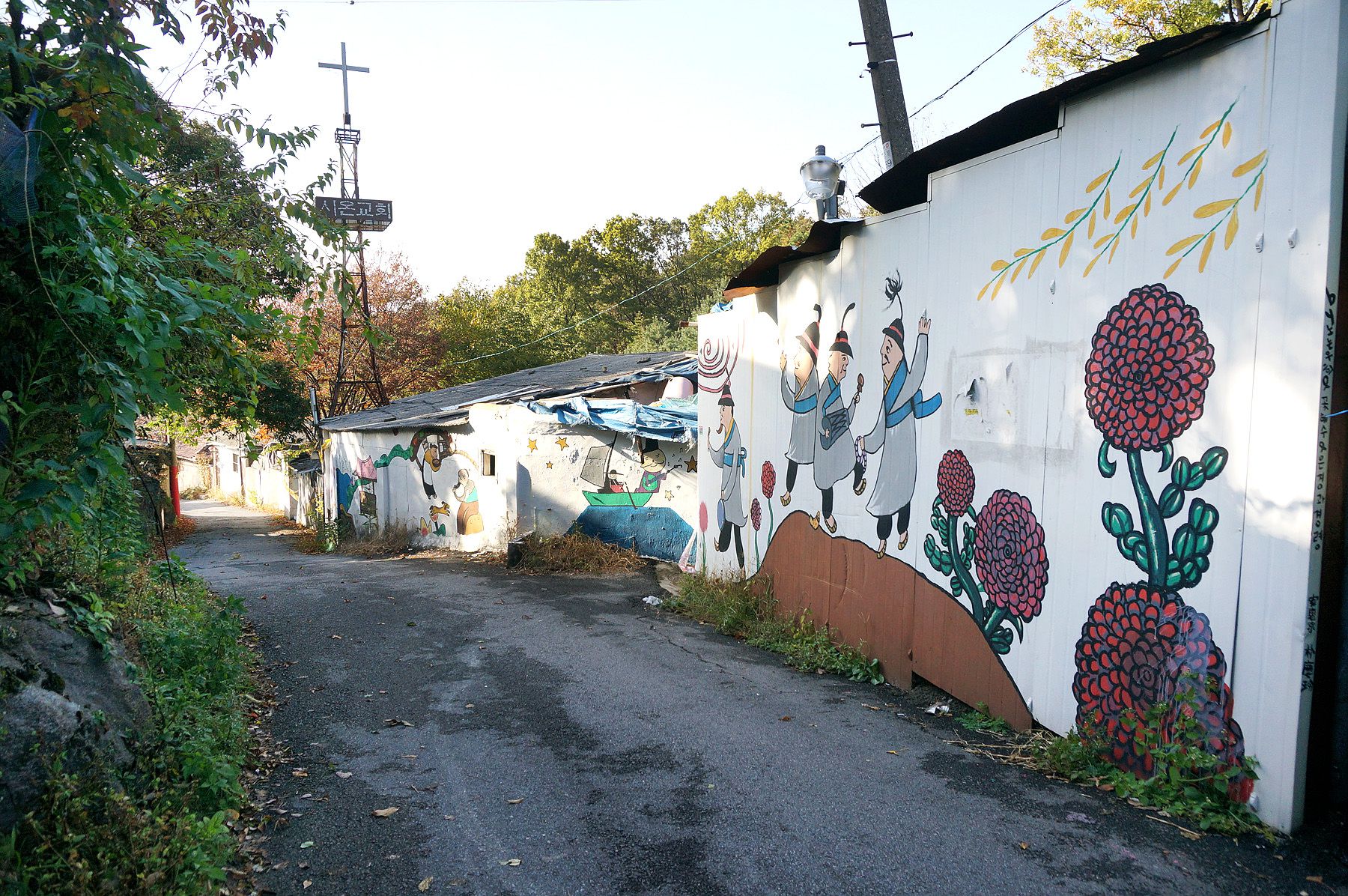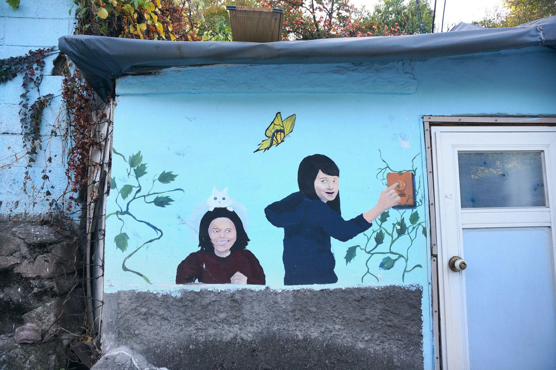 쓸쓸해 보이지 않는 것은 활기차고 웃는 그림들의 벽화와 온기가 전해지는 듯한 연탄 때문일 것입니다.