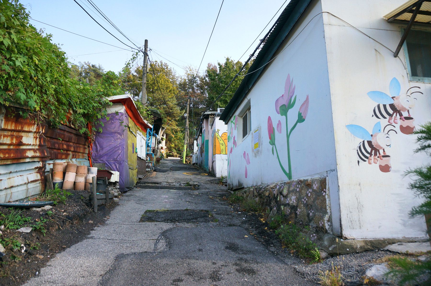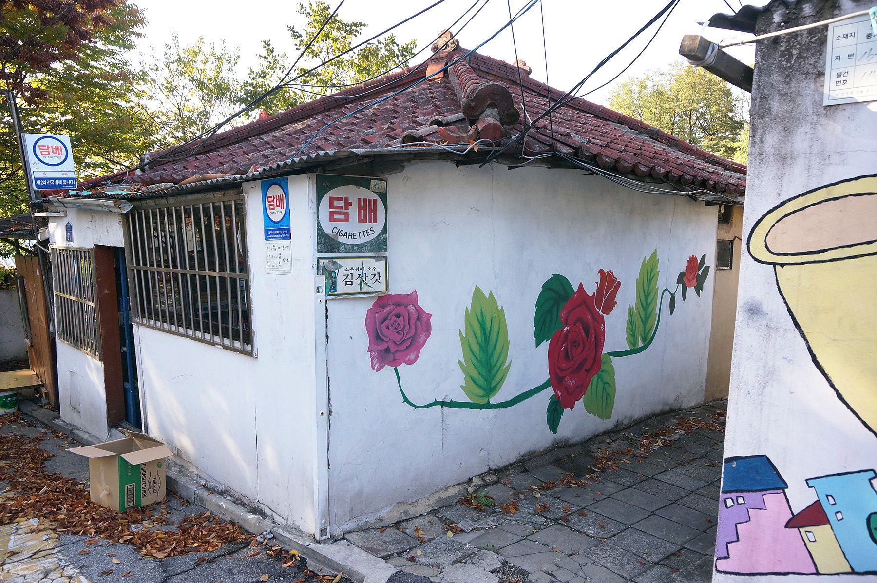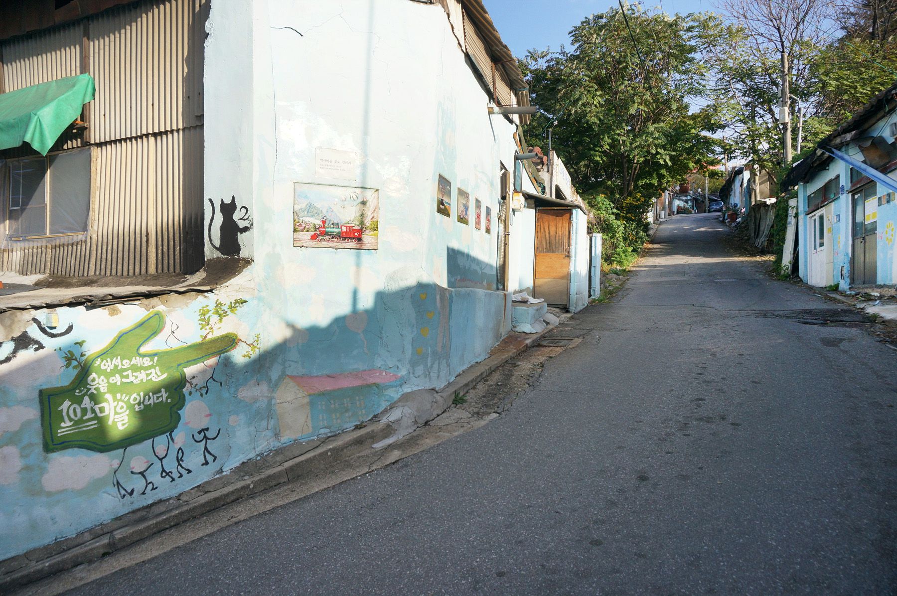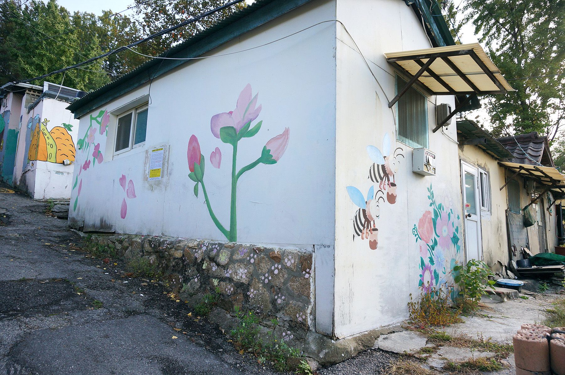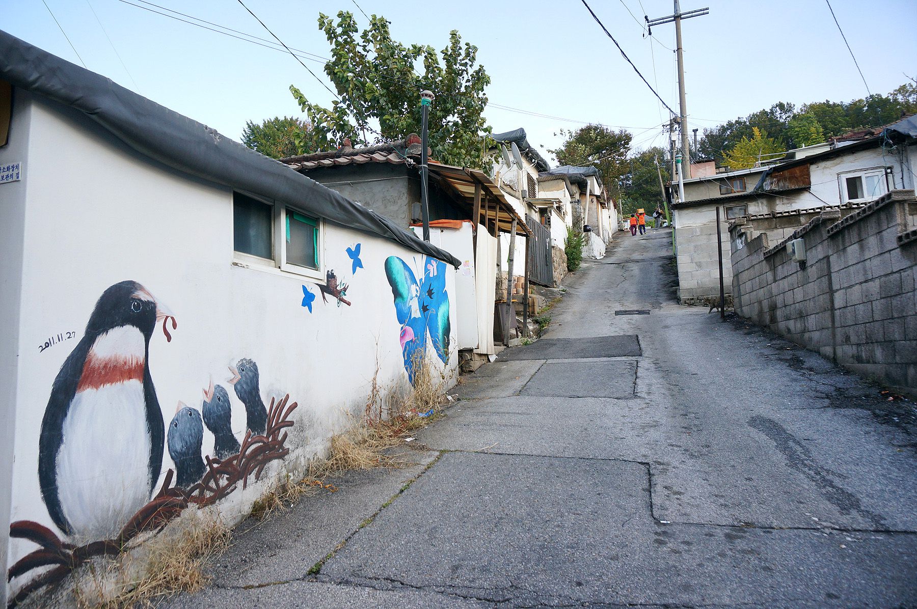 쓸쓸해 보이지 않는 것은 활기차고 웃는 그림들의 벽화와 온기가 전해지는 듯한 연탄 때문일 것입니다.