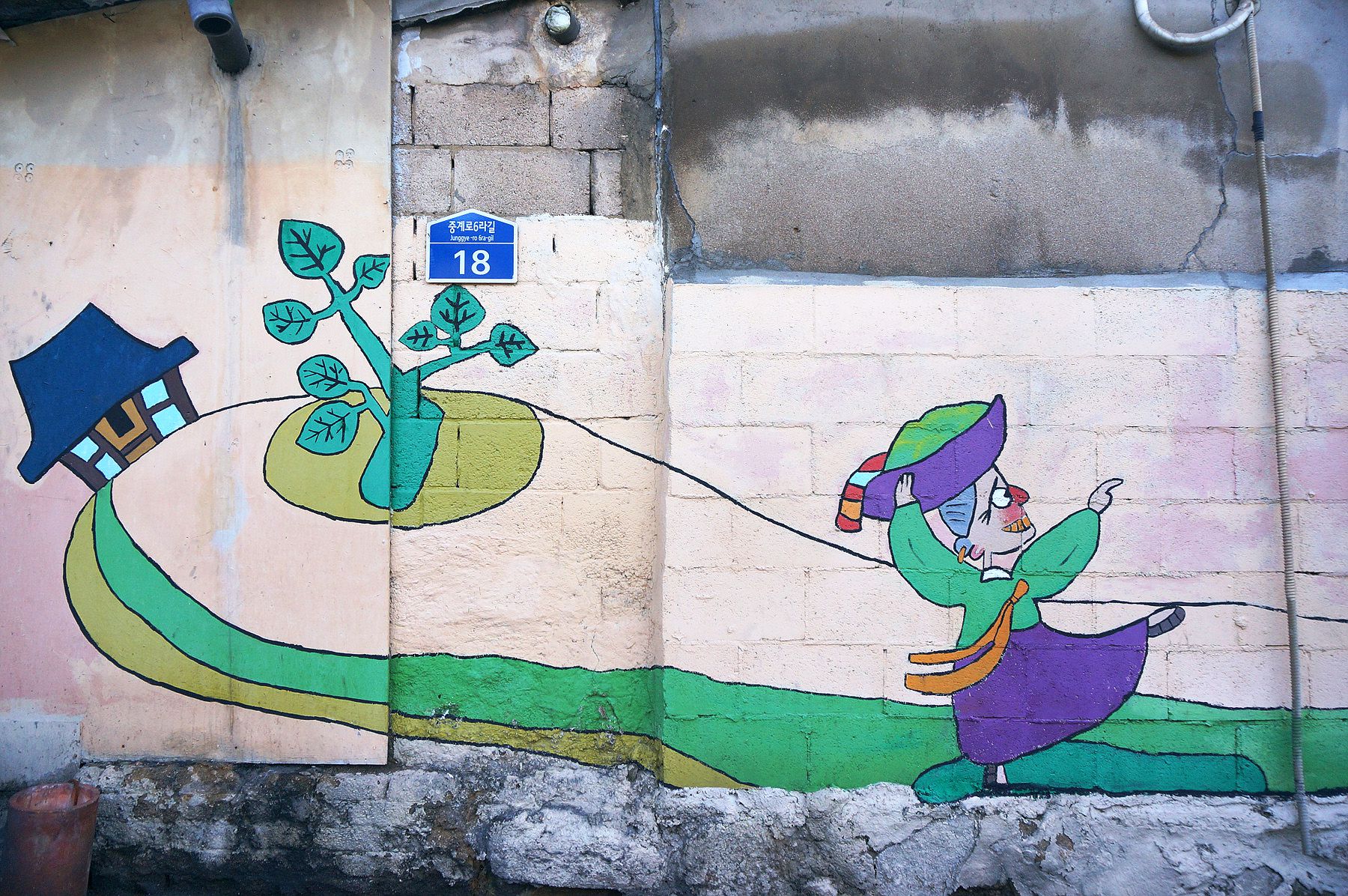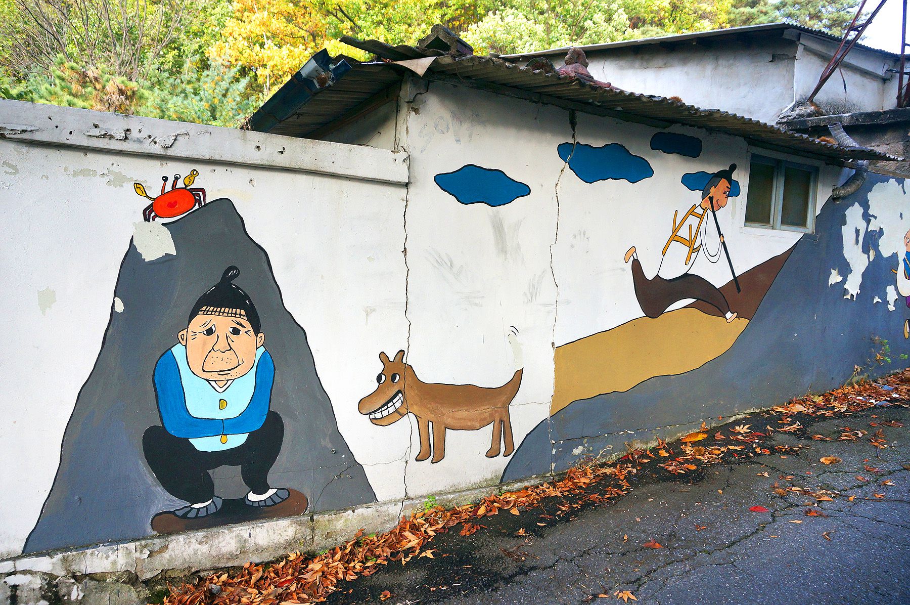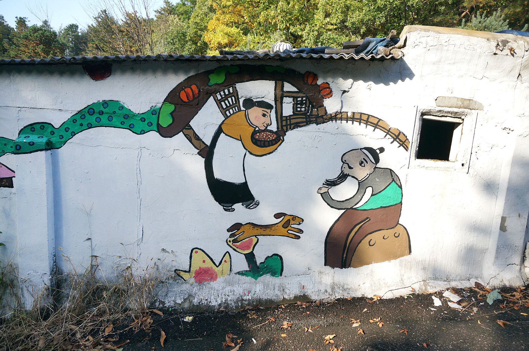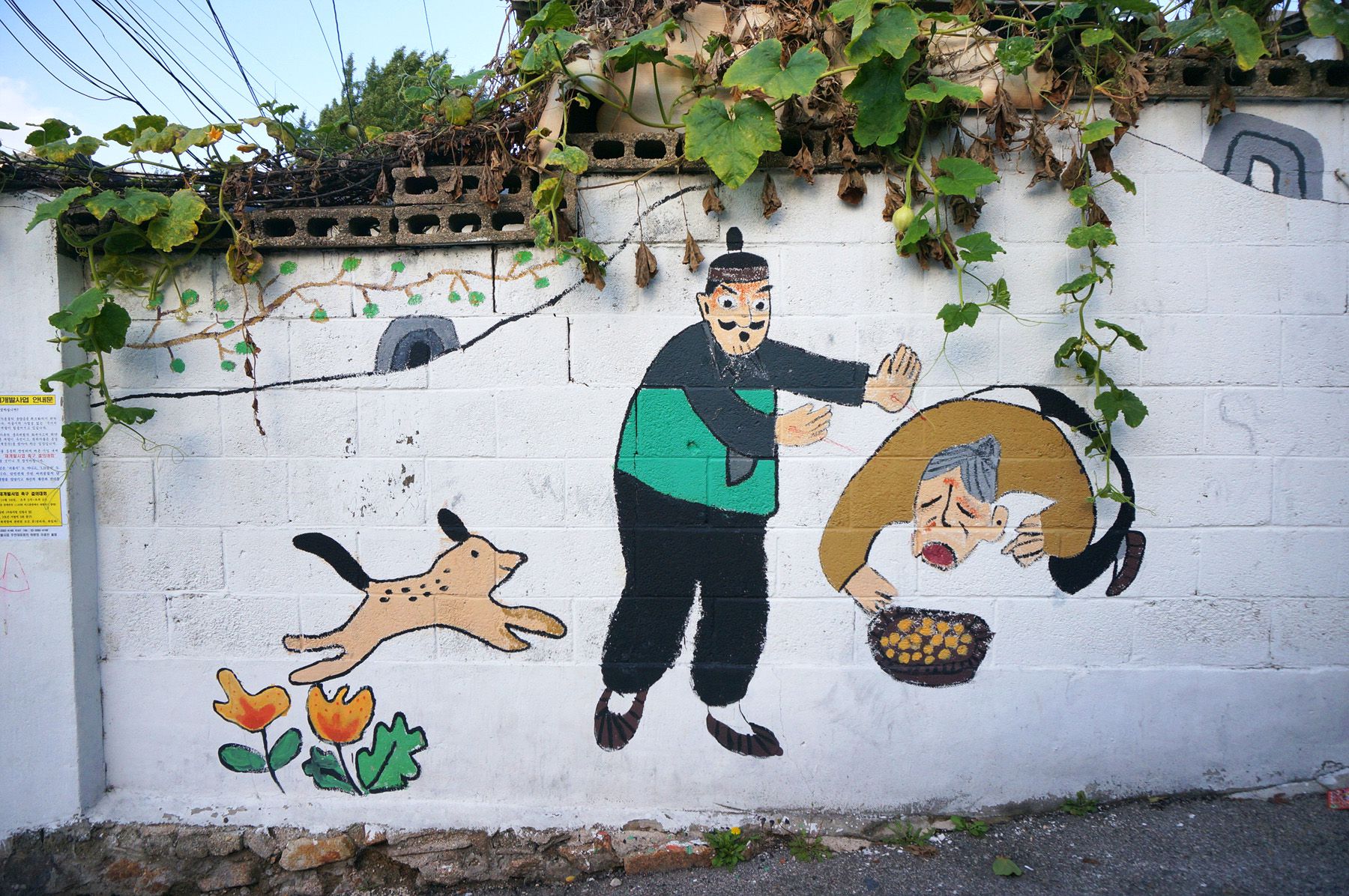 전래동화의 한 장면을 그려놓은 듯한 벽화를 통해 순수했던 동심의 세계로 들어가는 것 같습니다.