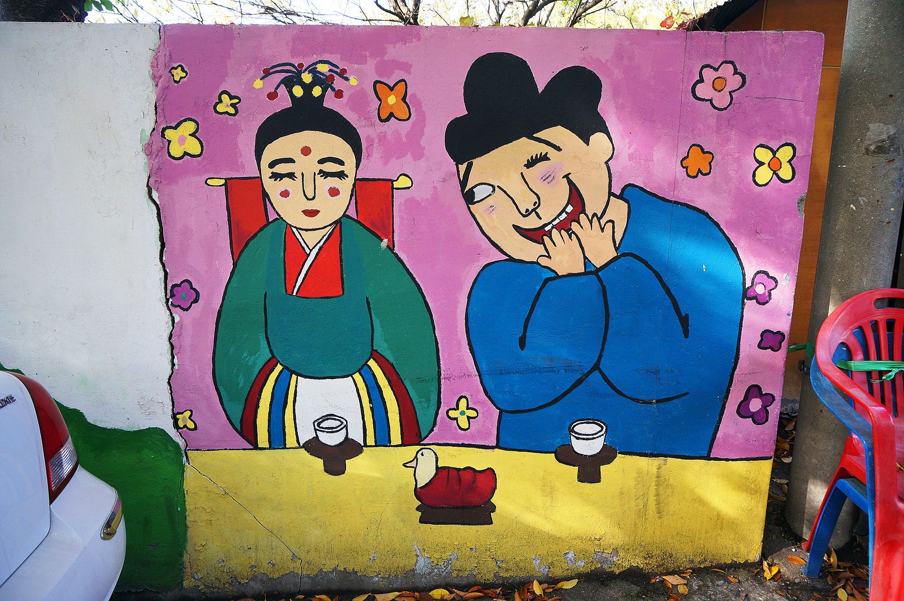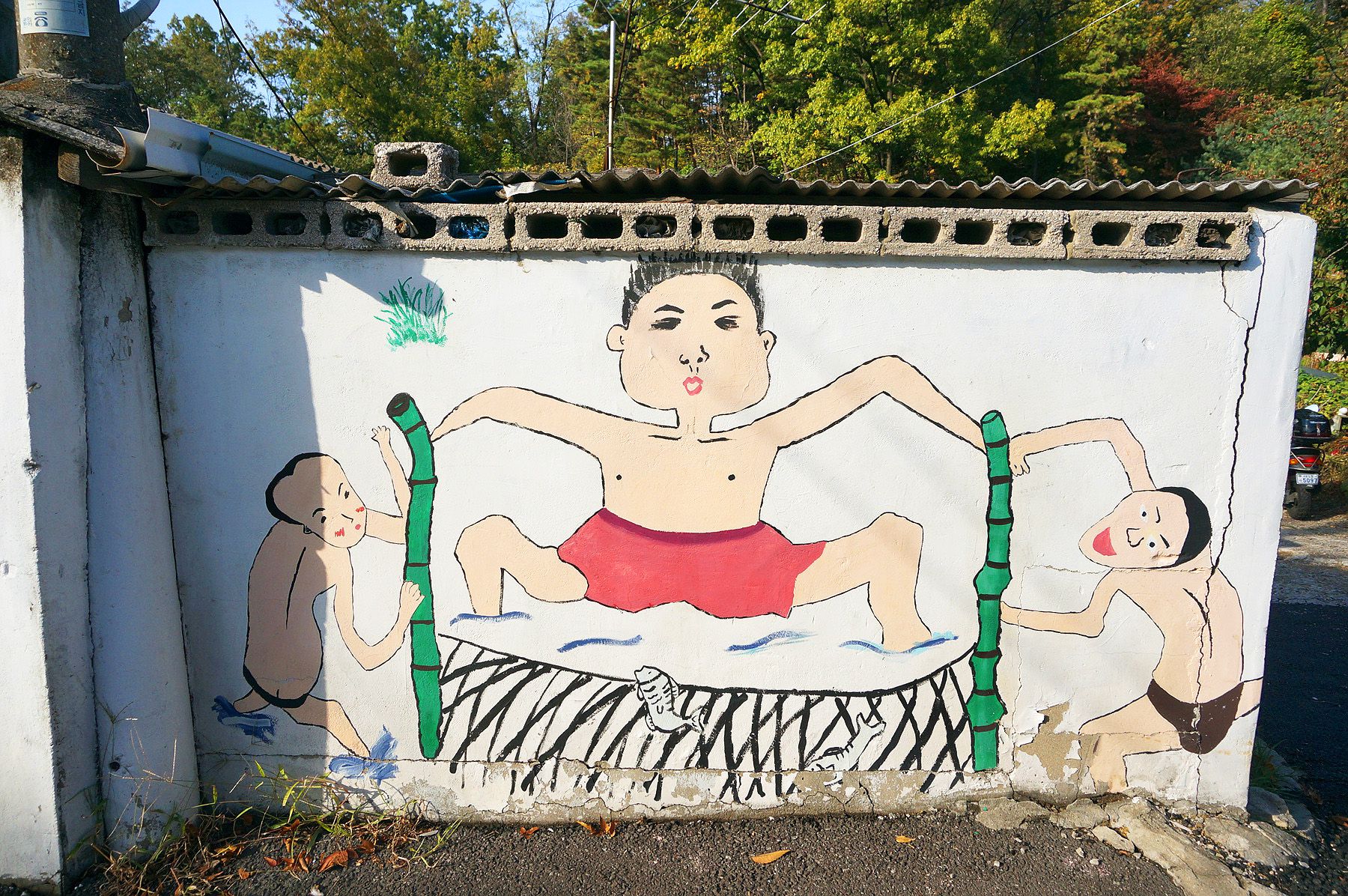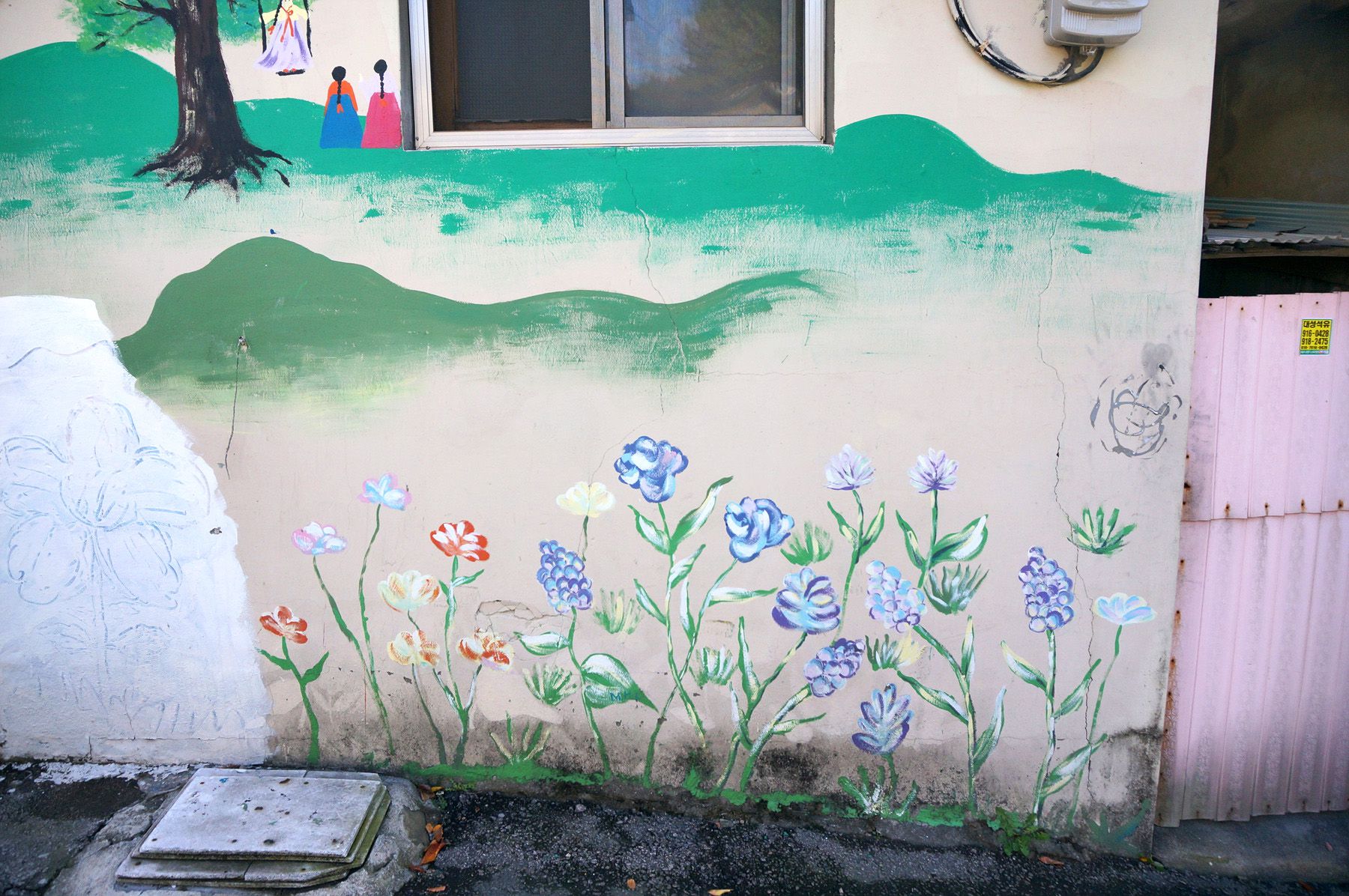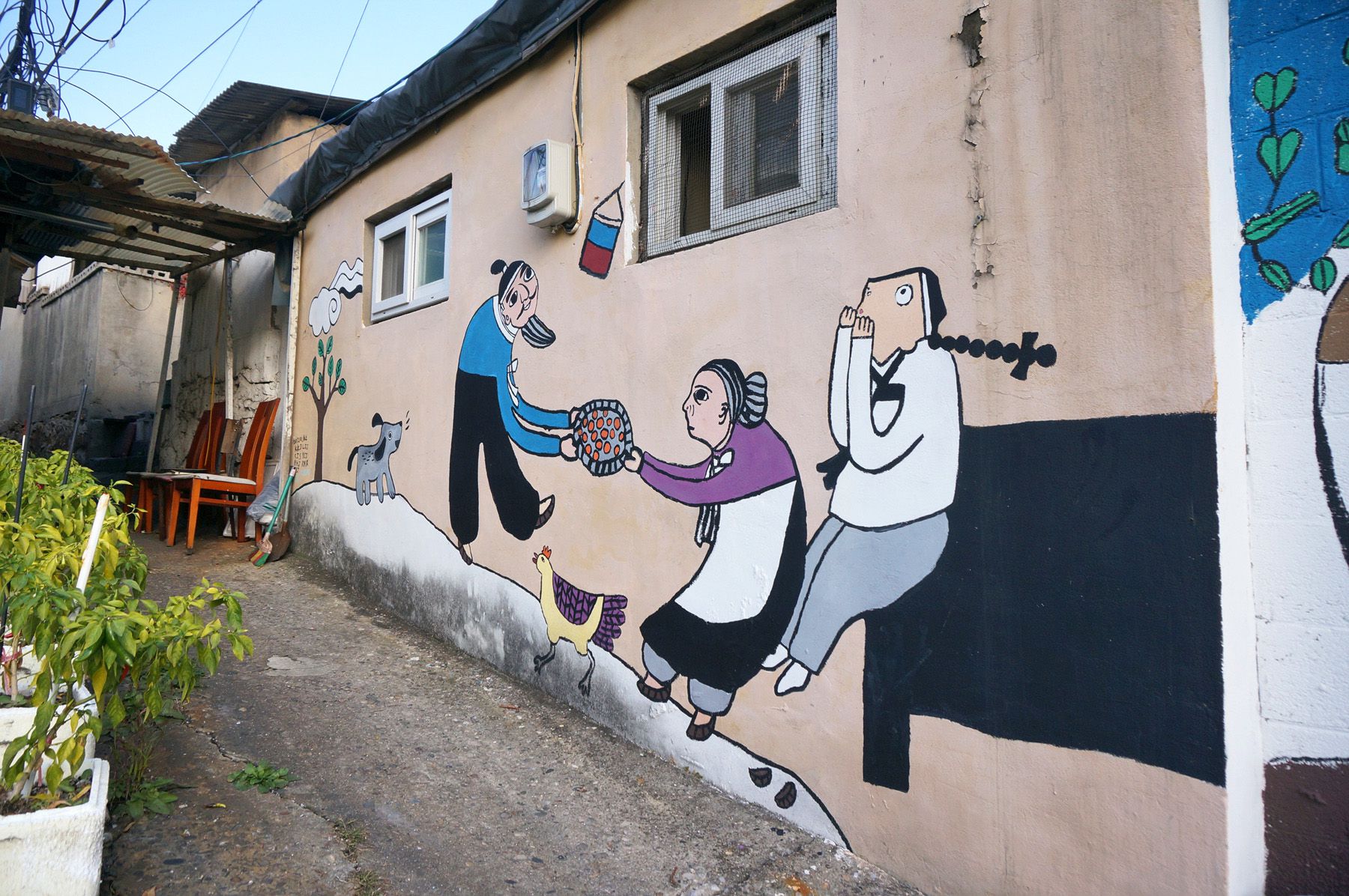 전래동화의 한 장면을 그려놓은 듯한 벽화를 통해 순수했던 동심의 세계로 들어가는 것 같습니다.