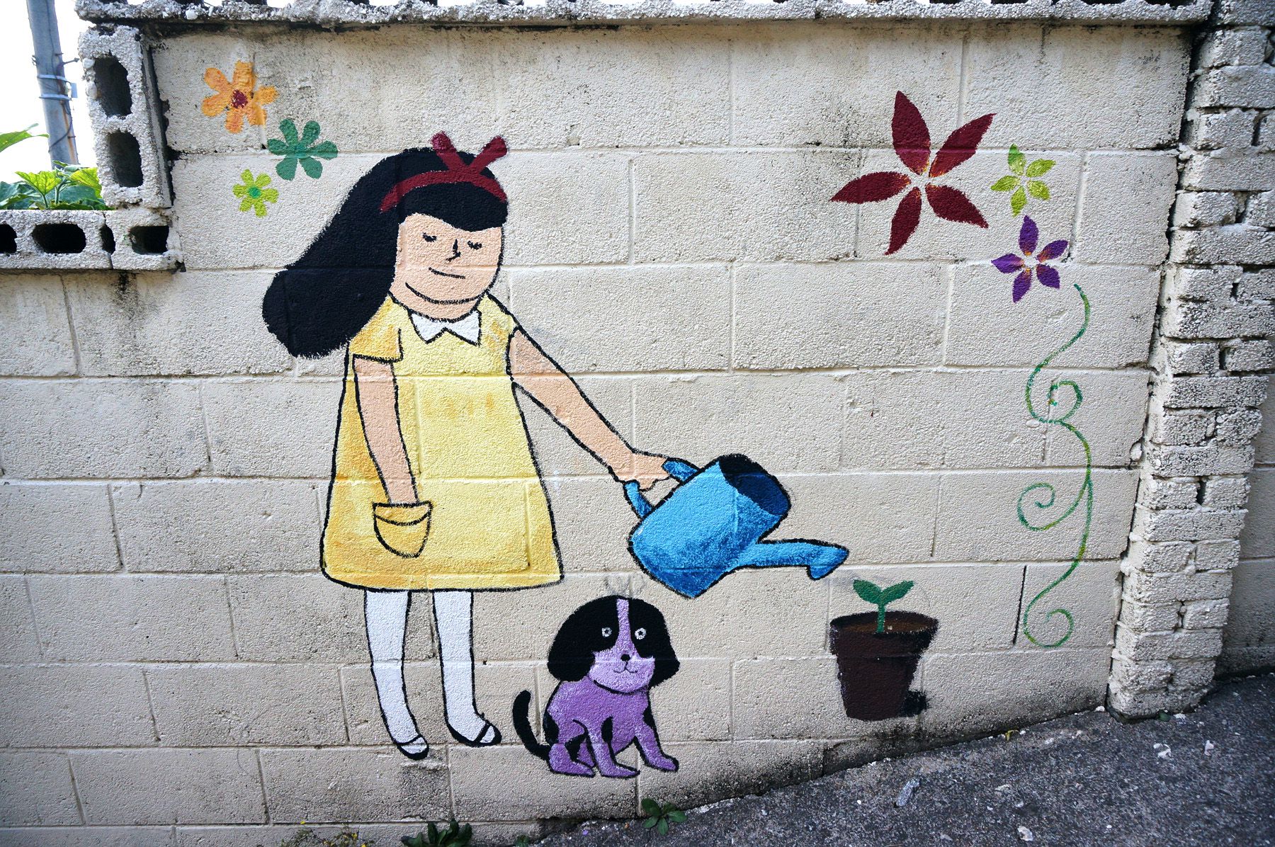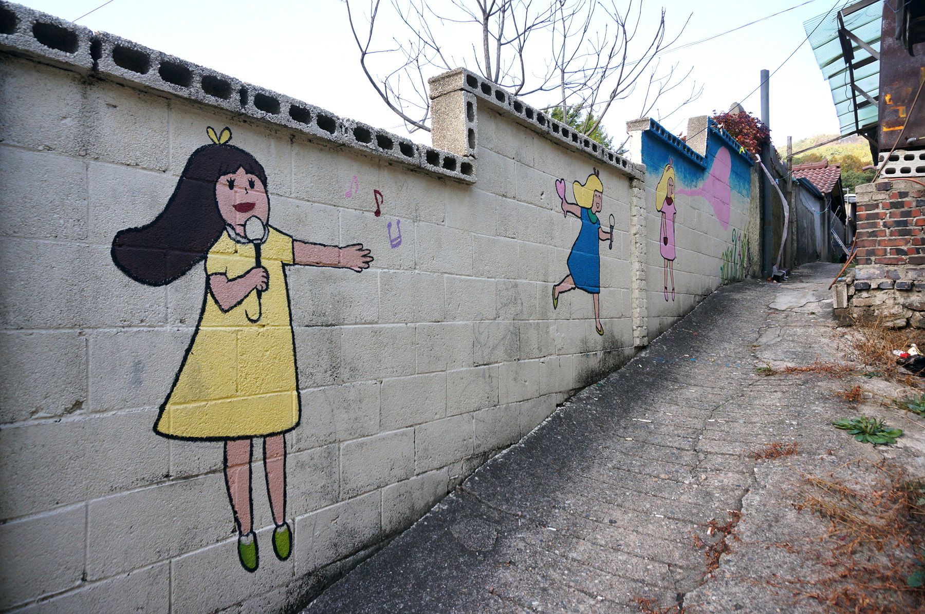 노란 옷의 소녀와 친구들이 전해주는 메세지가 무엇일까 생각해 보게 되는 골목입니다.