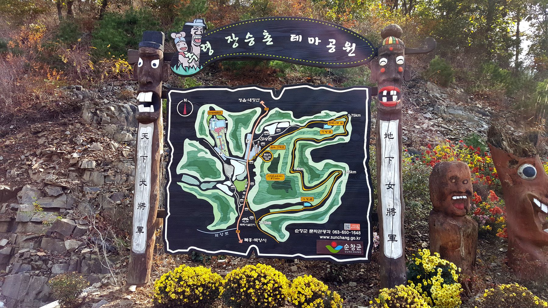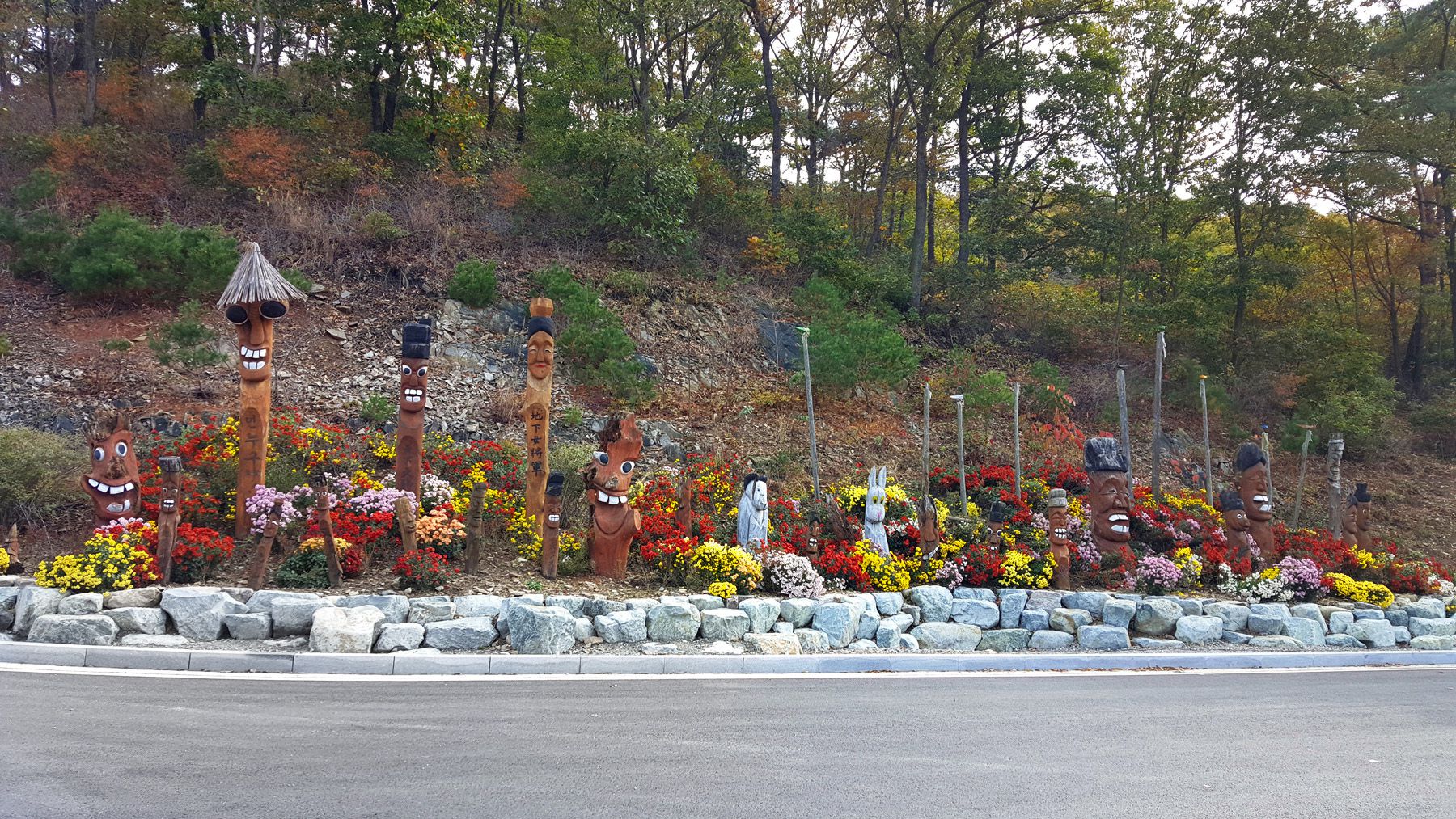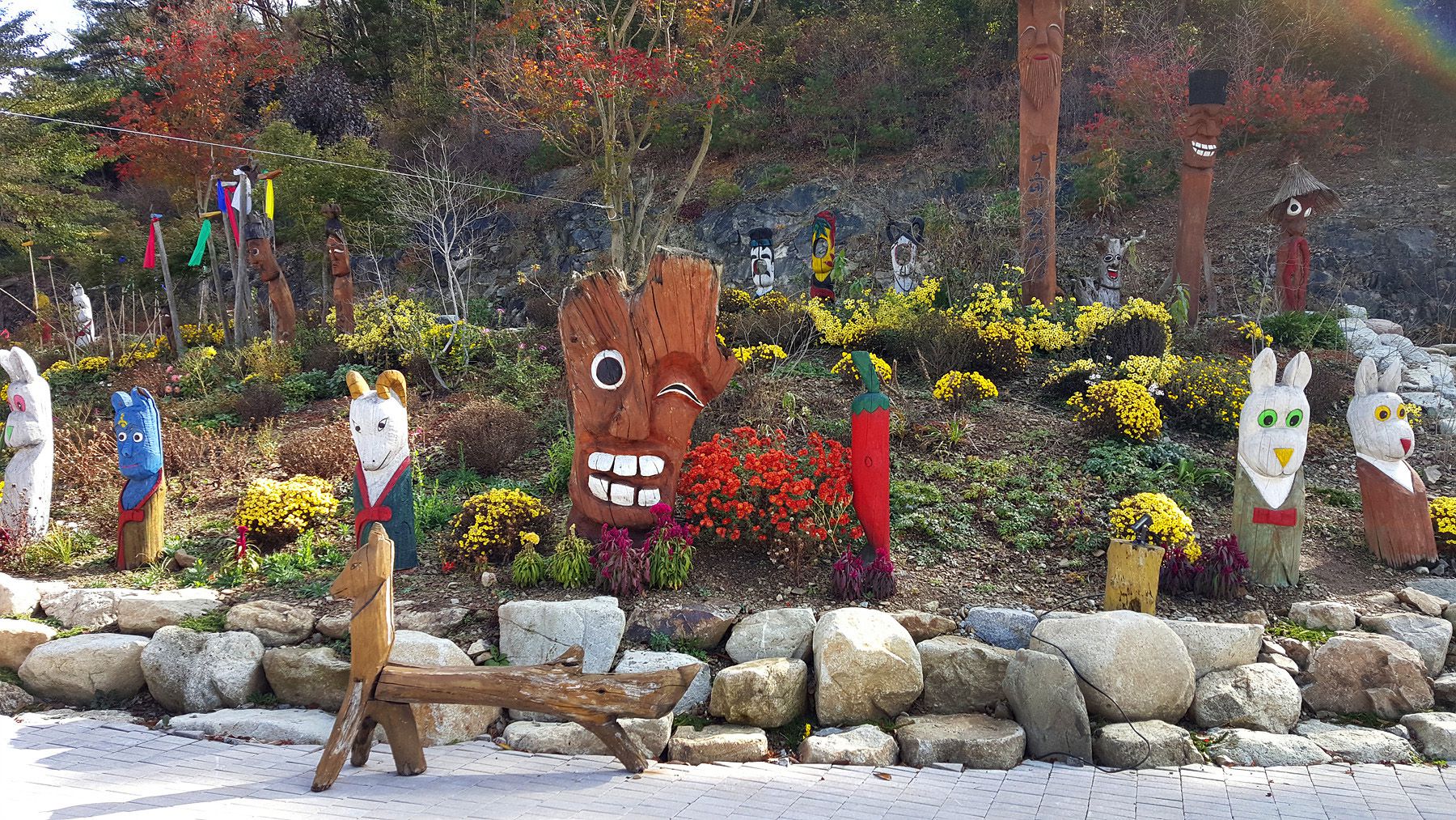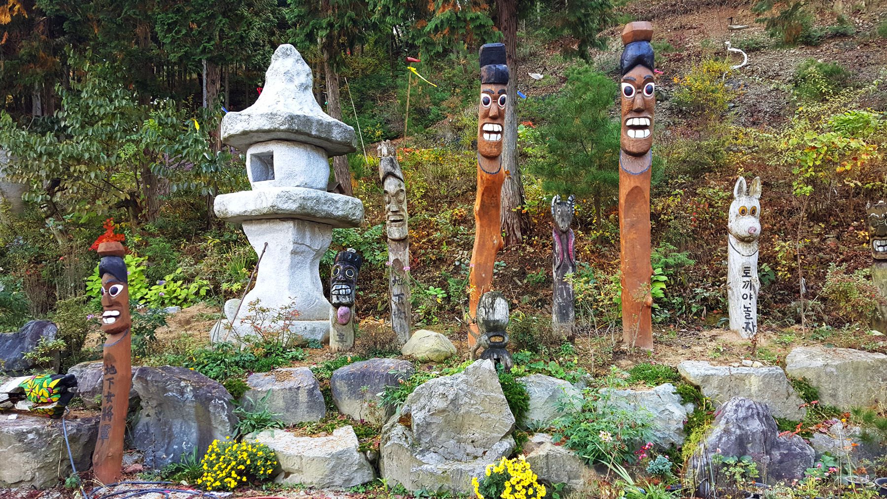 용도에 따라서 각양각색으로 다르게 꾸며진 장승들과 형형색색 다른 다양한 야생화들로 멋지게 꾸며져 있어