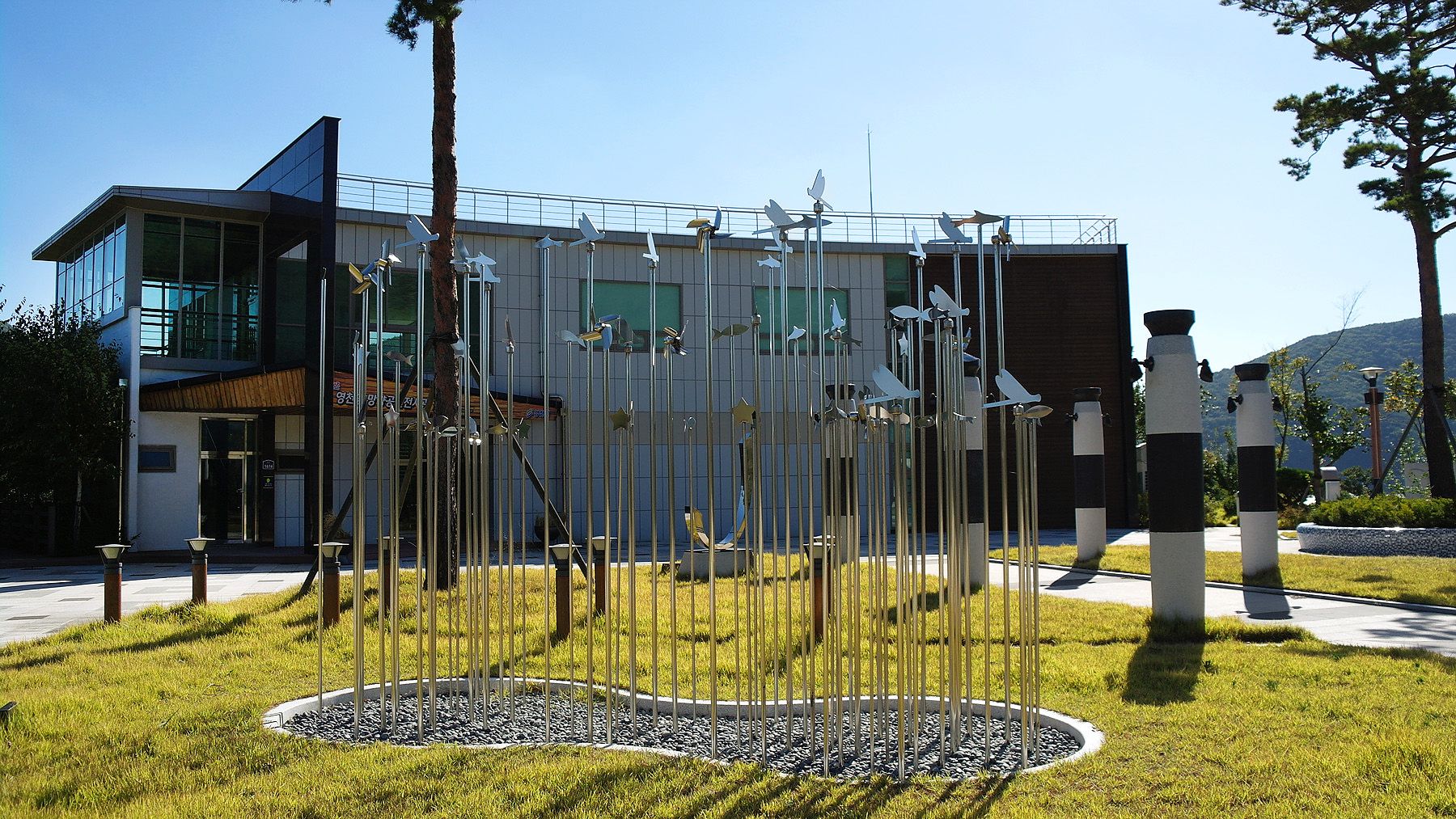 망향탑과 함께 솟대에 잠자리, 바람개비 등을 달아서 고향 풍경의 향수를 불러일으키는 고향의 봄 작품이 있습니다.