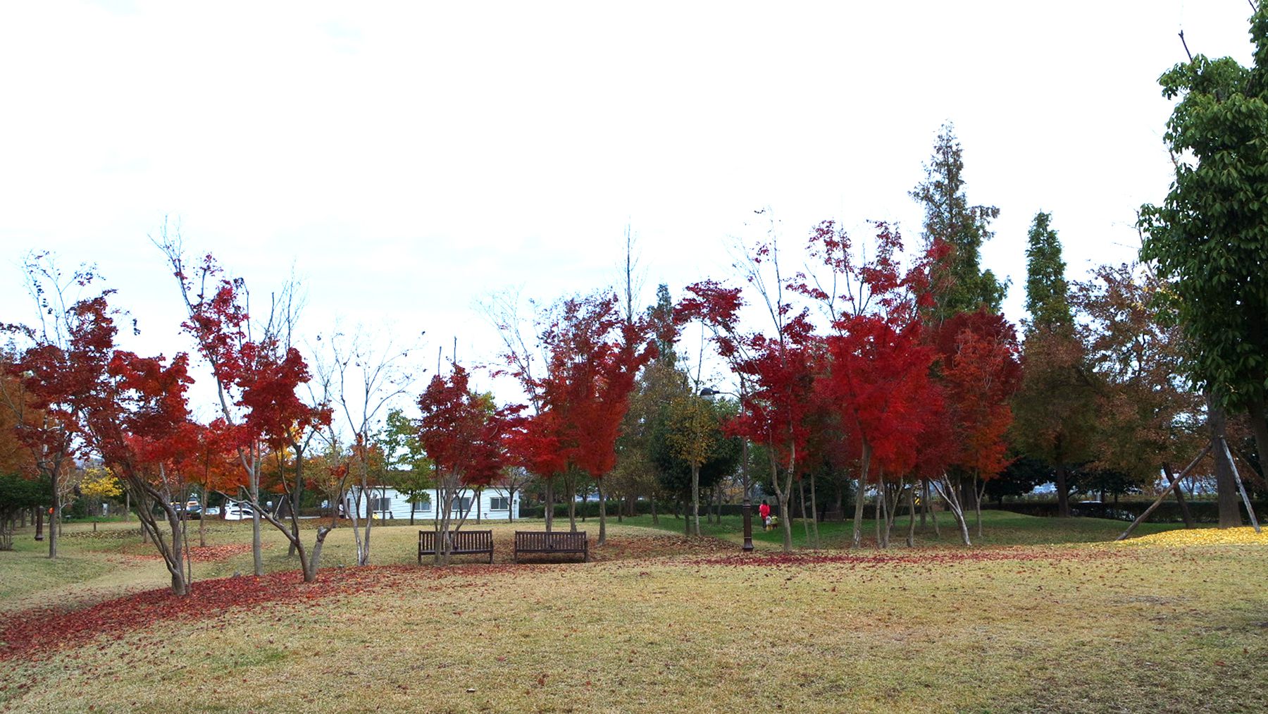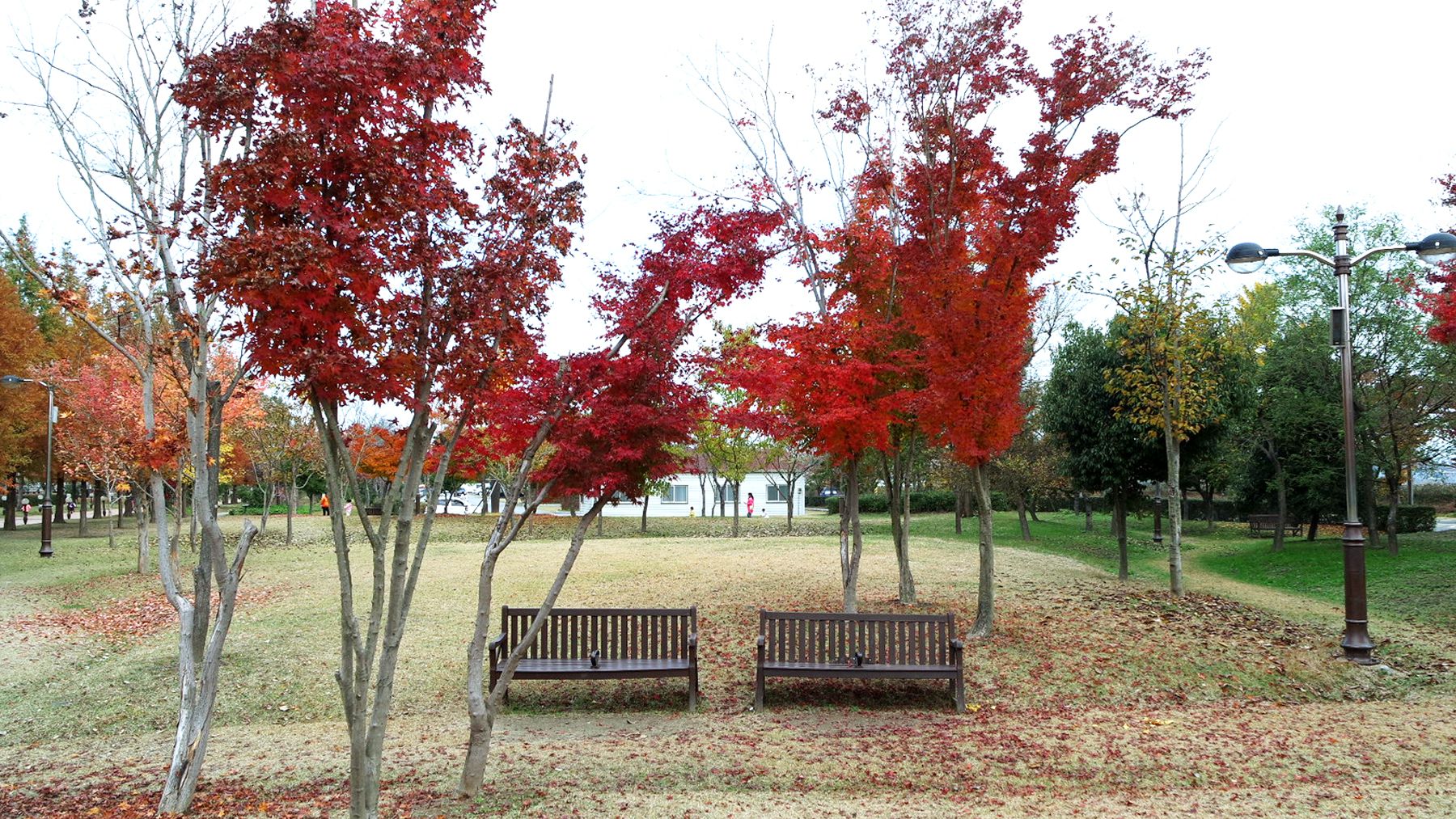 공원 내에 설치된 벤치에 앉아 파란 가을 하늘과 알록달록 물들어가는 단풍나무를 바라보는 여유를 가져보세요.