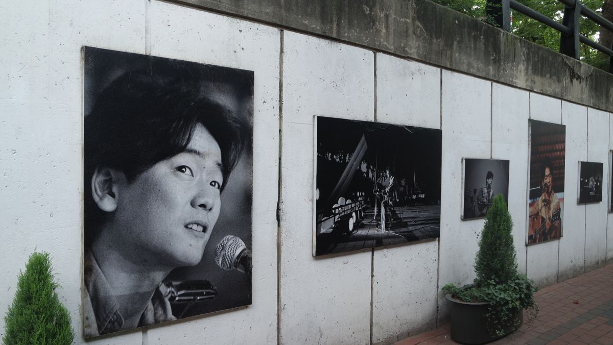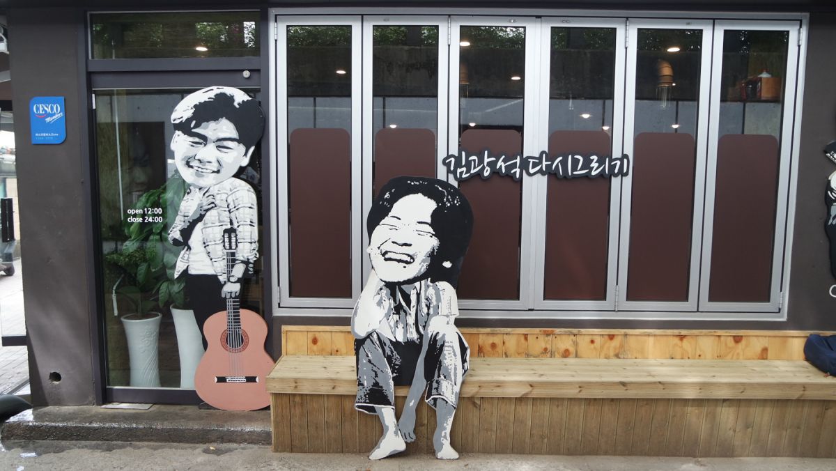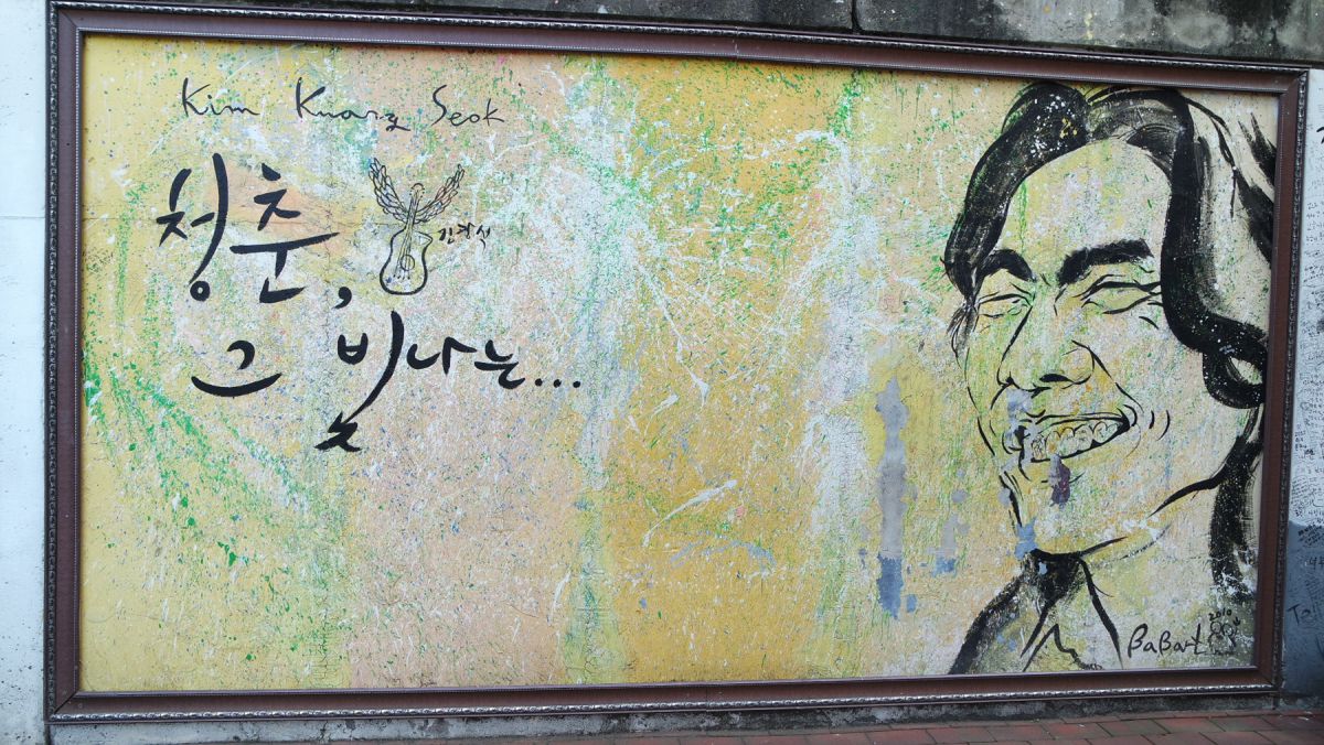 김광석거리에서 흔히 볼 수 있는 것은 그가 웃음지으며 기타 들고 노래를 부르는 모습의 벽화입니다.