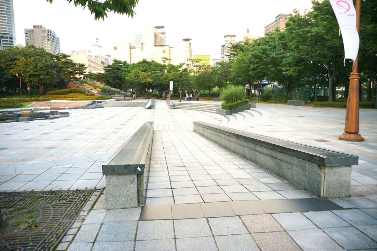 넓고 플랫한 대리석 바닥, 그리고 묘기를 보여줄 수 있는 다양한 설치물들이 있어 인기 있는 스팟입니다.