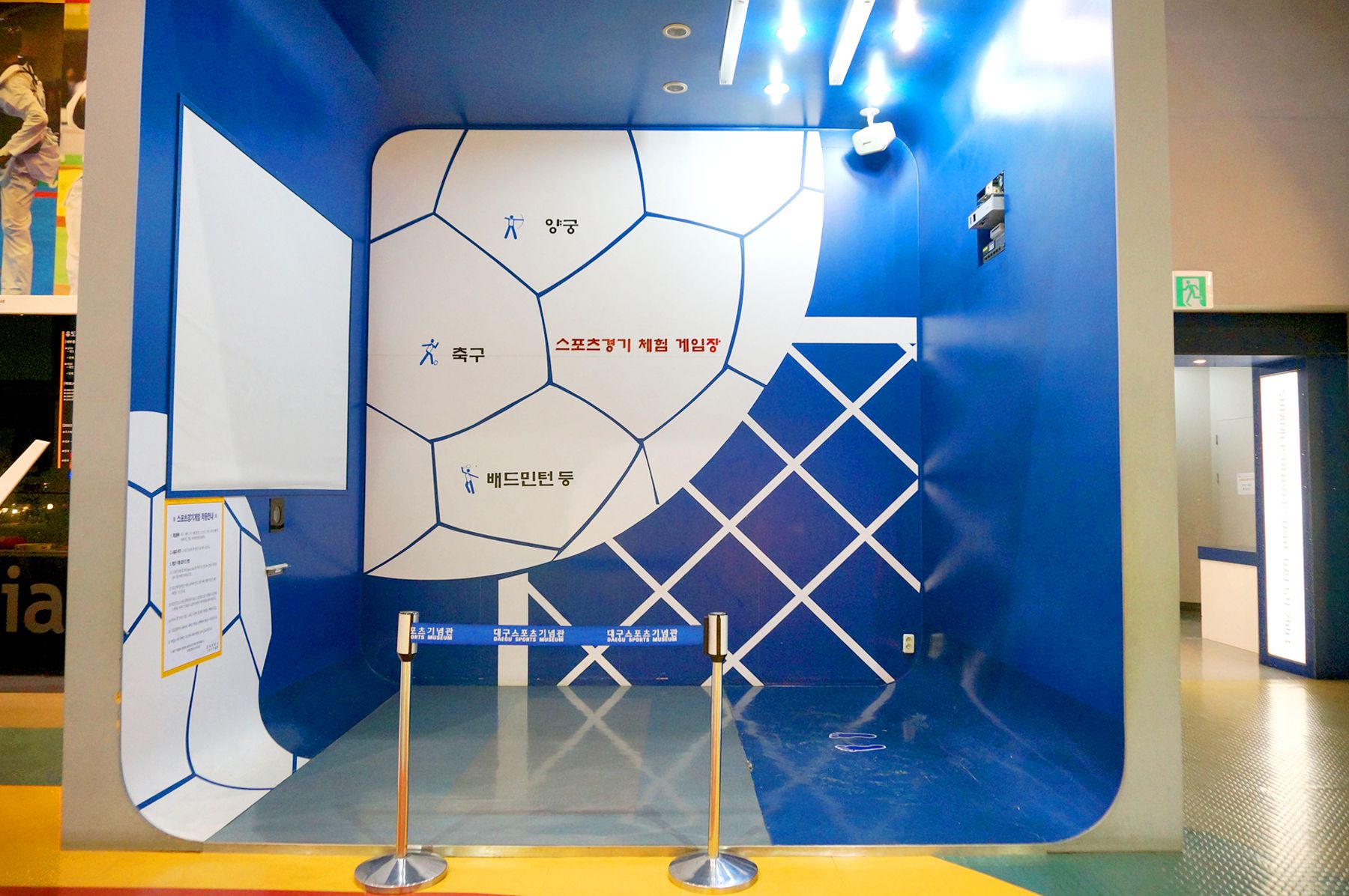 스포츠 경기 가상체험 게임장에서는 축구, 양궁, 배드민턴, 농구, 컬링, 카 페이싱, 피겨스케이팅 체험이 가능하며