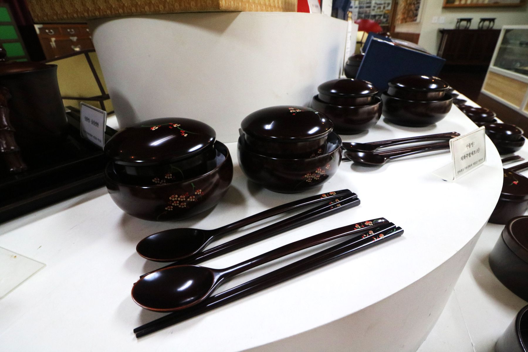 다양한 옻칠 반상기나 목기들이 전시되어 있으니 감상해 보실 수 있습니다.