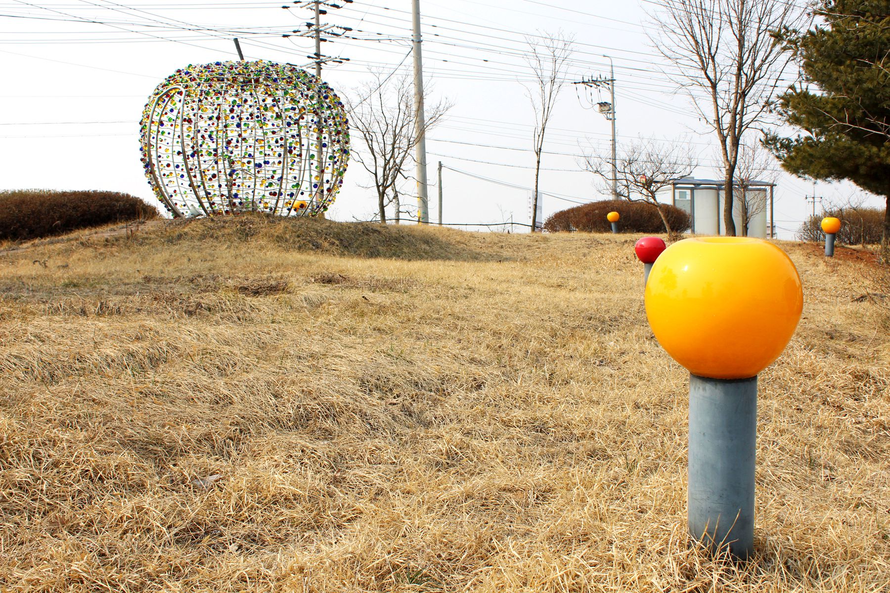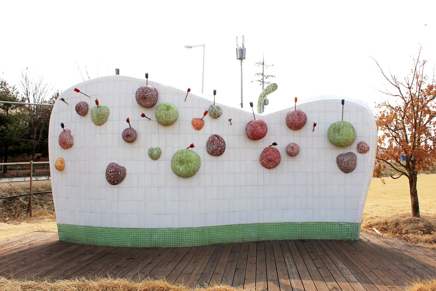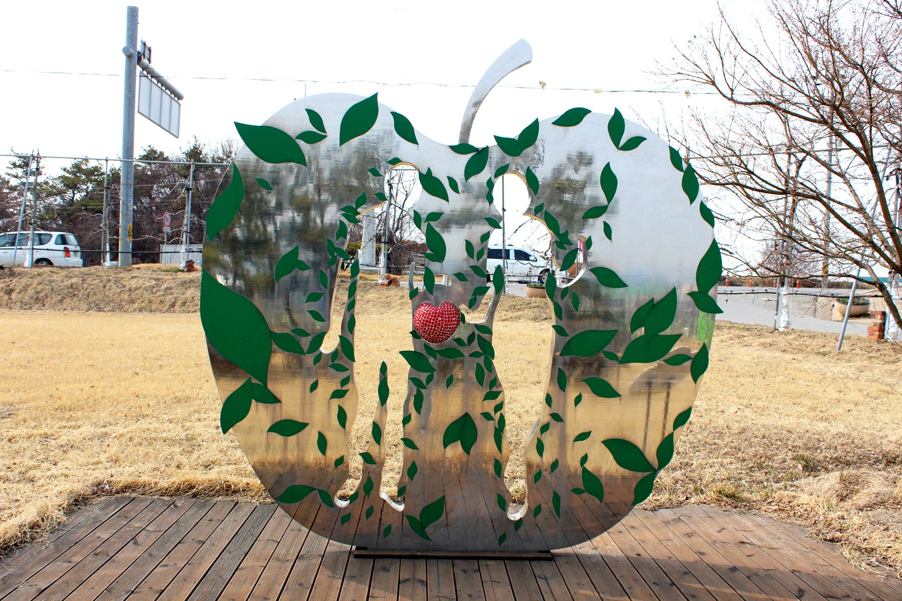 홍보탑, 사과 조형물, 풍요의 사과, 뉴턴, 아담과 이브, 도약의 사과, 빌헬름 텔, 백설공주, 사과원 등의