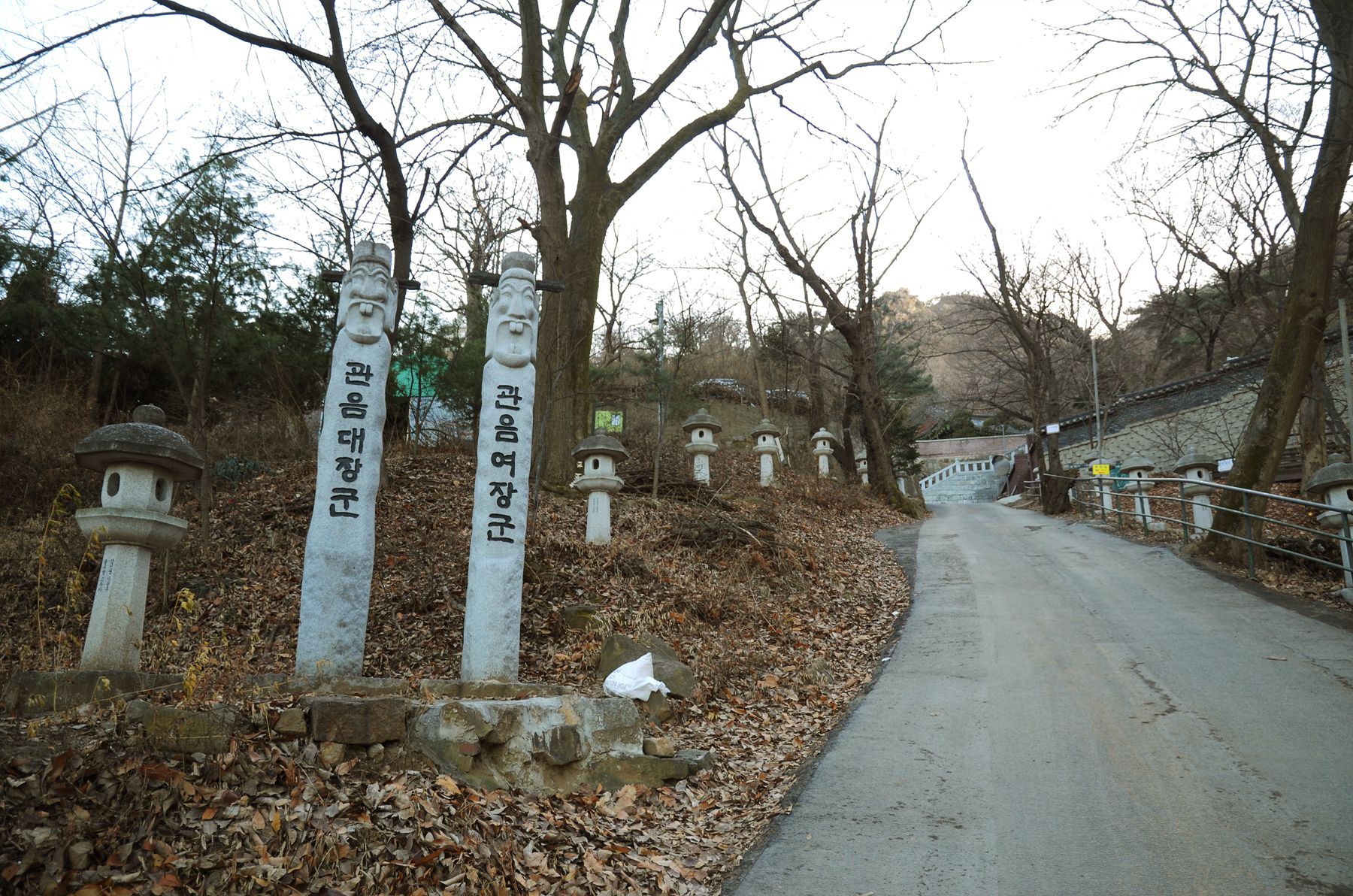 관음사로 오르는 경사길에는 일주문과 길 양옆으로 석등, 석장승이 세워져있습니다.