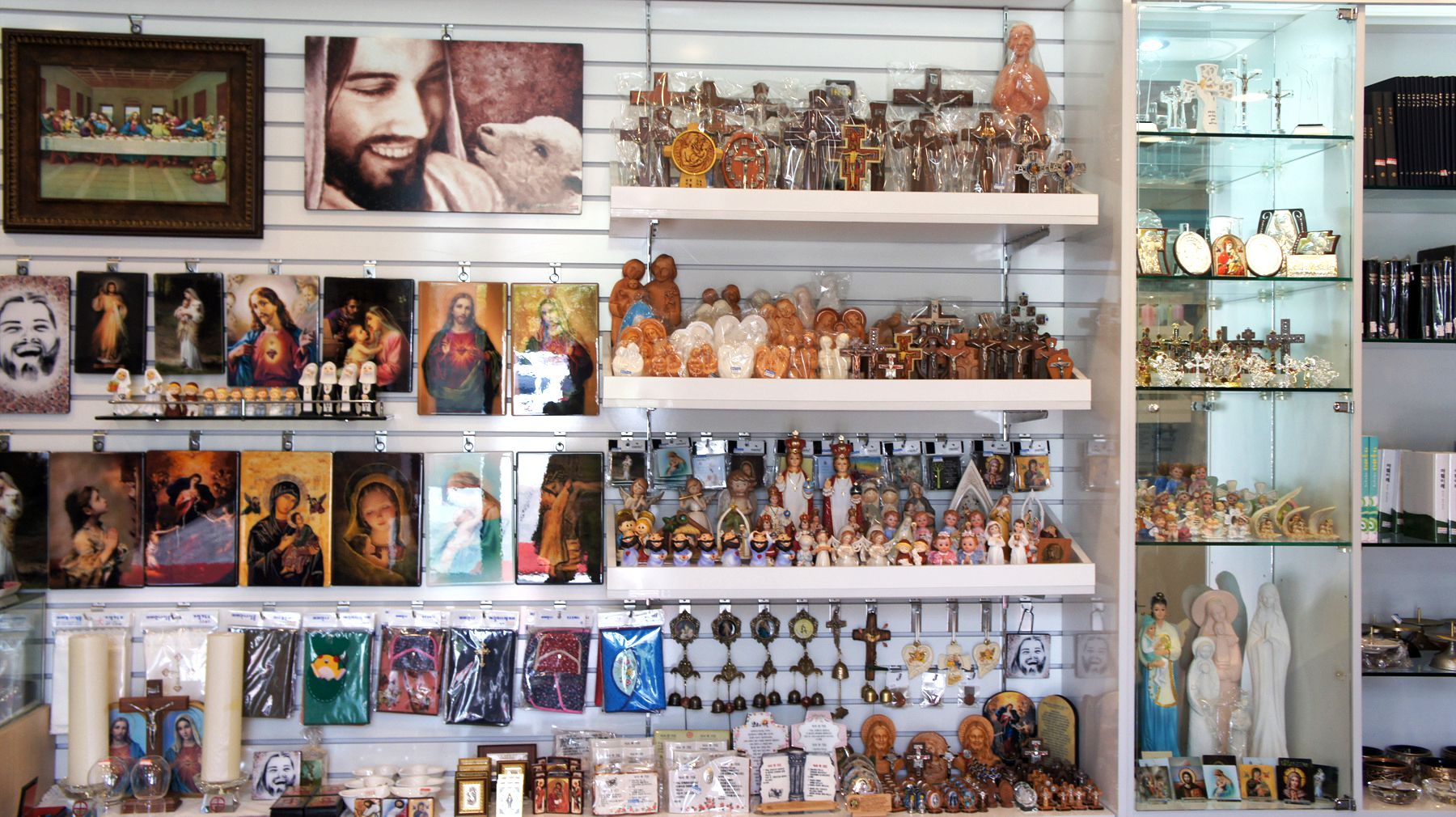 성물방에는 다양한 가톨릭 성화들과 함께 묵주 등을 판매하고 있으며