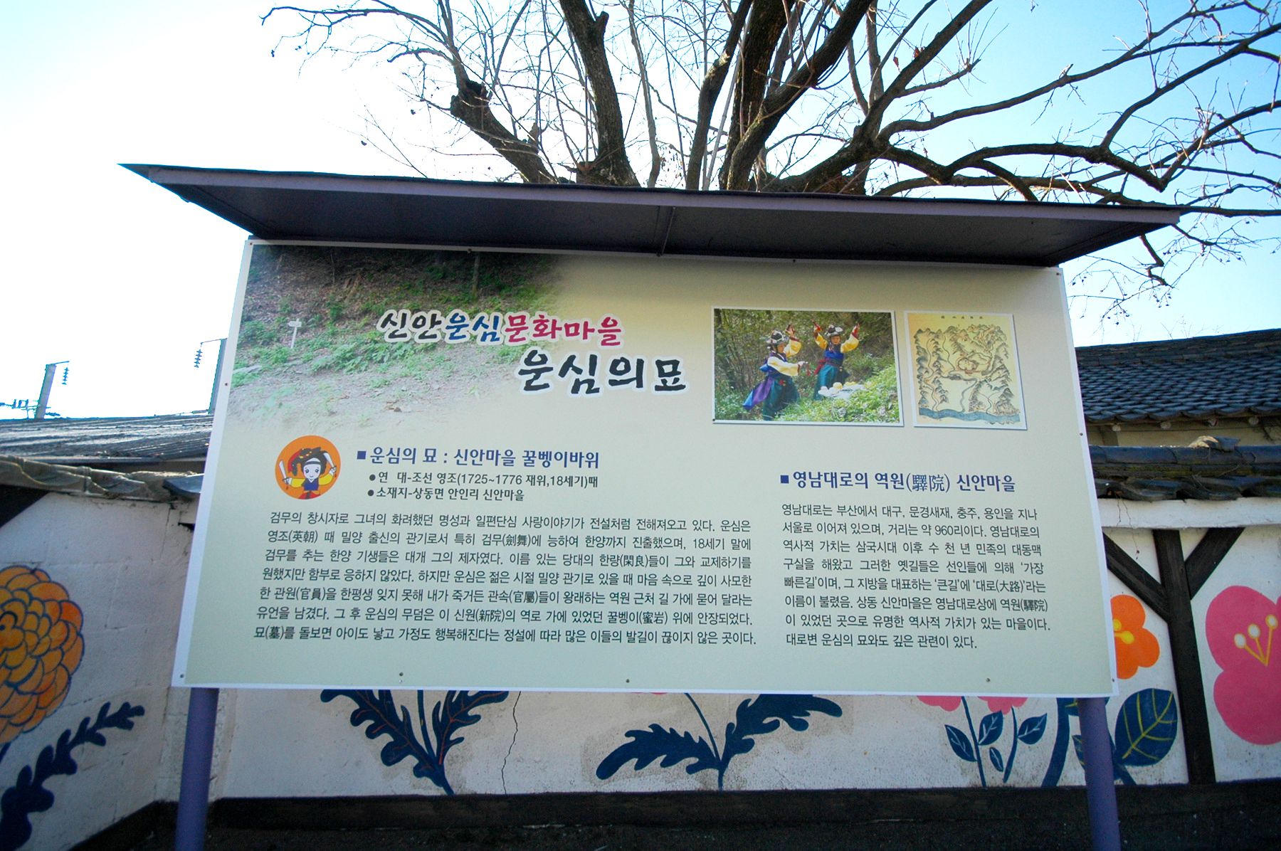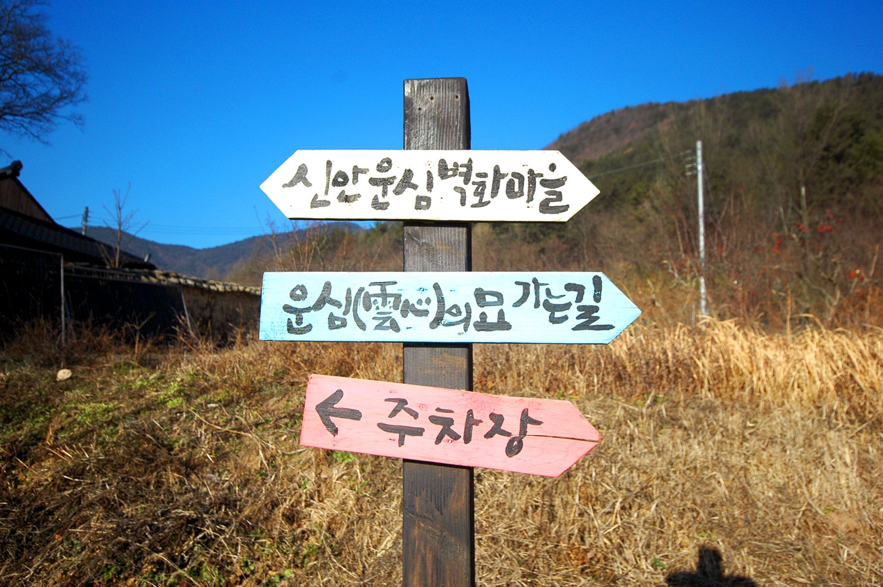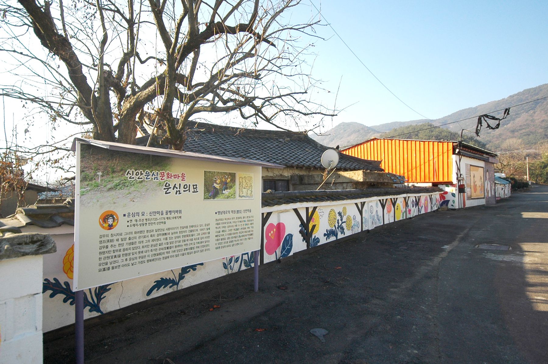 신안운심벽화마을과 주차장은 같은 방향으로 있고, 운심의 묘는 반대 방향에 위치하고 있습니다.