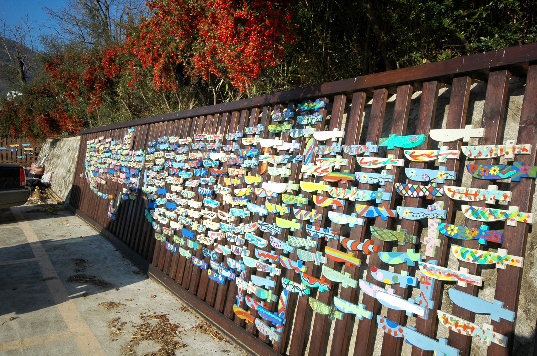 칼 모양과 꽃들이 화려하면서 독특한 모습으로 담장을 장식하고 있는 모습을 볼 수 있습니다.