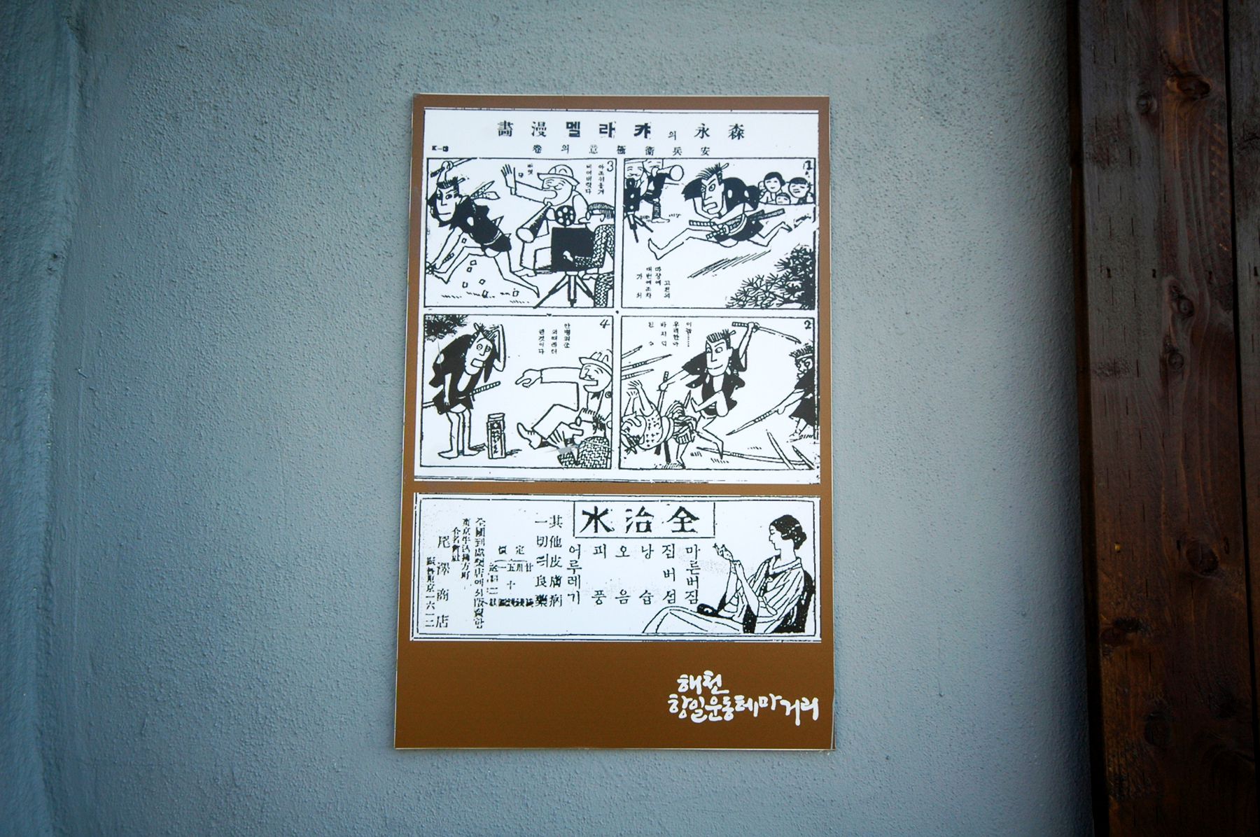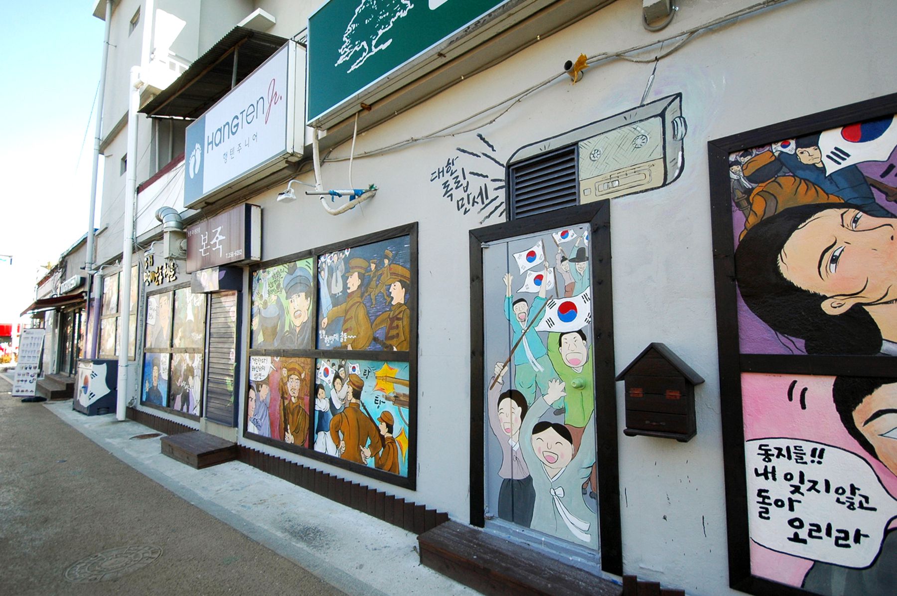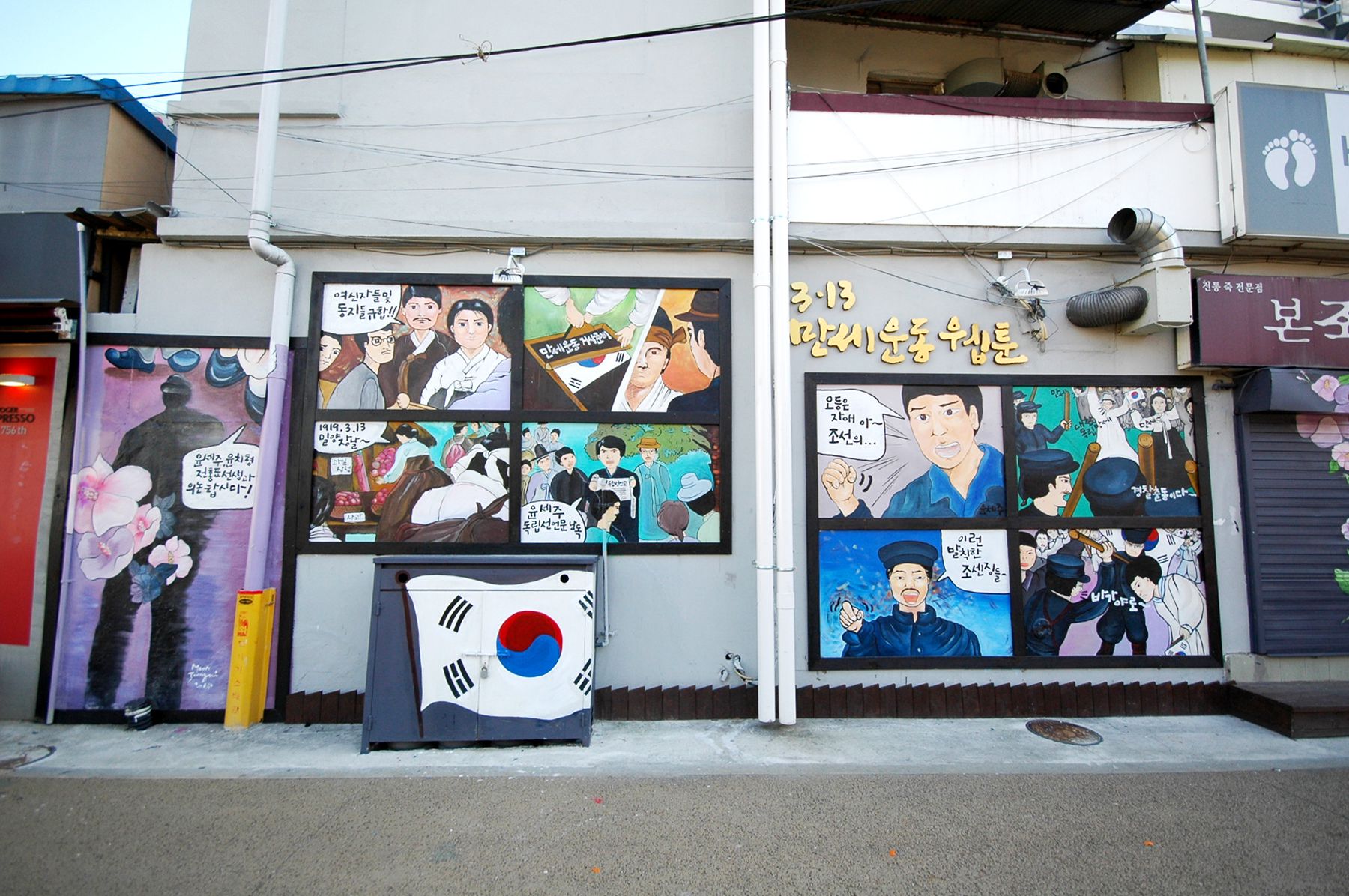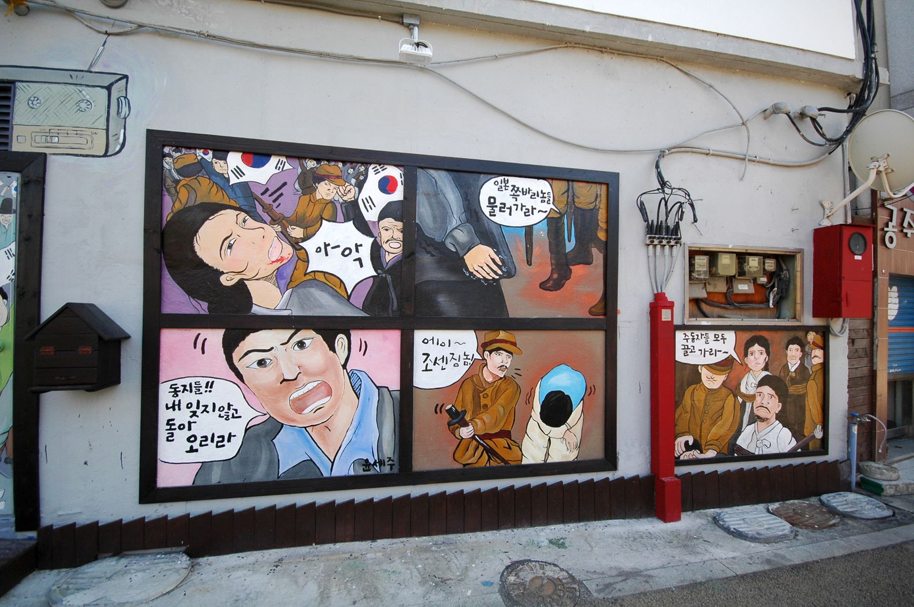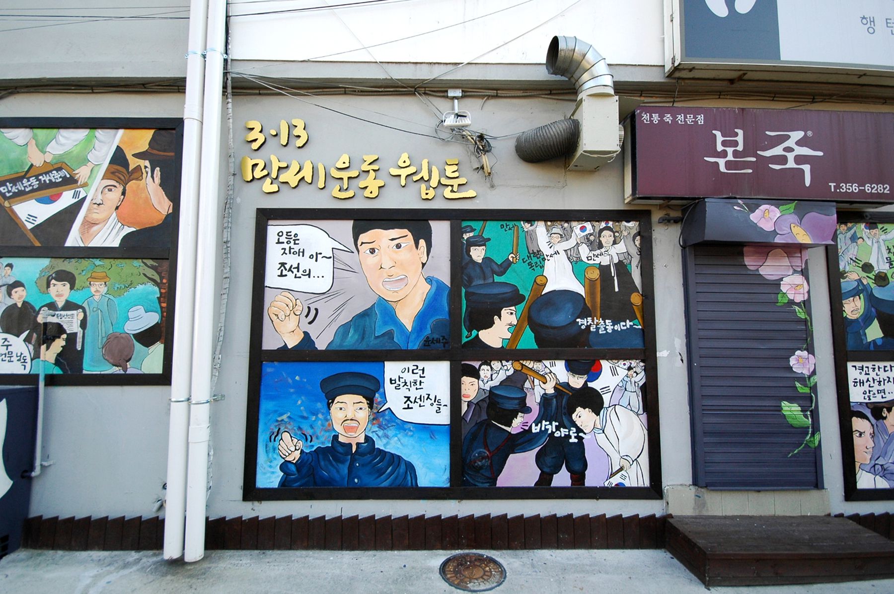 벽면을 따라 항일운동에 관한 내용의 웹툰이 벽화처럼 그러져 있습니다.
