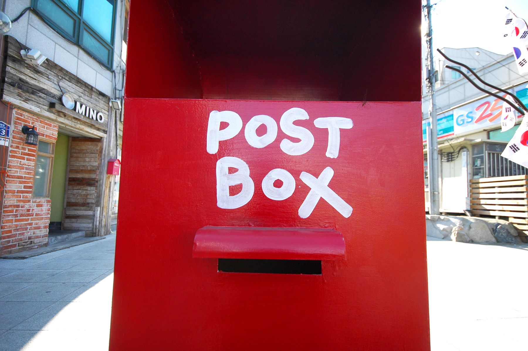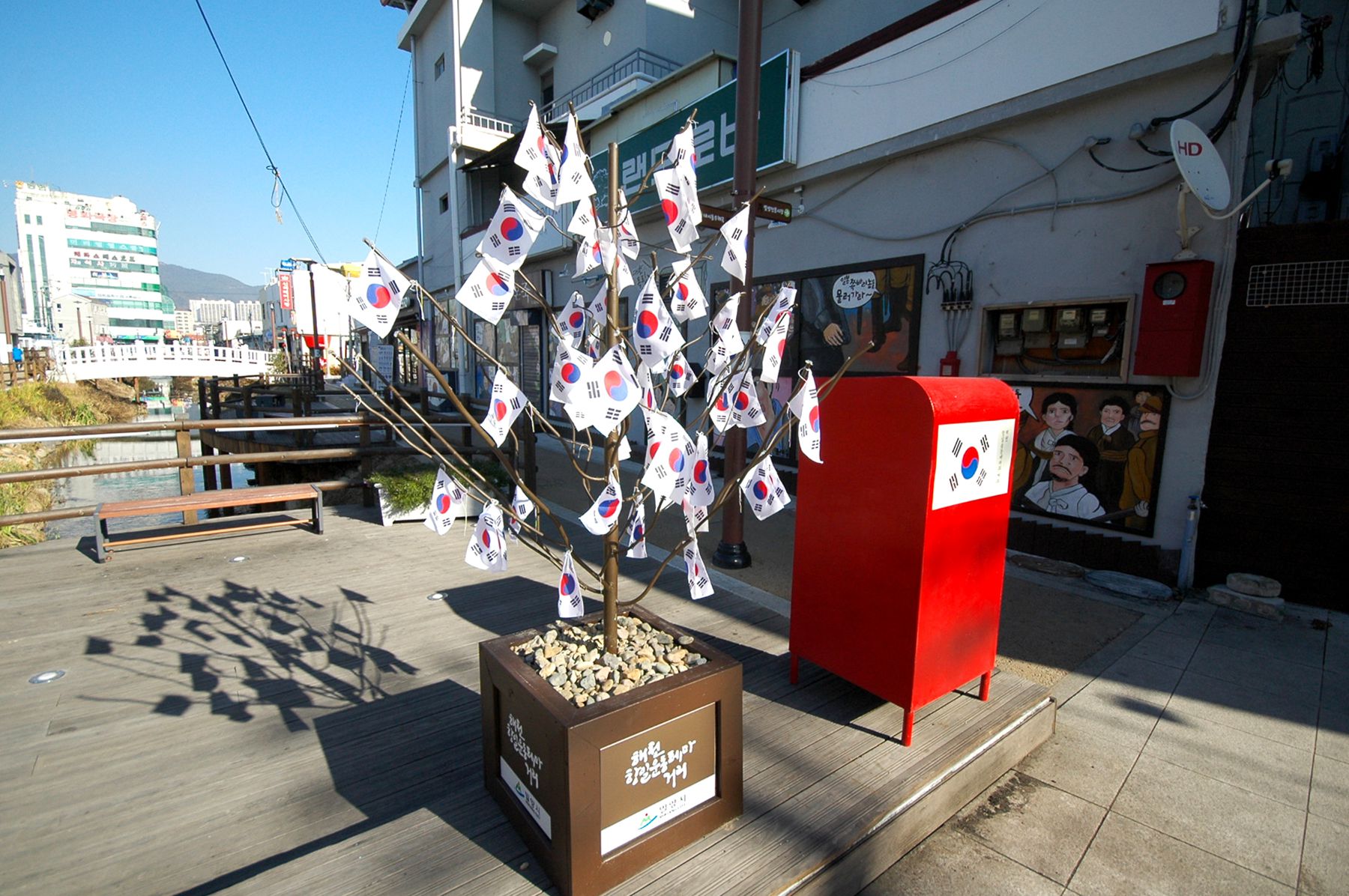 우리나라를 대표하는 것으로 가장 먼저 떠오르는 태극기가 가득한 나무 옆에는 빨간색 우체통이 자리하고 있습니다.