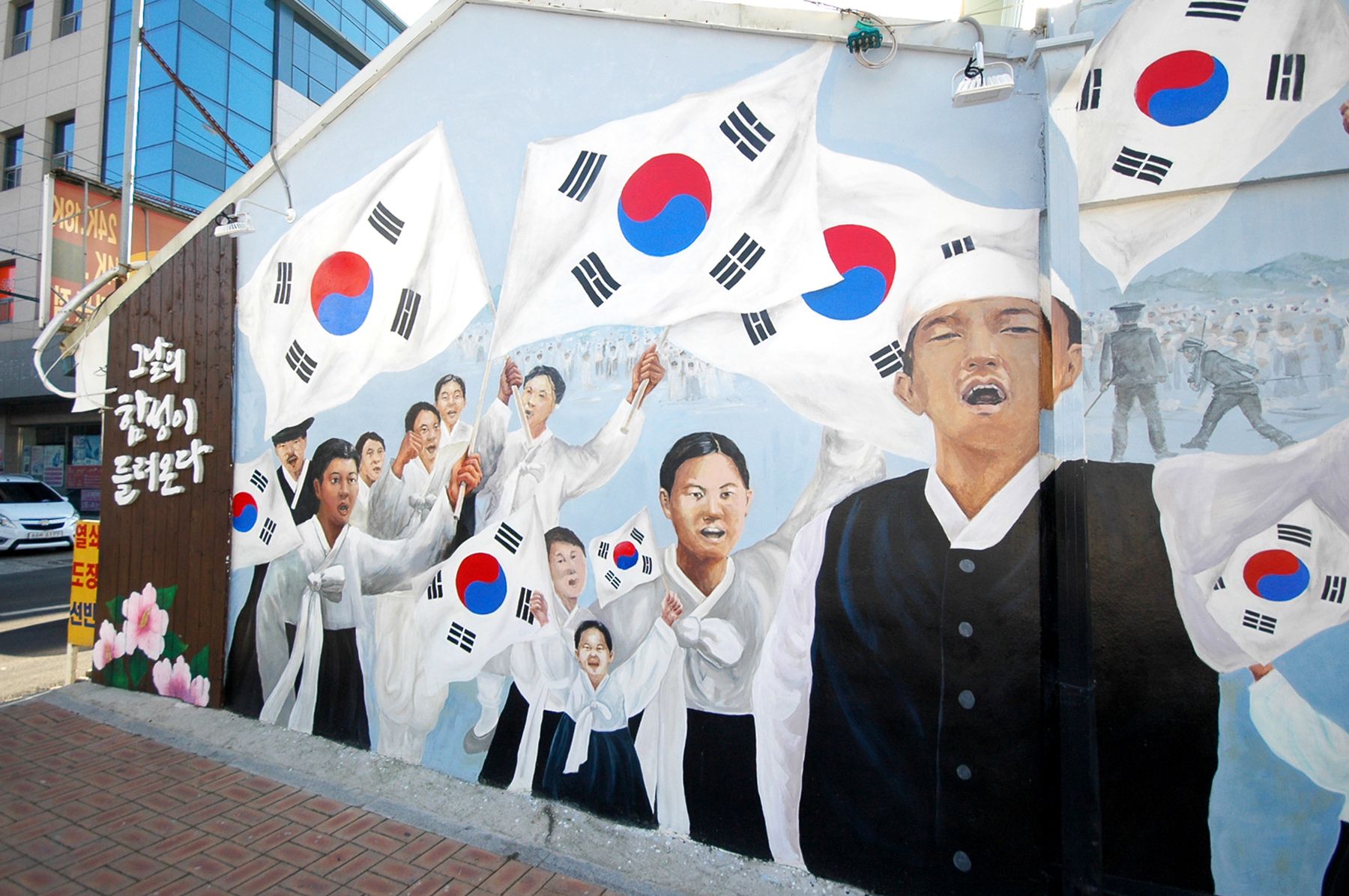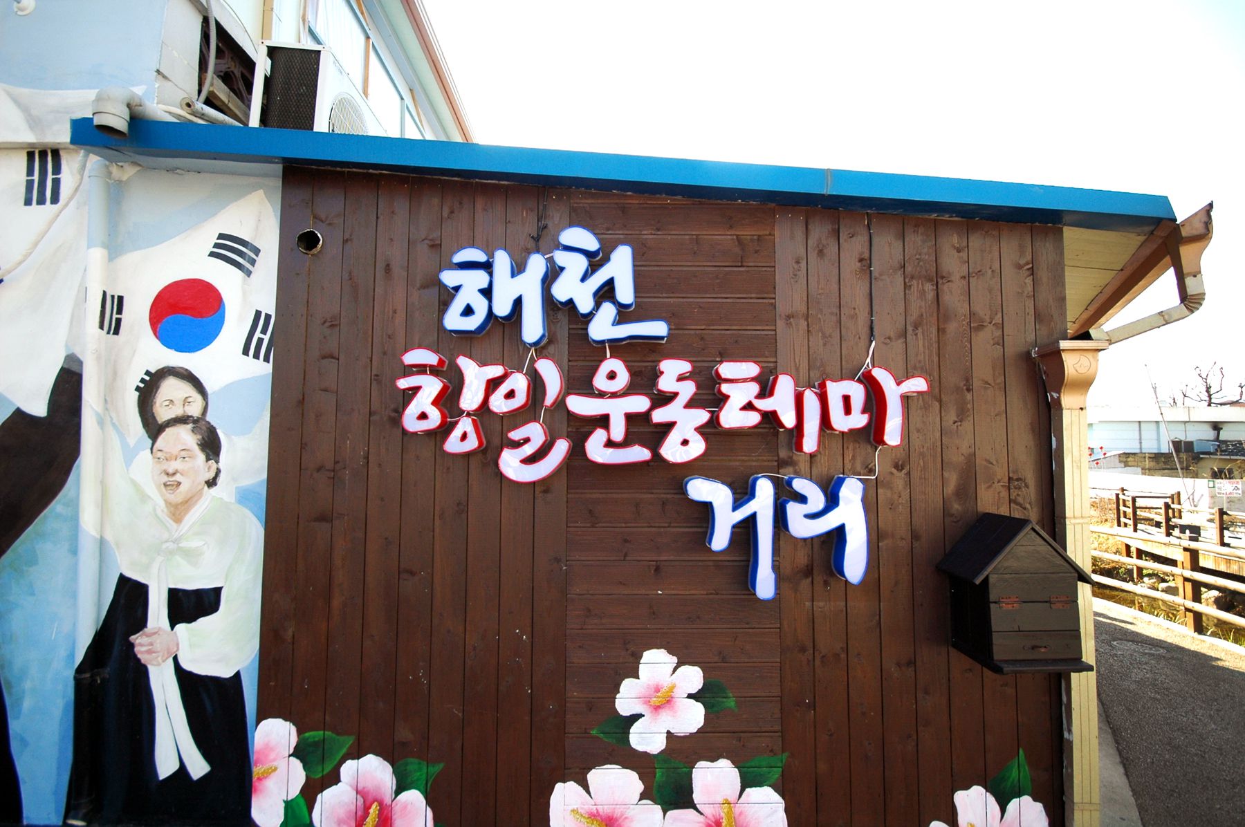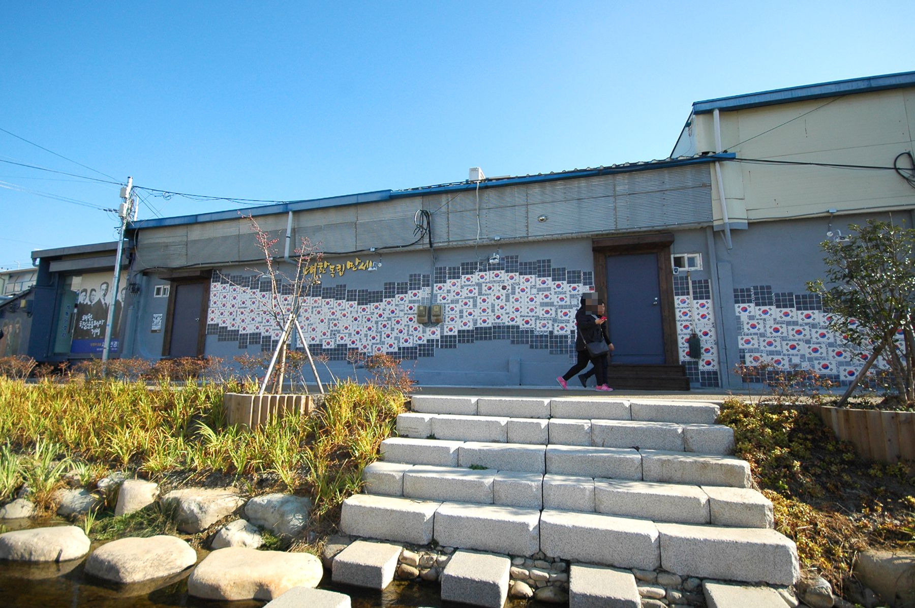 흐르는 하천에 놓여있는 징검다리를 건너면 태극기가 바람에 날리는 모습으로 그려져 있는 벽화도 감상하실 수 있습니다.