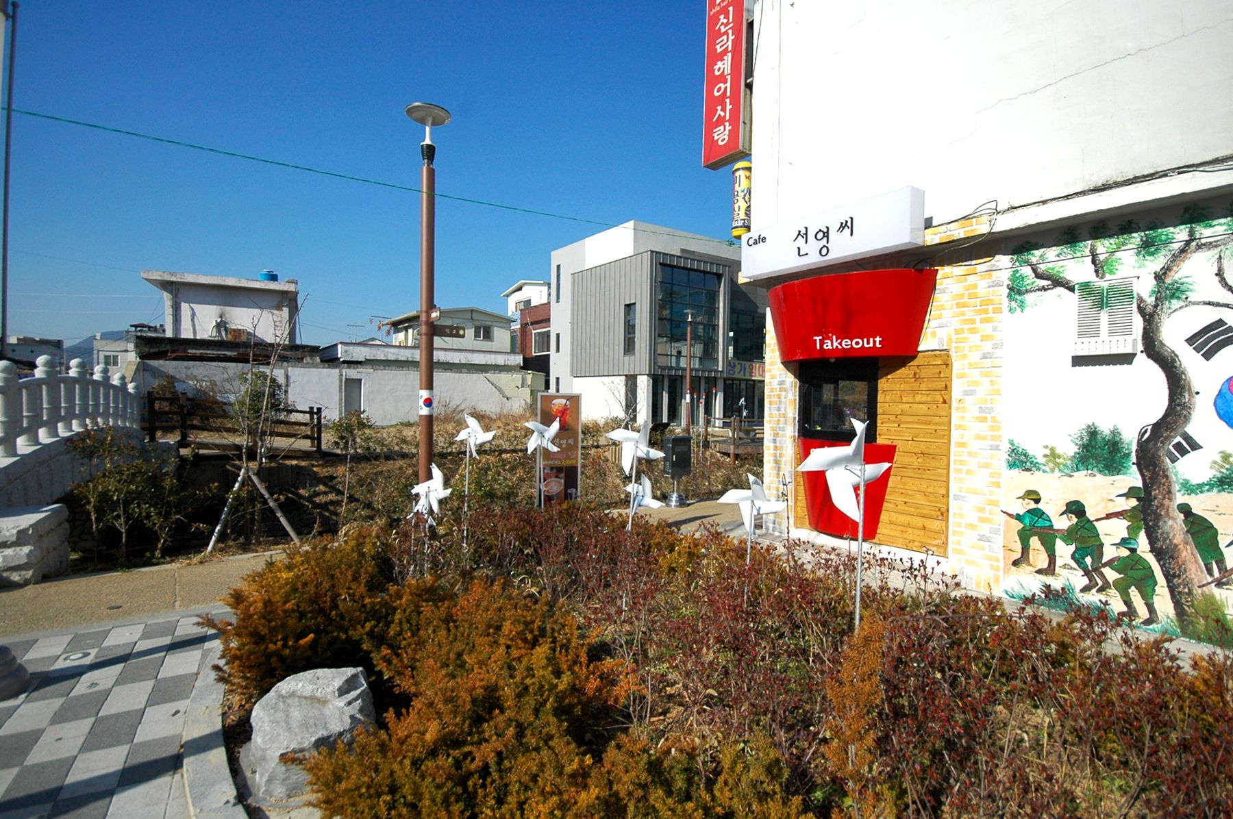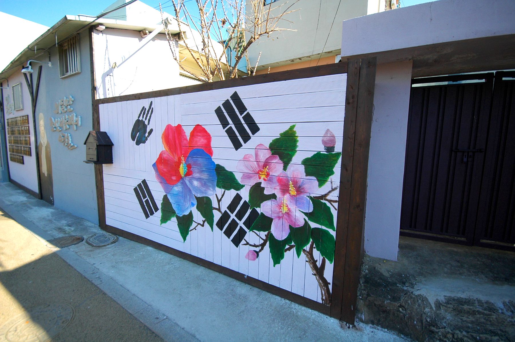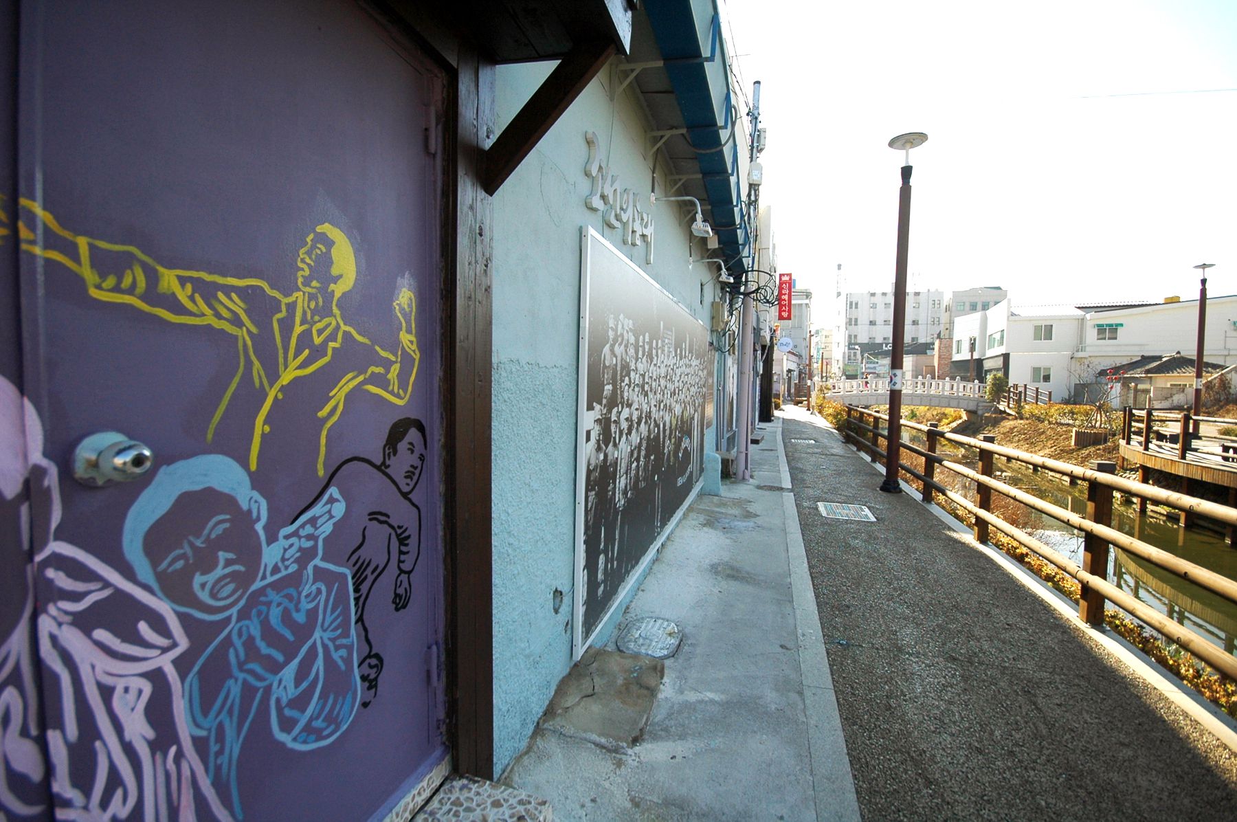 흐르는 하천에 놓여있는 징검다리를 건너면 태극기가 바람에 날리는 모습으로 그려져 있는 벽화도 감상하실 수 있습니다.