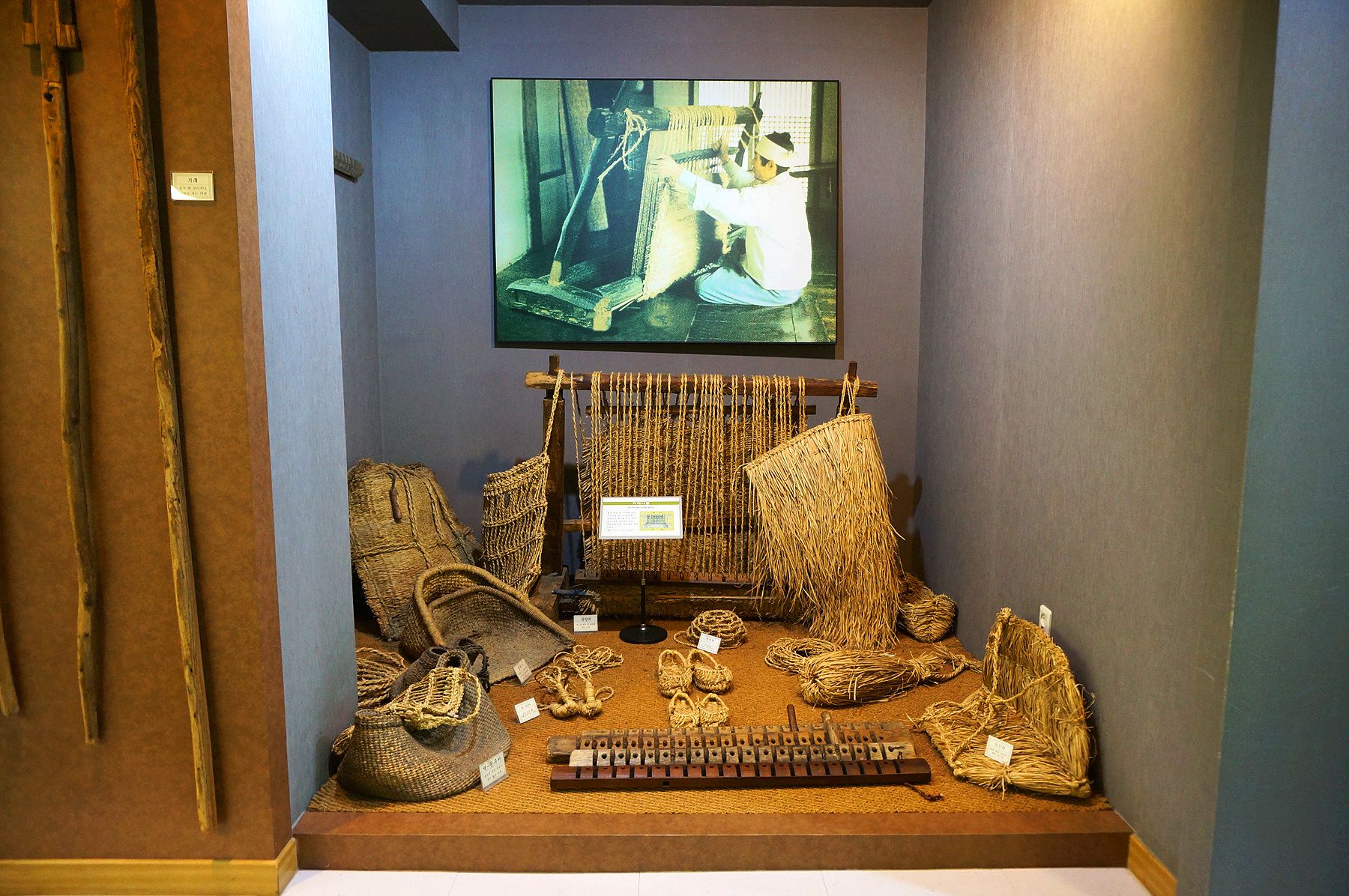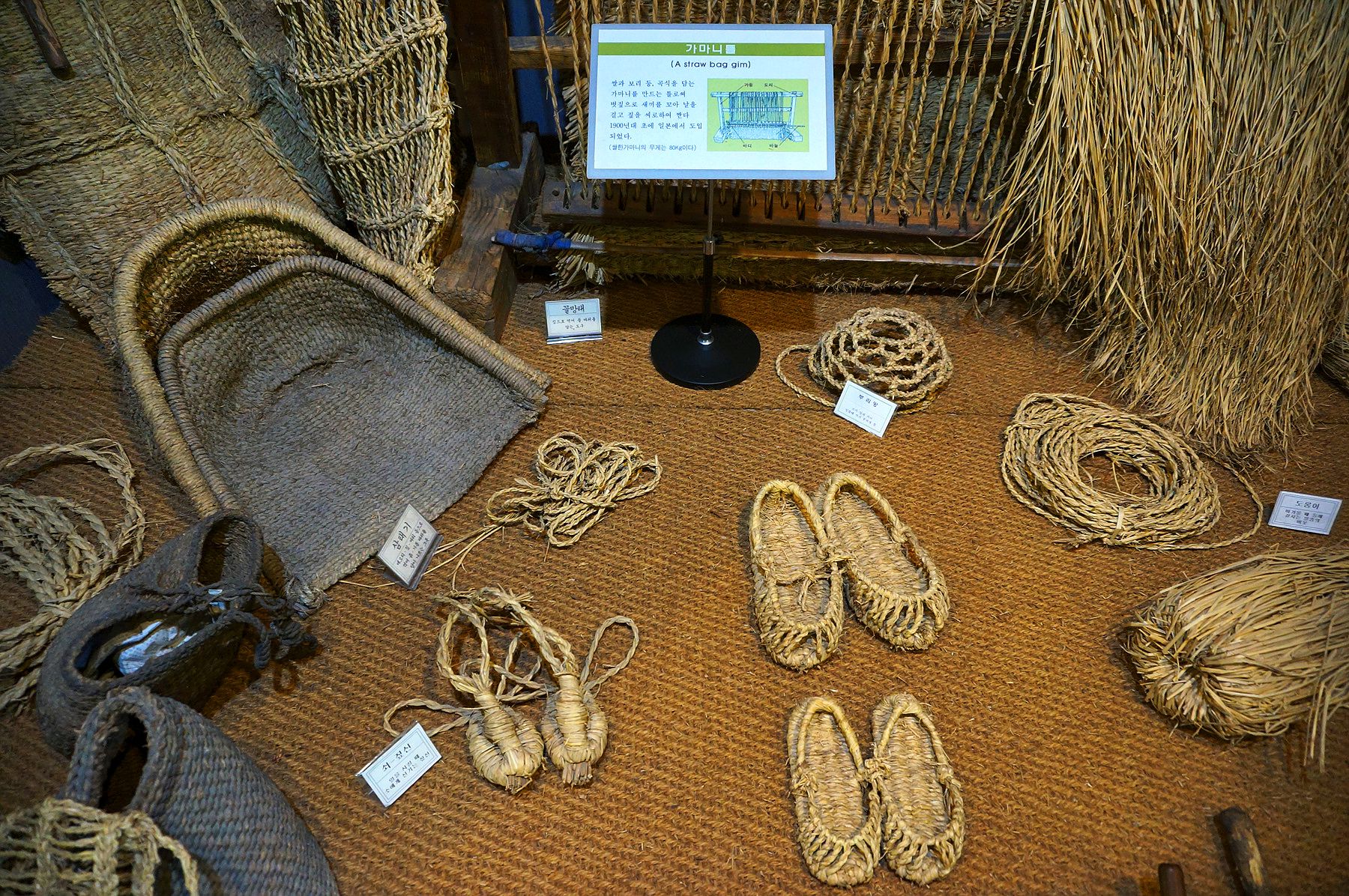 지푸라기를 이용한 짚신과 가마니 등 각종 생활도구들이 전시되어 있는데요,