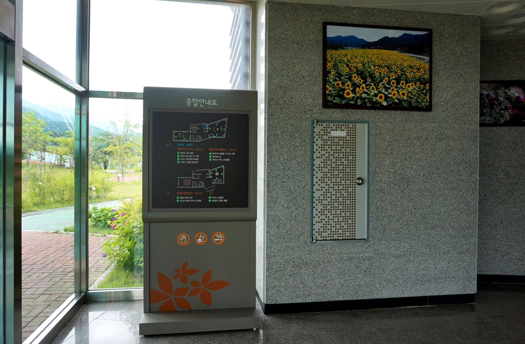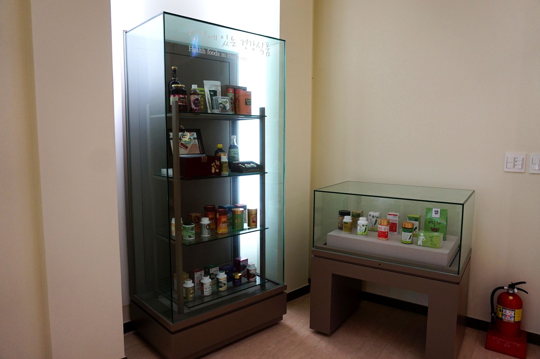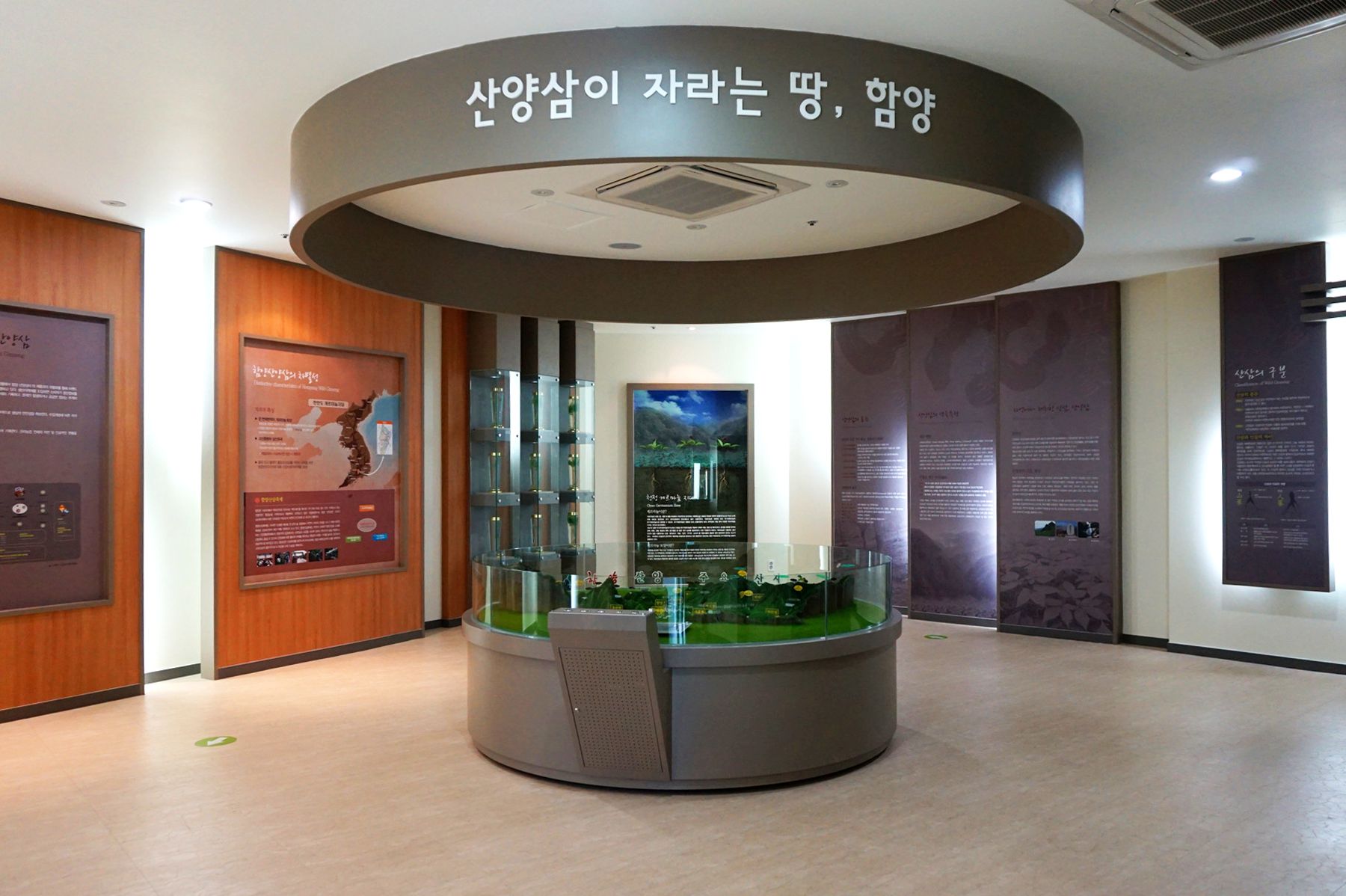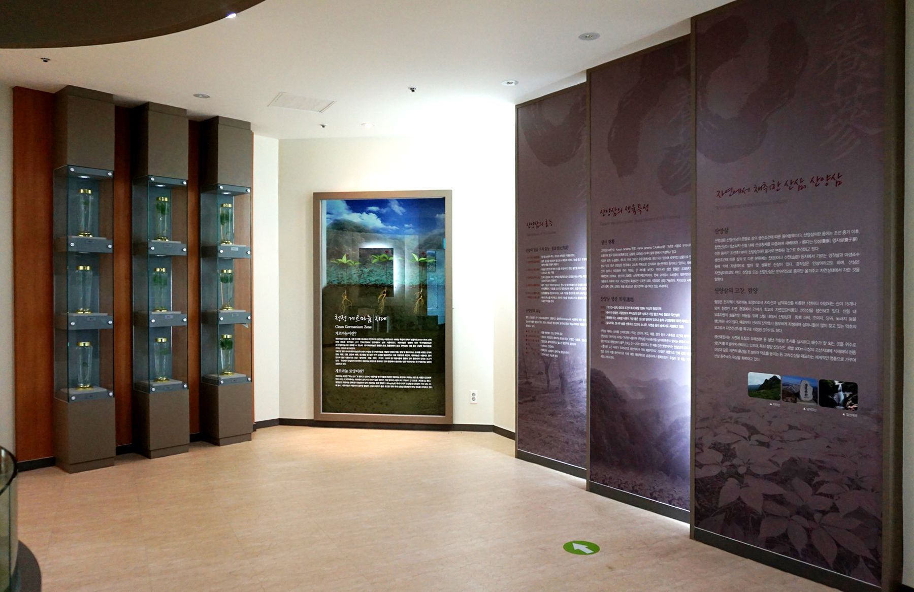 1층 전시실에서는 산삼에 대한 기본 정보 소개, 산삼의 어원, 산양삼의 생산방식, 먹는방법, 보관법 등을