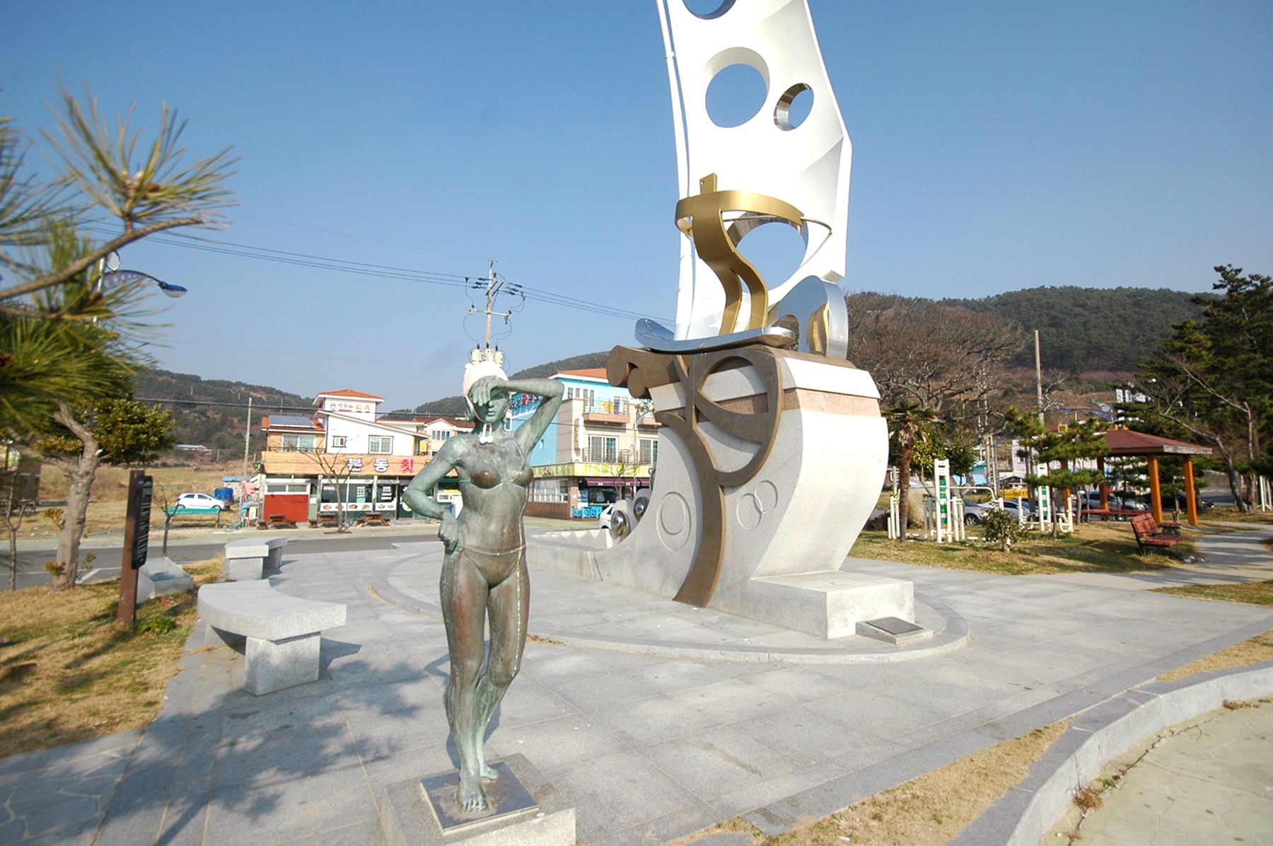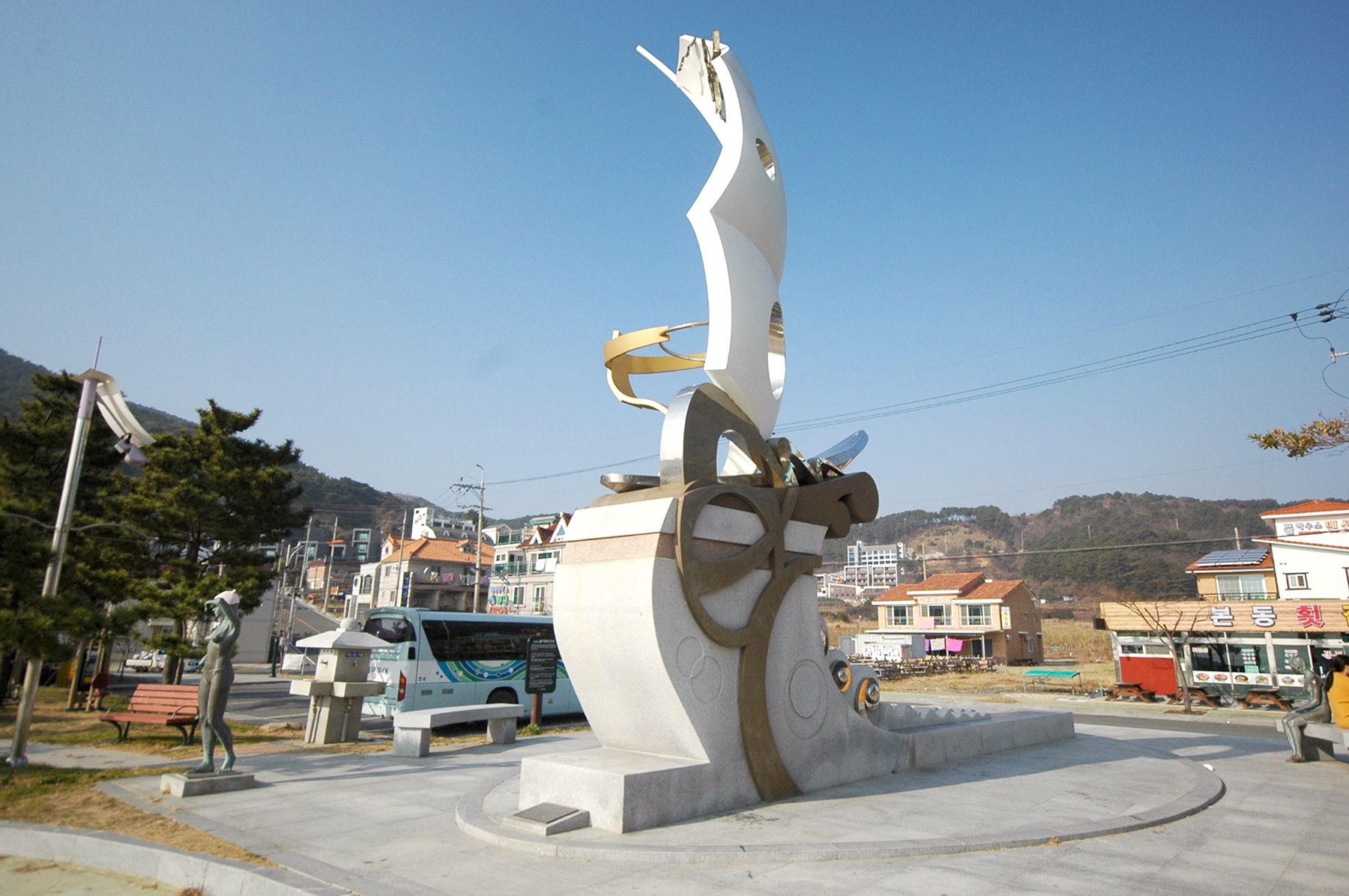 아담한 백사장, 푸른 바닷물과 마주보고 있는 윈드서핑하는 조형물은