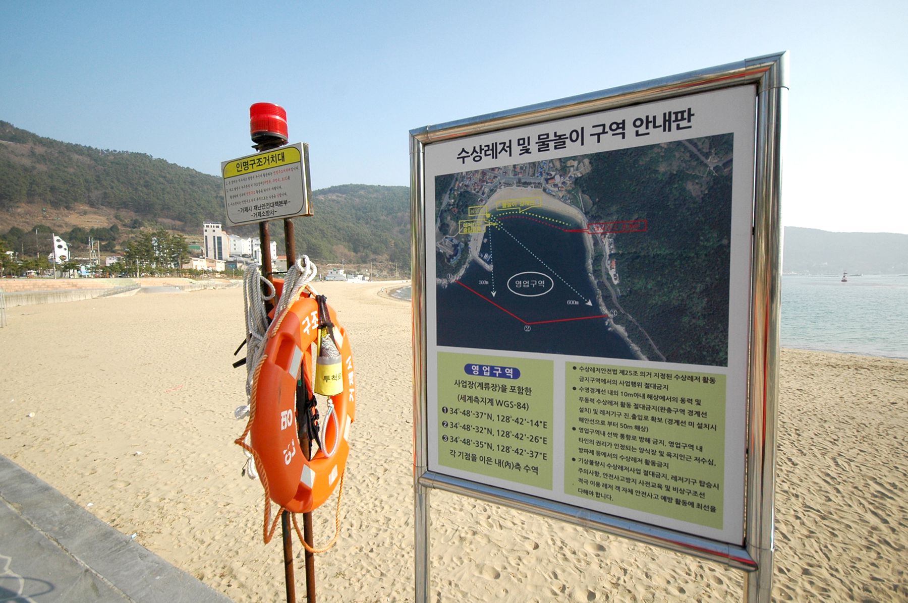 수상레저와 함께 물놀이를 즐기는 구역을 구분해놓았고, 안전사고를 방지하는 안내판이 설치되어 있습니다.